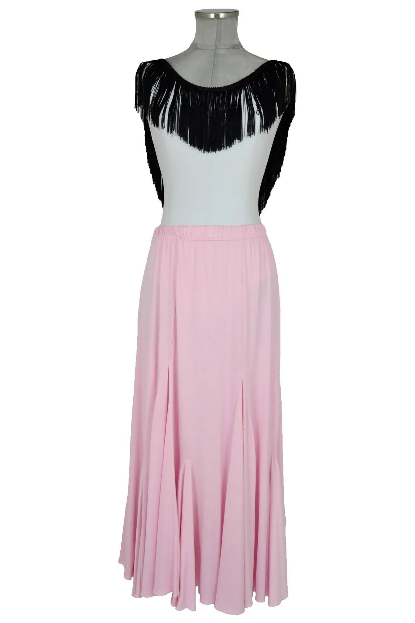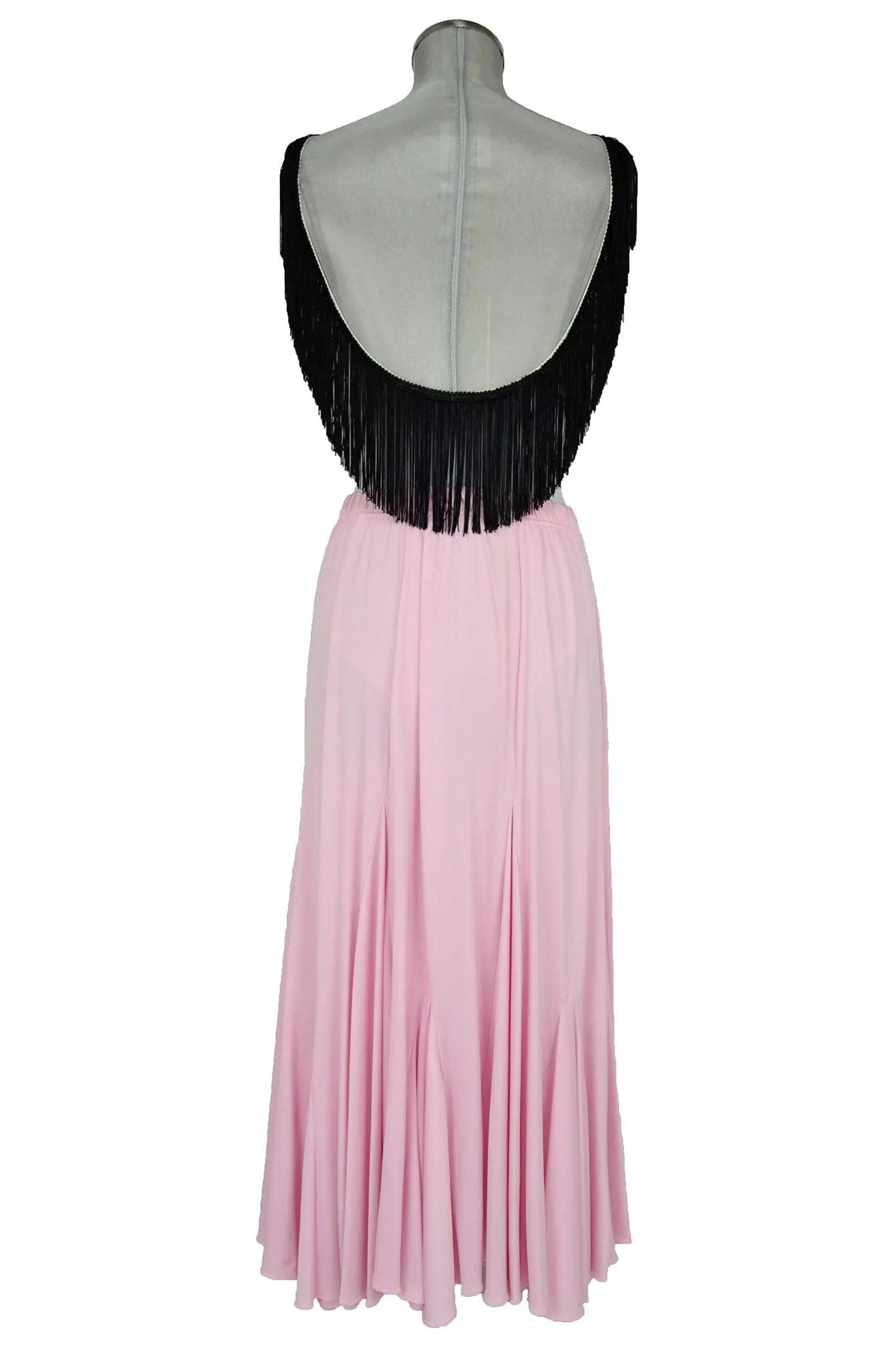 Noleggio abito donna con alta frangia nera a contrasto segue la scollatura di questo body creando un effetto a mantellina sul dietro; originale l'abbinamento con una gonna in colore del tutto diverso, con elastico in vita e movimentata da spicchiature a partire dal ginocchio. Costume di sapore moderno e insieme etnico.