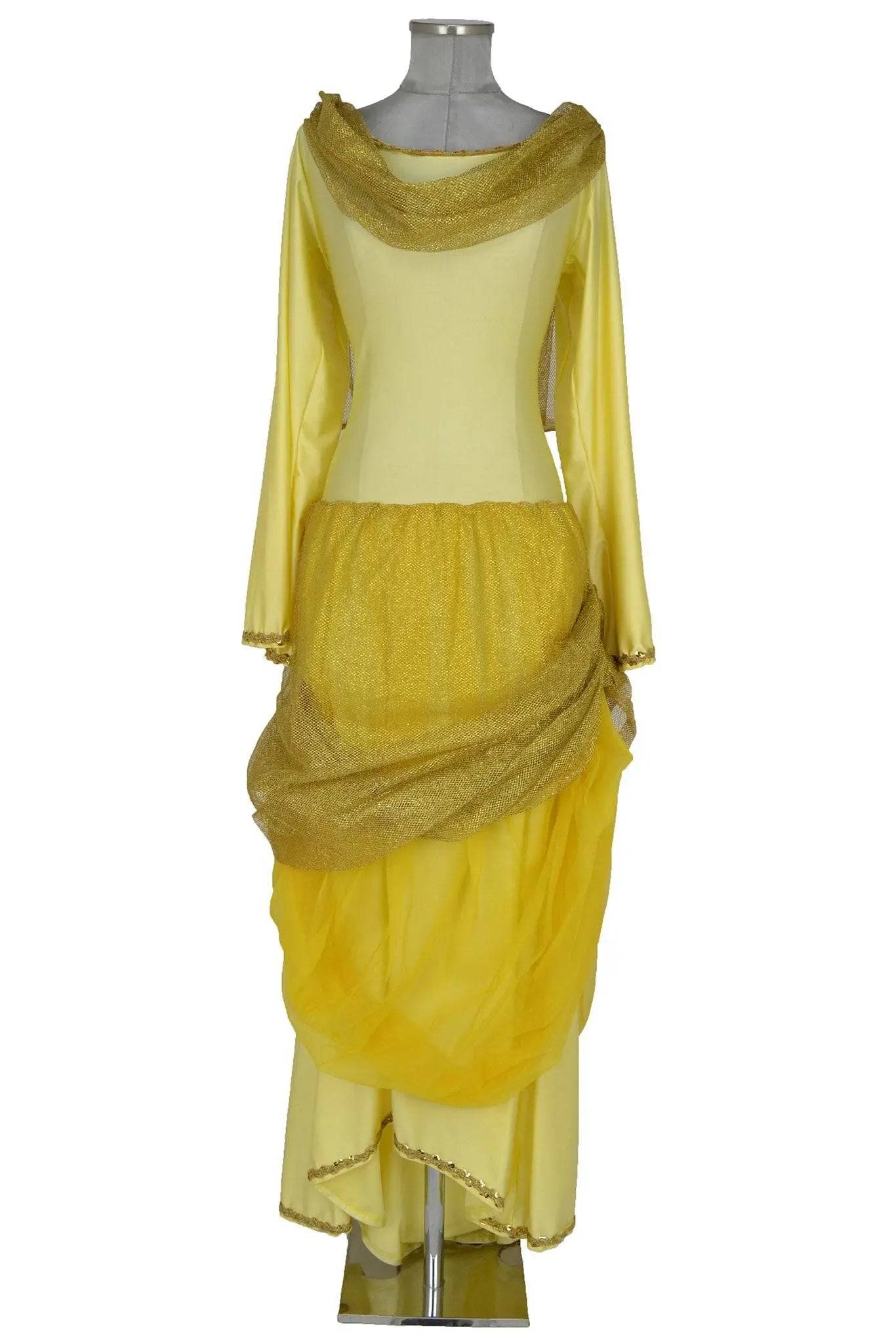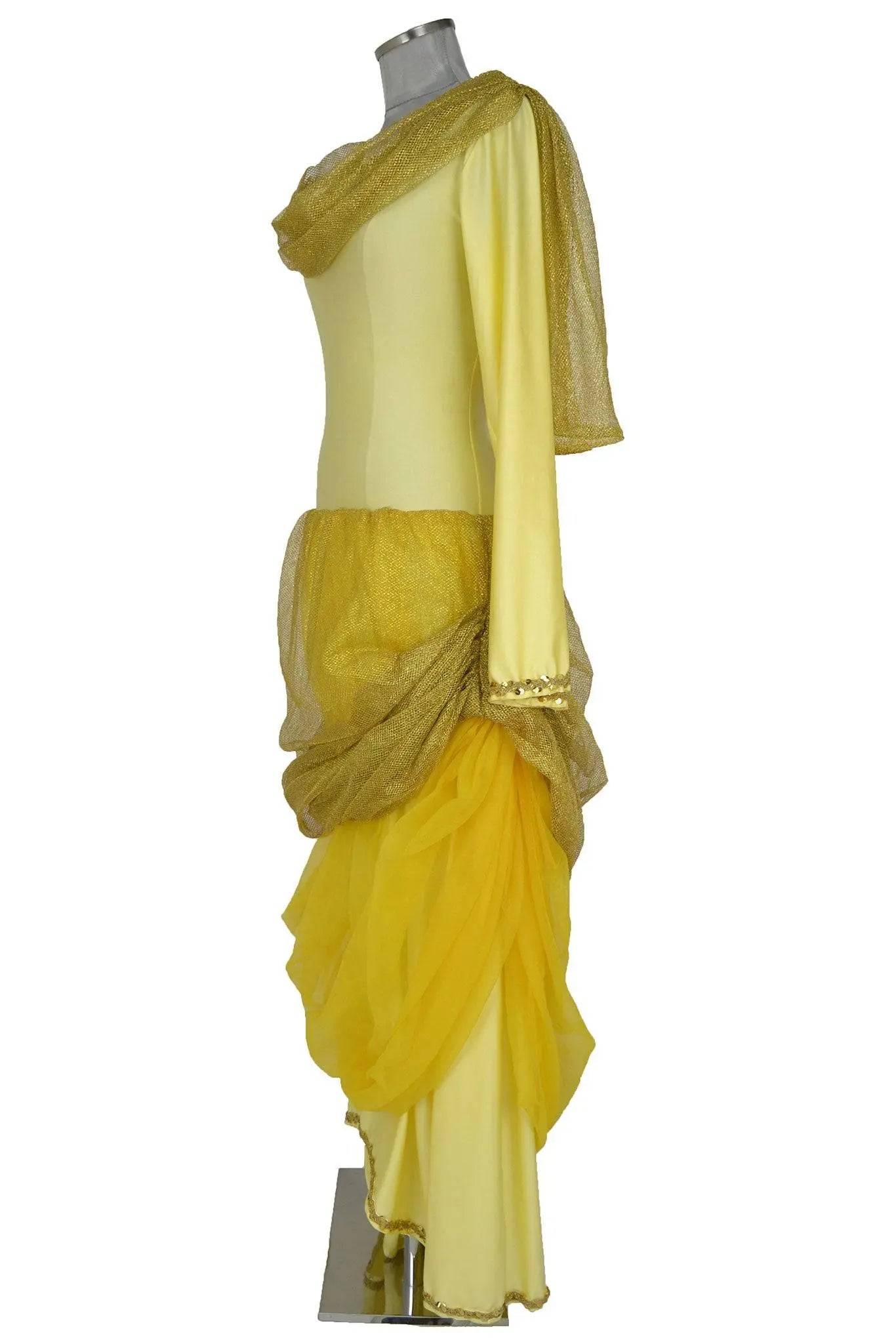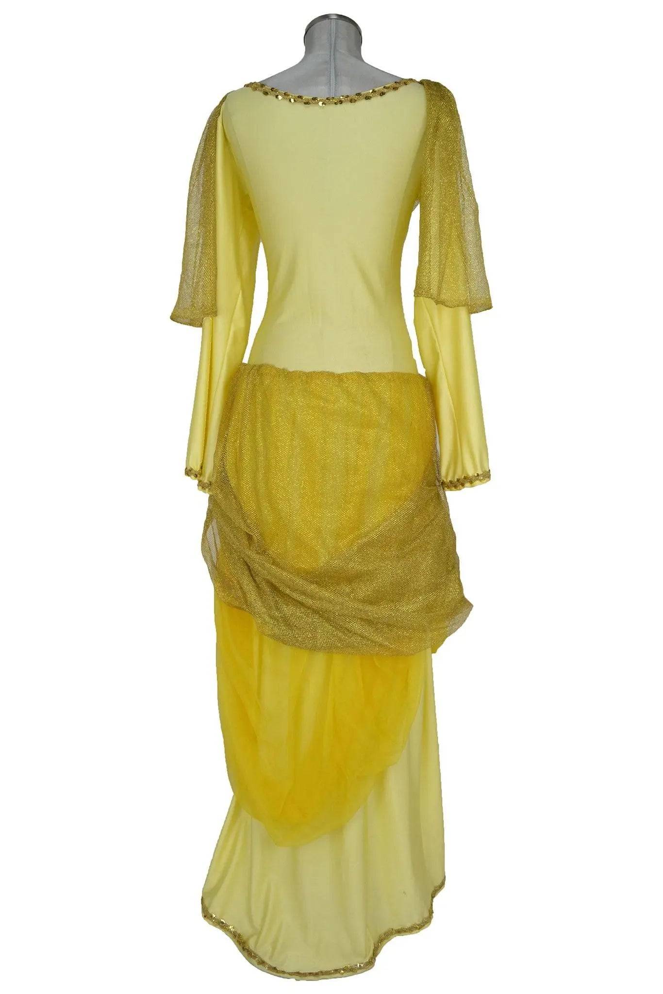 Noleggio costume fantasioso di carnevale donna in giallo e oro, adattabile a personaggi delle fiabe o leggende. Sulla base in lycra sono applicate maniche leggermente scampanate a bordure oro (riprese sullo scollo e all'orlo della gonna lunga e non molto ampia), e drappeggi in chiffon giallo intenso e in velo oro.