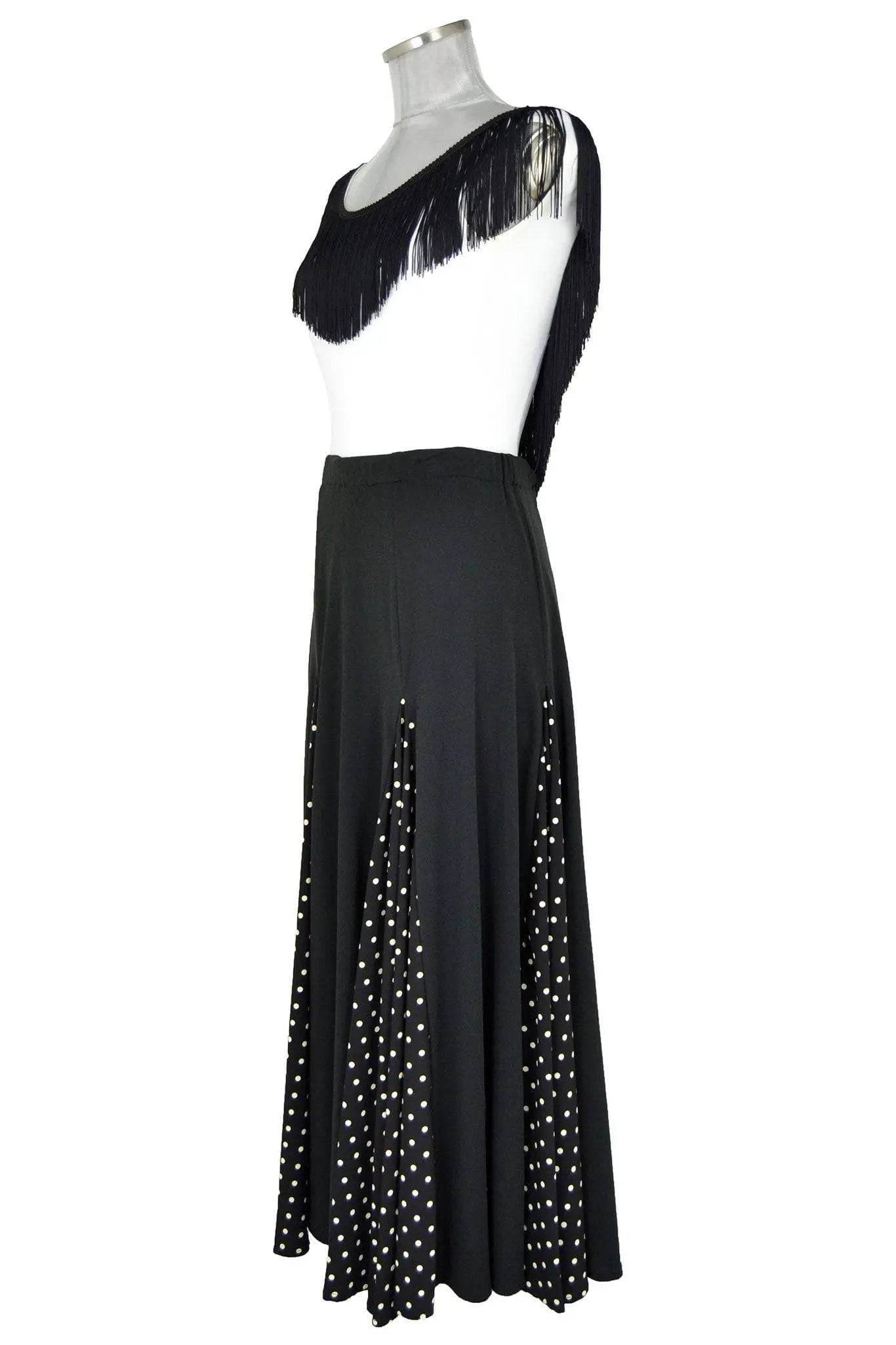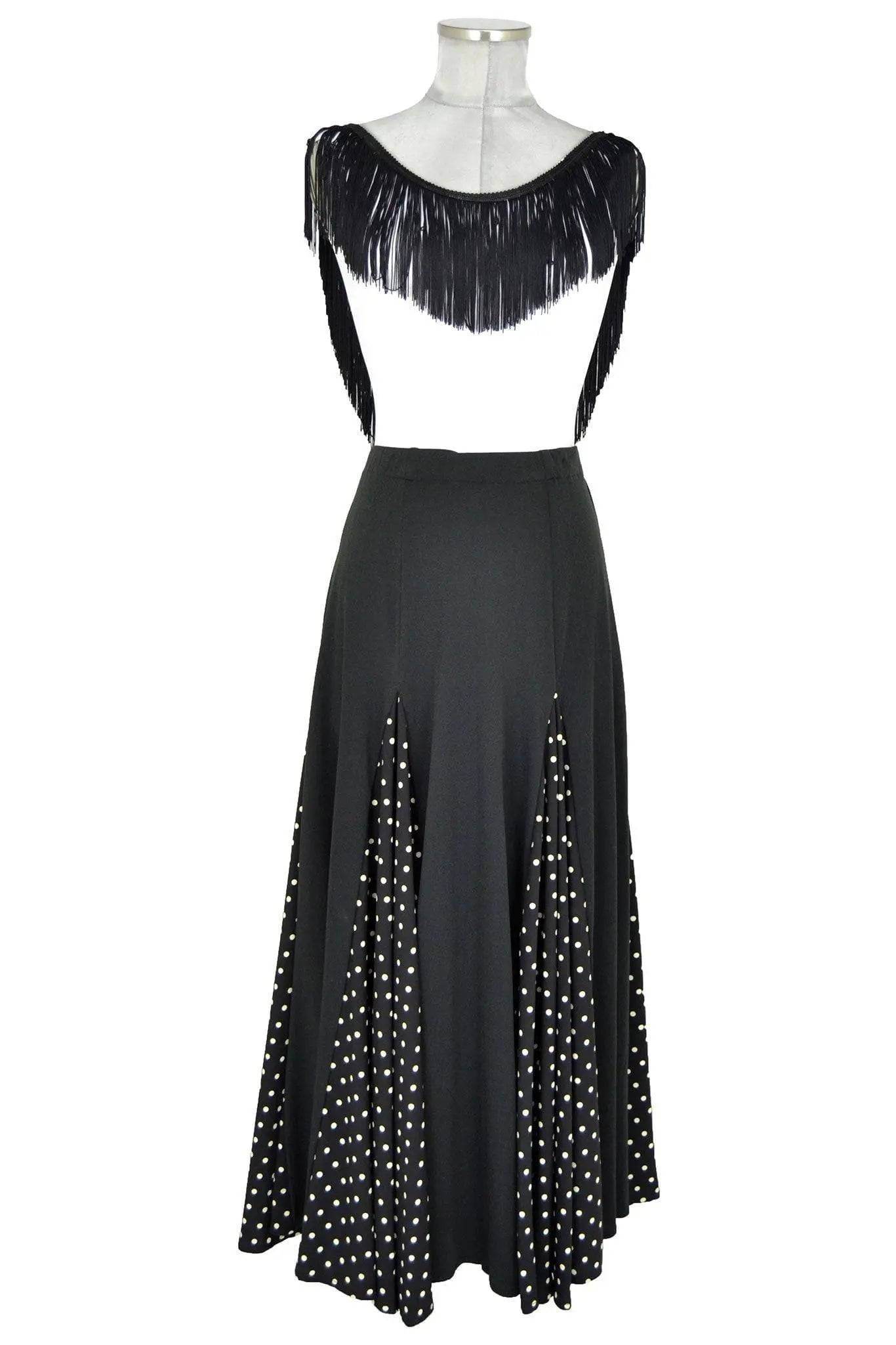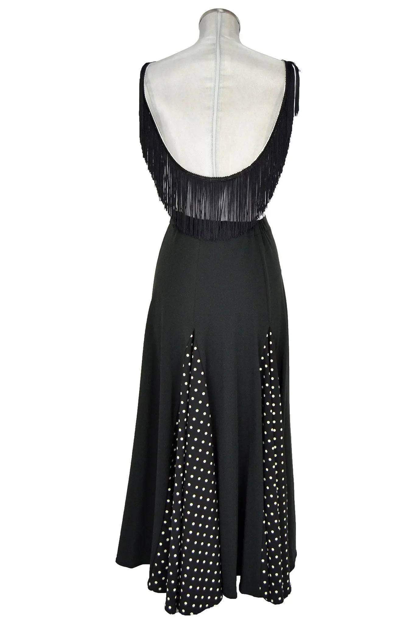 Un gioco di alternanze di bianco e di nero, di tinta unita e stampato, per questo costume spagnolo lineare ma d'effetto. La gonna in lycra nera a pannelli sciolti è movimentata da grandi spicchi a pois, mentre il body dallo scollo più ampio dietro si caratterizza per la frangia a cascata.