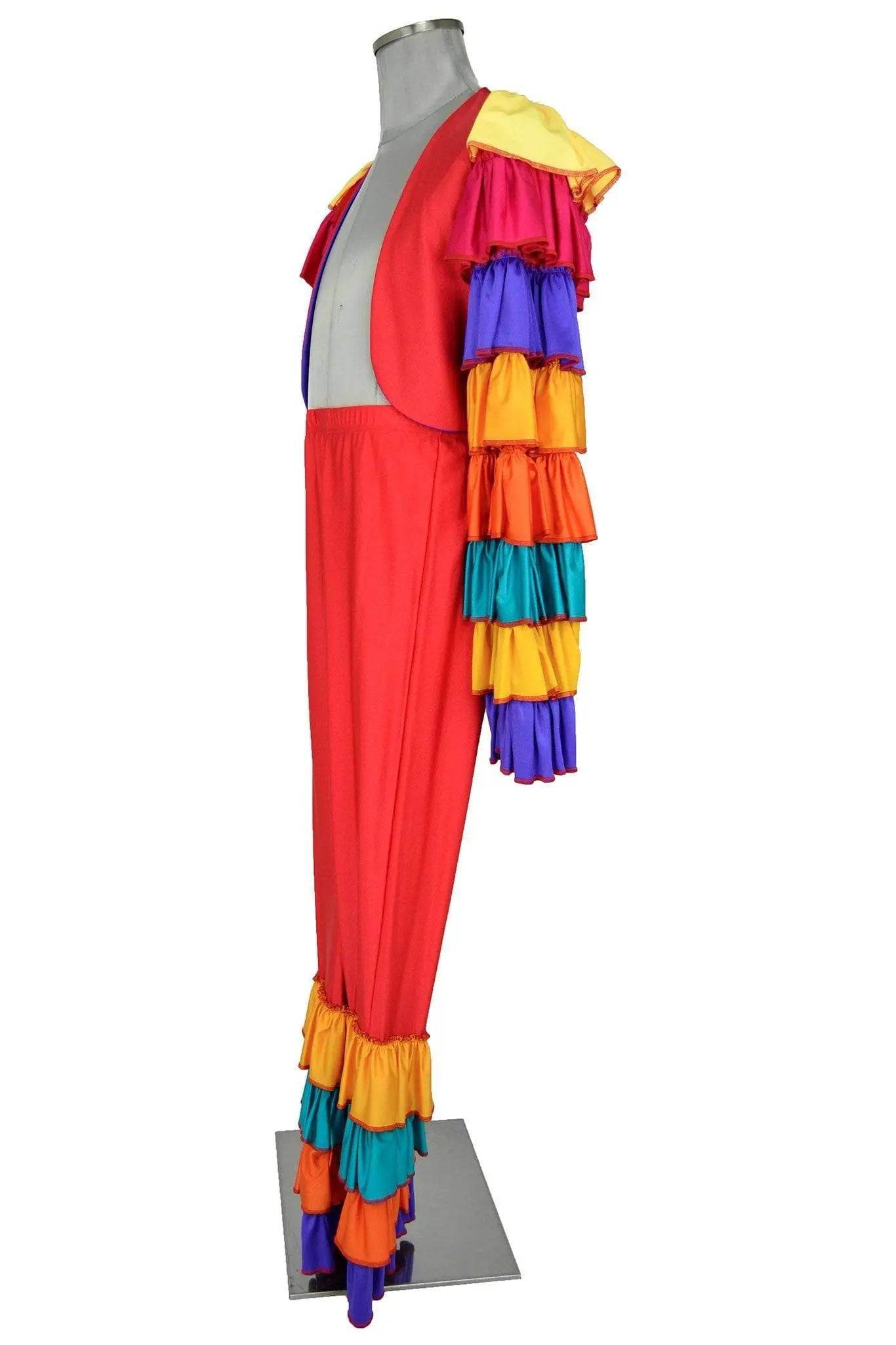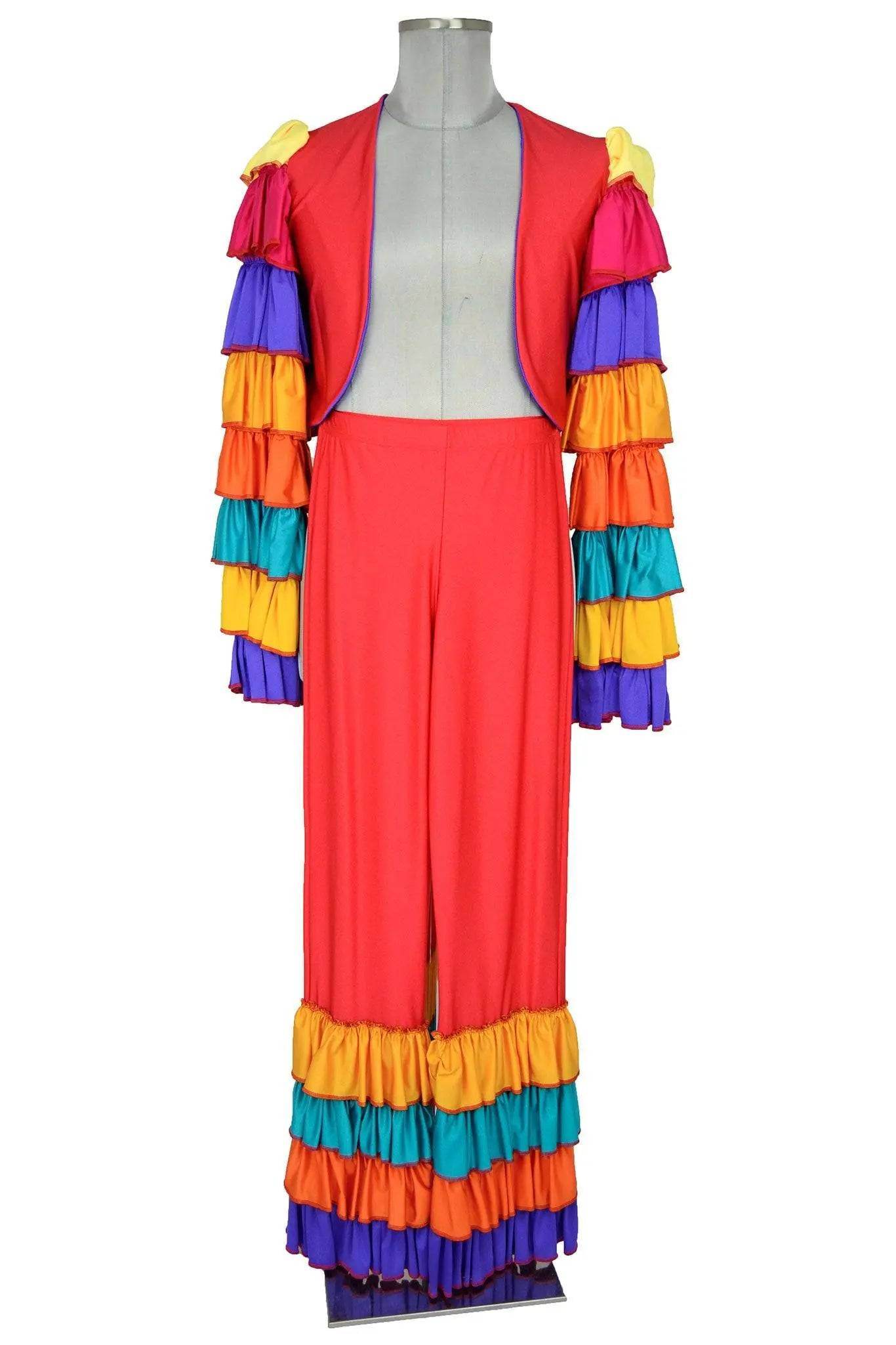 Costume maschile da ballerino di samba e altri balli sudamericani, per feste e sfilate in stile Carnevale di Rio. Da indossare preferibilmente a torso nudo, si compone di calzoni lunghi e corto bolero stondato in morbida lycra, con maniche e bordure a balze di volant multicolori.