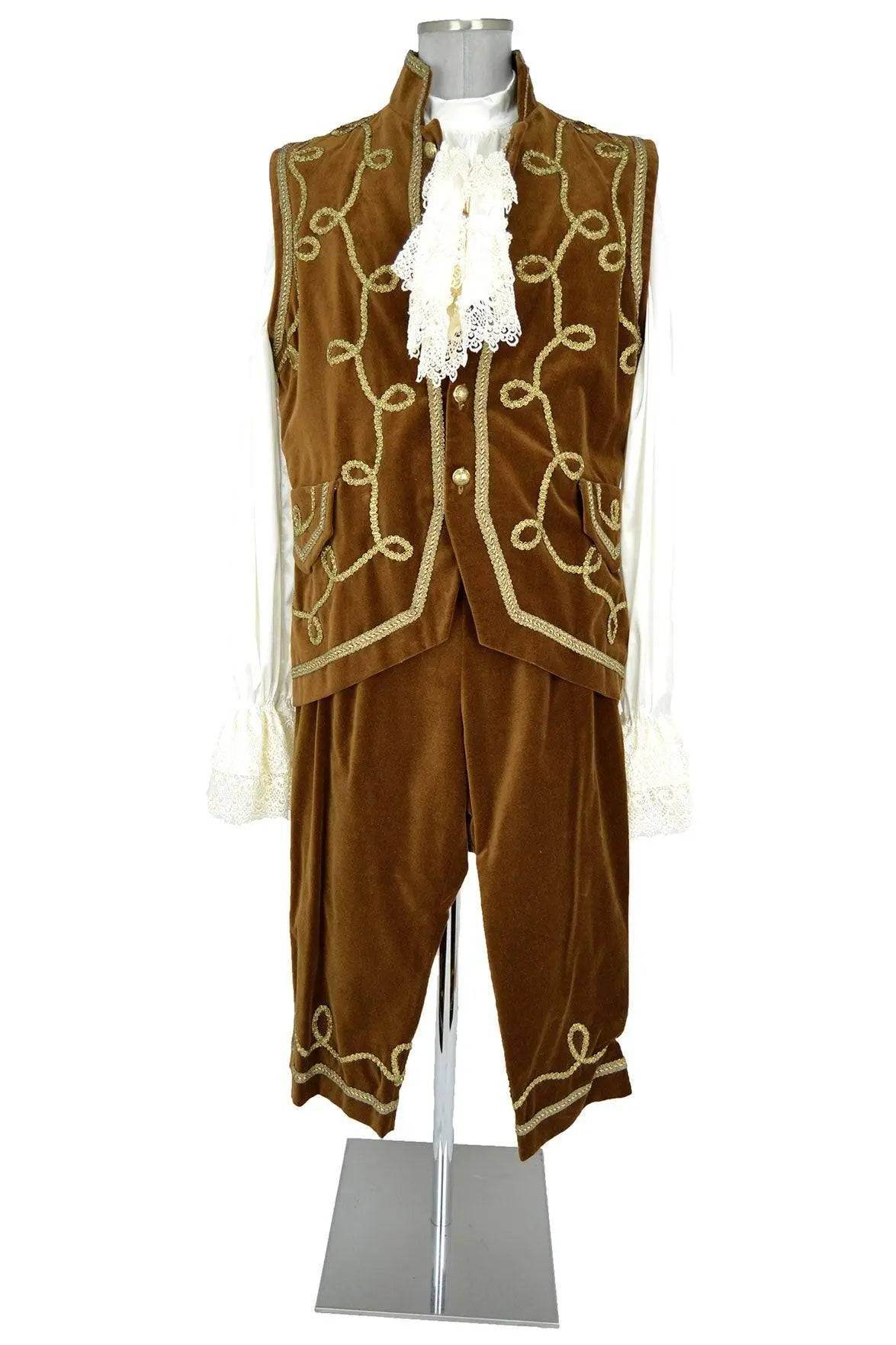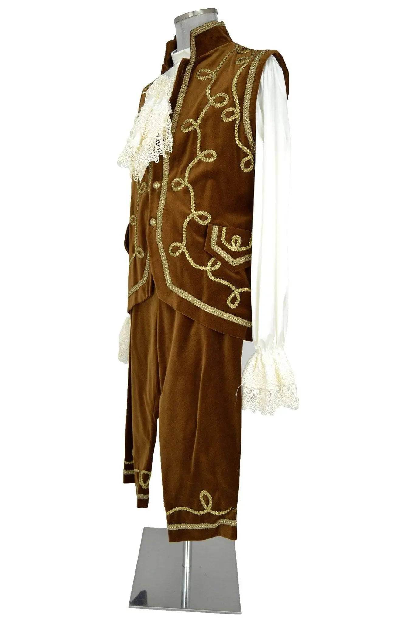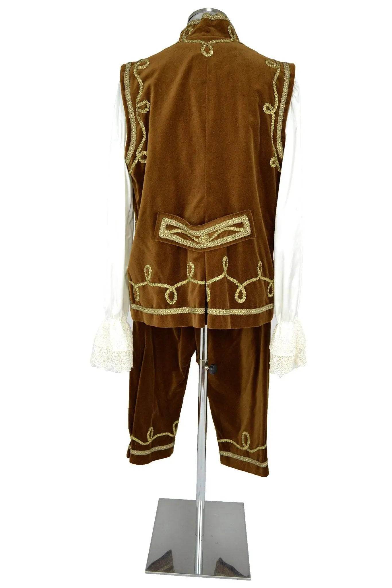 Sontuoso costume settecentesco per nobiluomo o politico o valletto di una gran casata, composto da tre pezzi: camicia bianca con polsi e jabot di merletto, calzoni e lungo gilet in velluto ocra con bordure e arabeschi dorati in passamaneria, bottoni dorati, colletto rigido e finte tasche a patella.