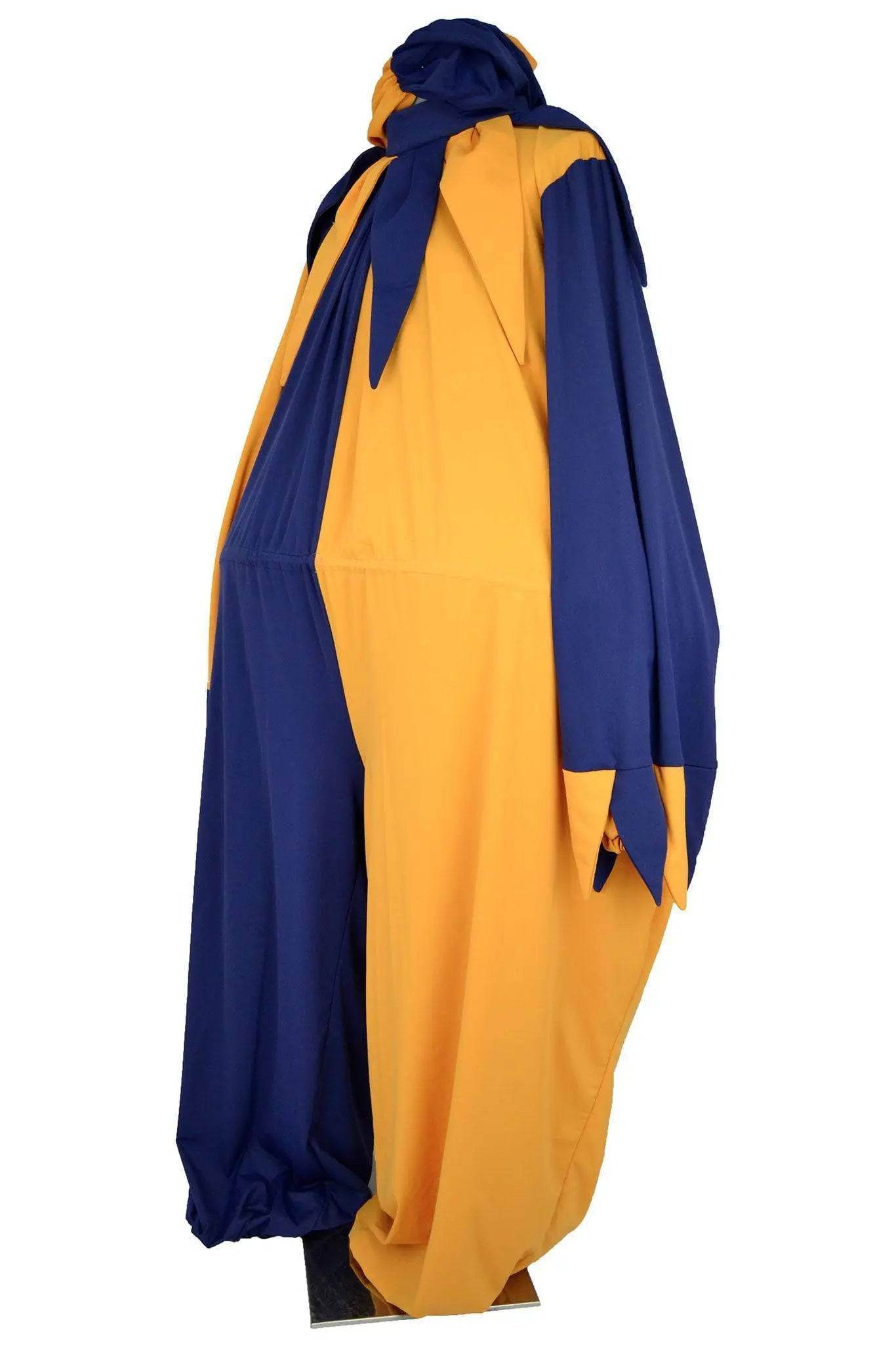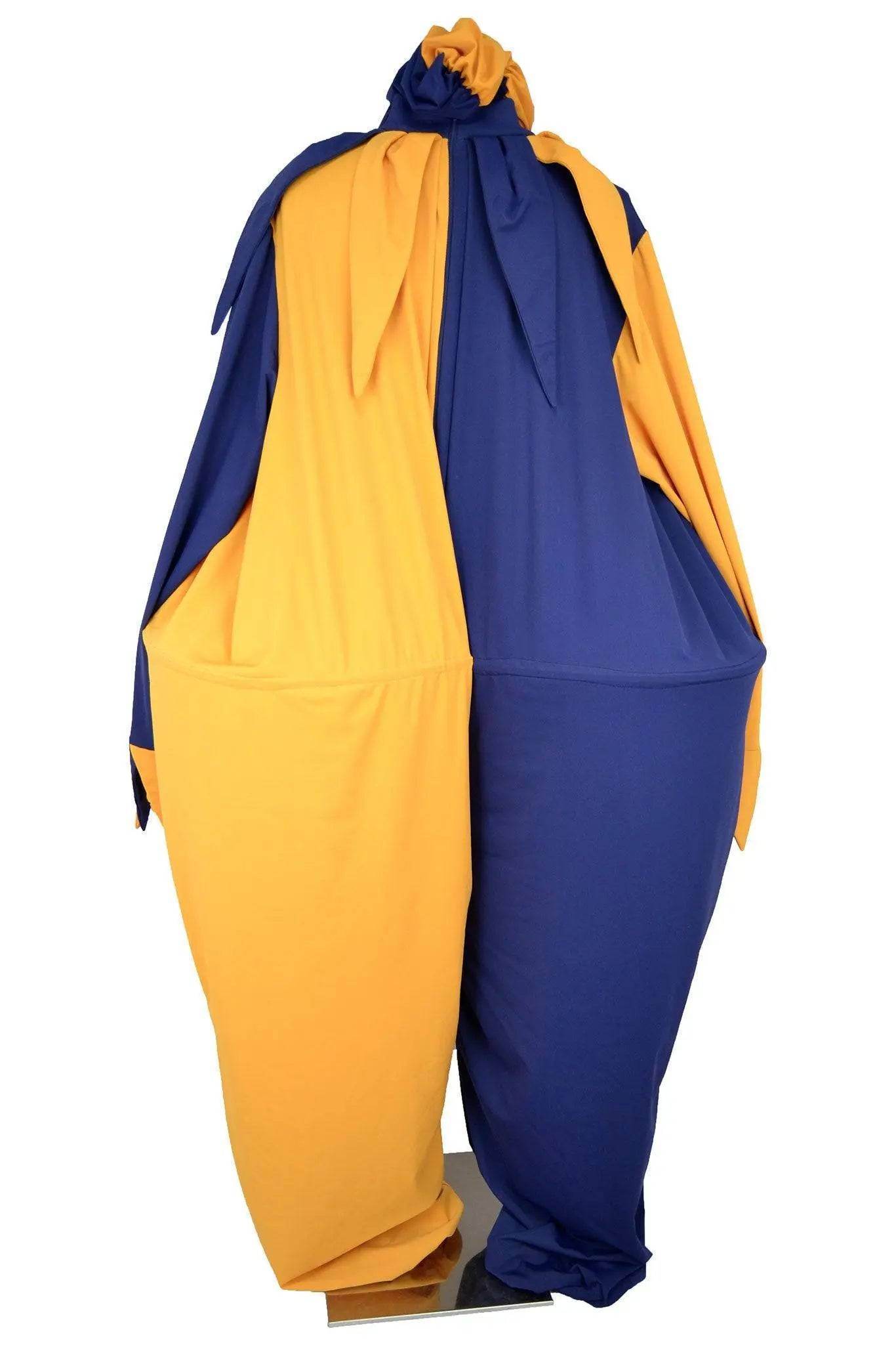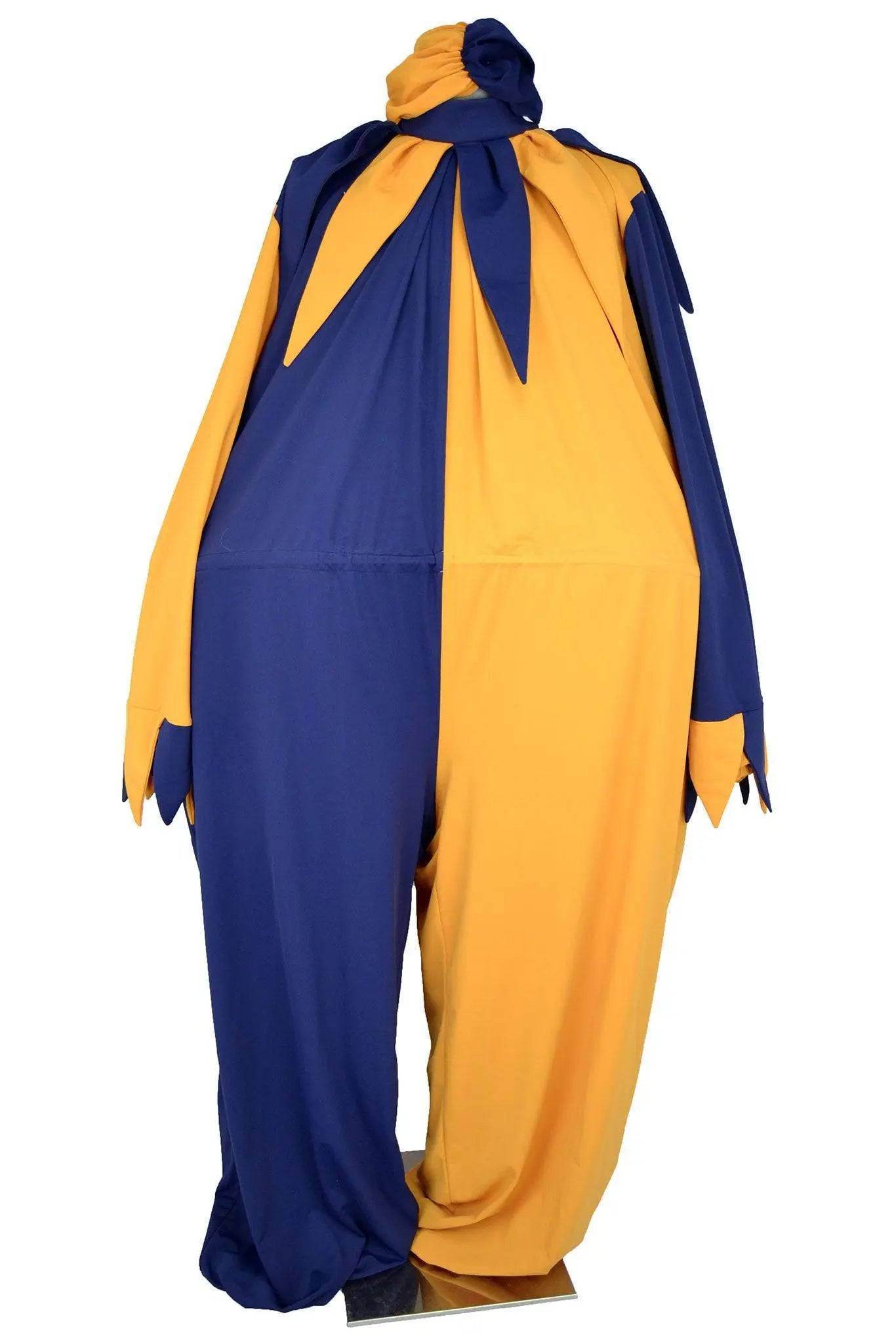 Realizzato in tessuto leggero e confortevole, il Noleggio costume clown uomo blu e giallo garantisce una grande libertà di movimento, grazie alla sua struttura ampia che si adatta facilmente a diverse taglie. Il design bicolore, diviso perfettamente a metà tra il blu notte e il giallo vivace, crea un effetto visivo coinvolgente e allegro, enfatizzato dai dettagli a punta presenti sia sulle maniche che sul colletto. Il grande colletto con punte alternate richiama la tradizione dei pagliacci da palcoscenico, mentre la cuffia abbinata completa perfettamente l’ensemble.