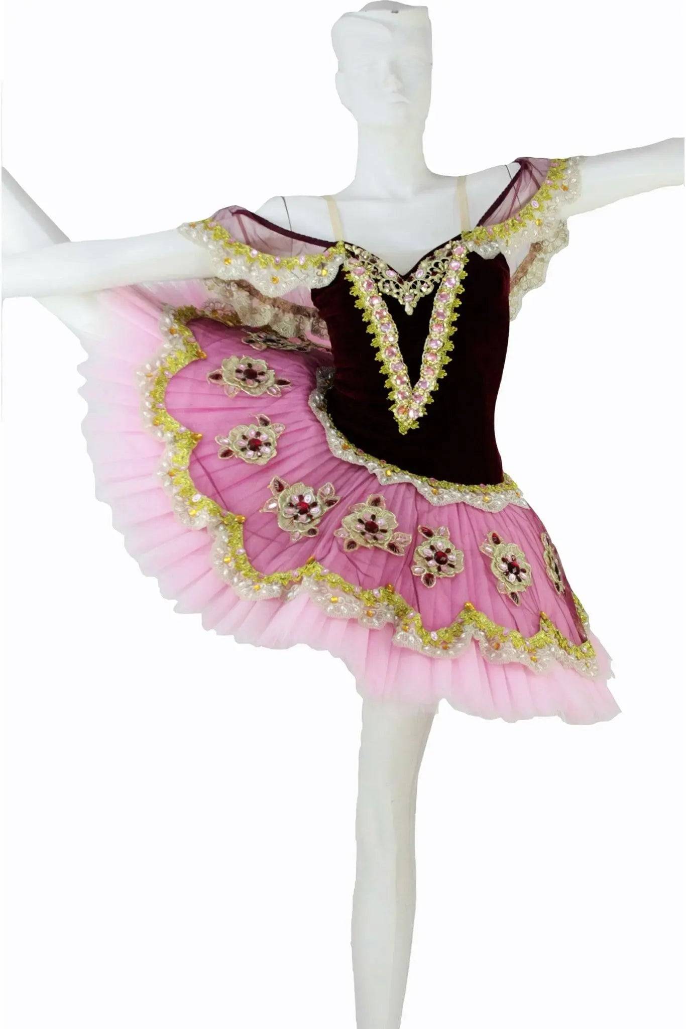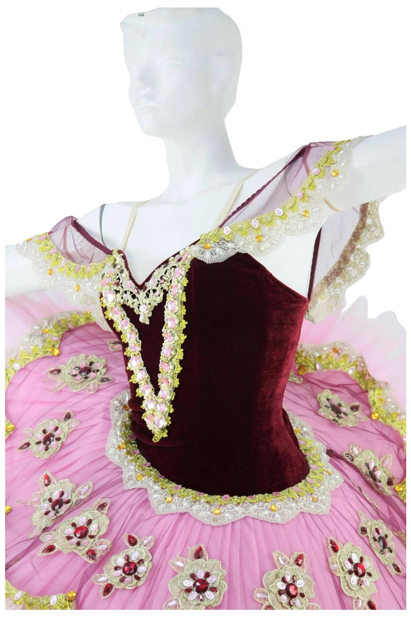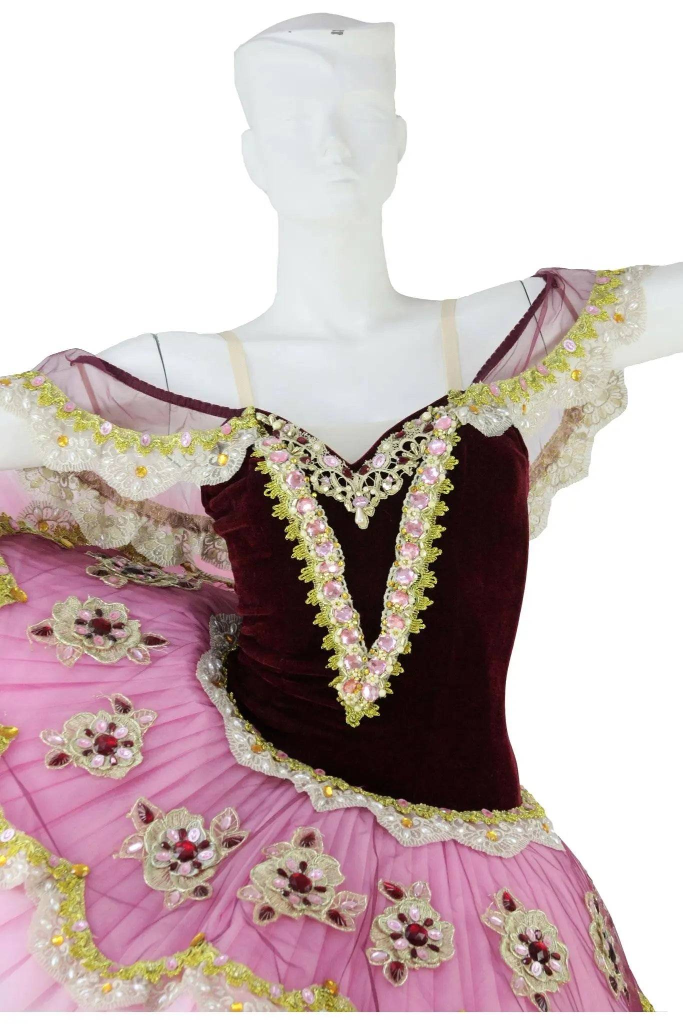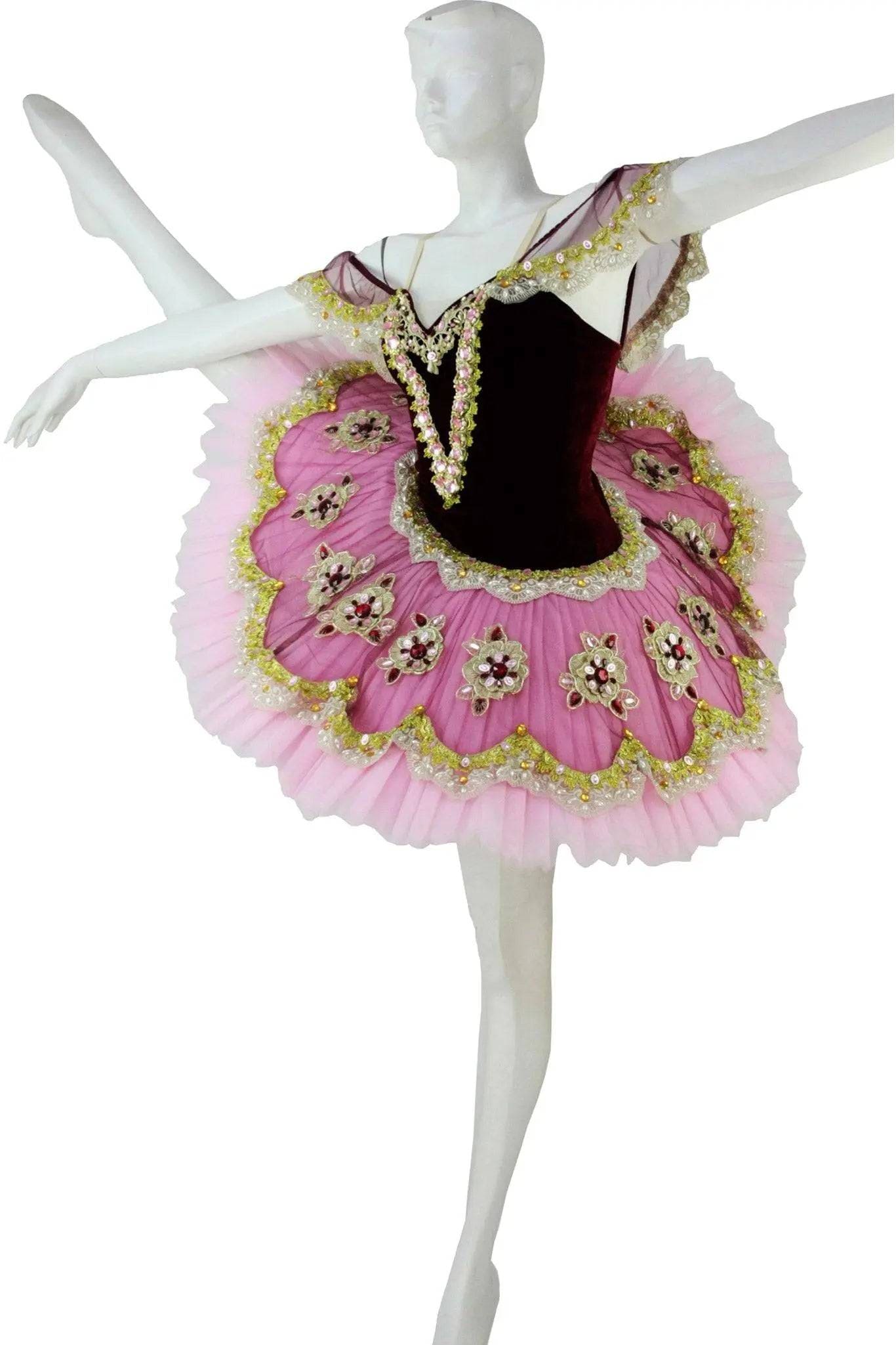 Tutù particolarmente sgargiante adatto a balletti festosi come “Coppelia”, “Raymonda”, “Paquita” e simili. Il corpetto a base nera e il piatto in tulle rosa plissettato sono entrambi decorati con grandi cristalli che creano profili, smerli e grandi fiori, come sulle delicate maniche ad alette.