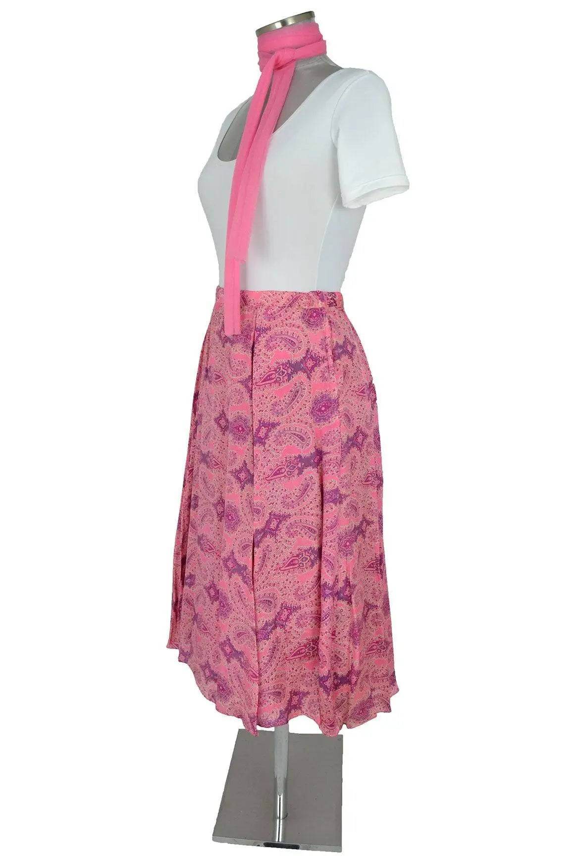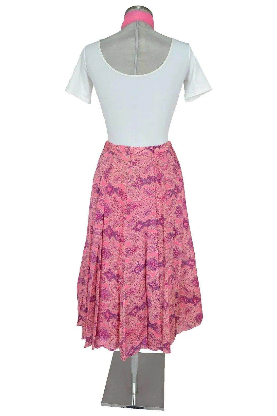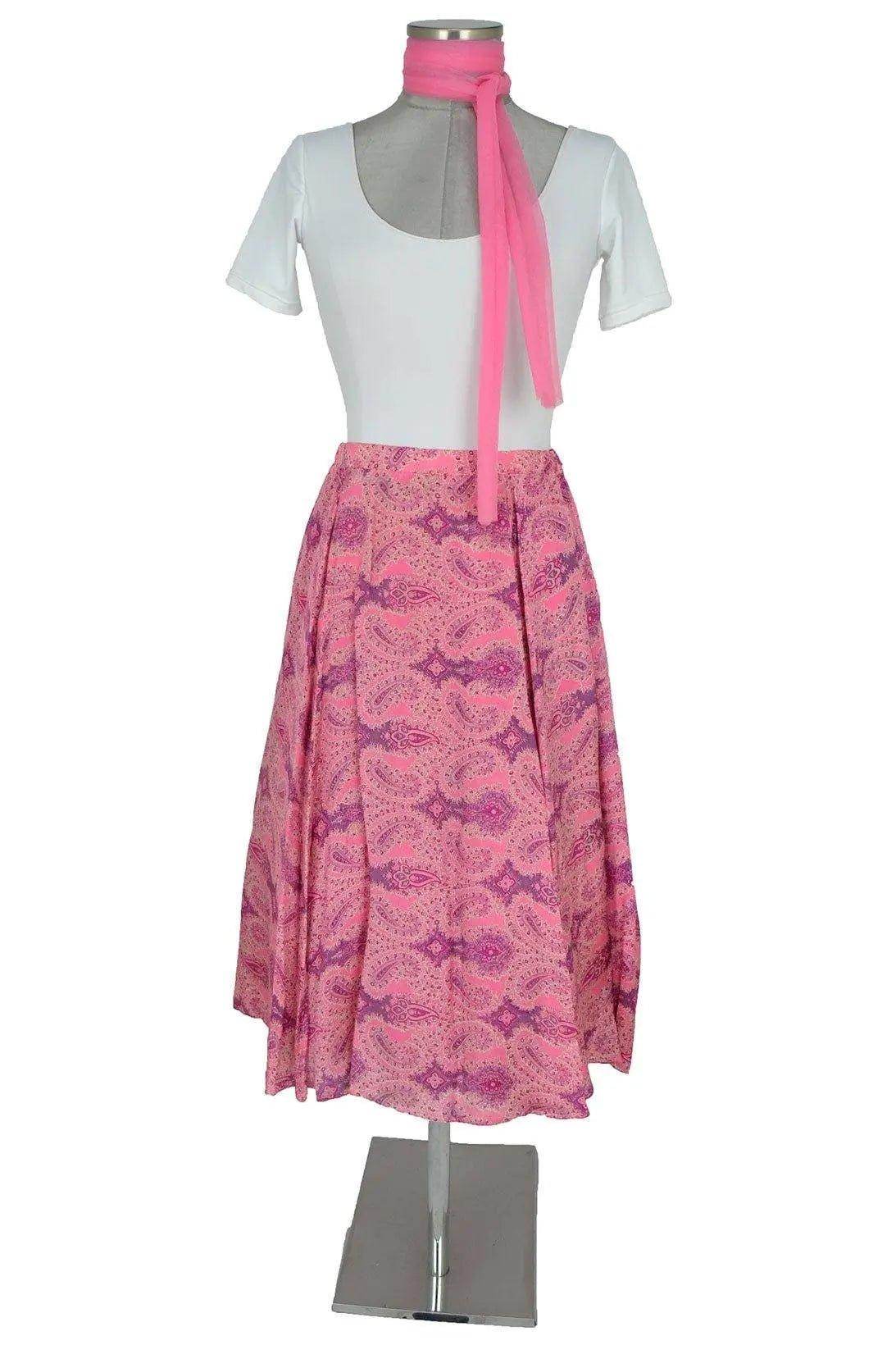 Noleggio abito donna raffinato in stile abbastanza neutro da poter spaziare su vari decenni (1950 fino ad oggi), per serate o recite o balletti. Il body simula una camicetta semplice ma completata dalla fusciacca in chiffon rosa intenso, intonata alla gonna non troppo ampia a disegni cachemire.