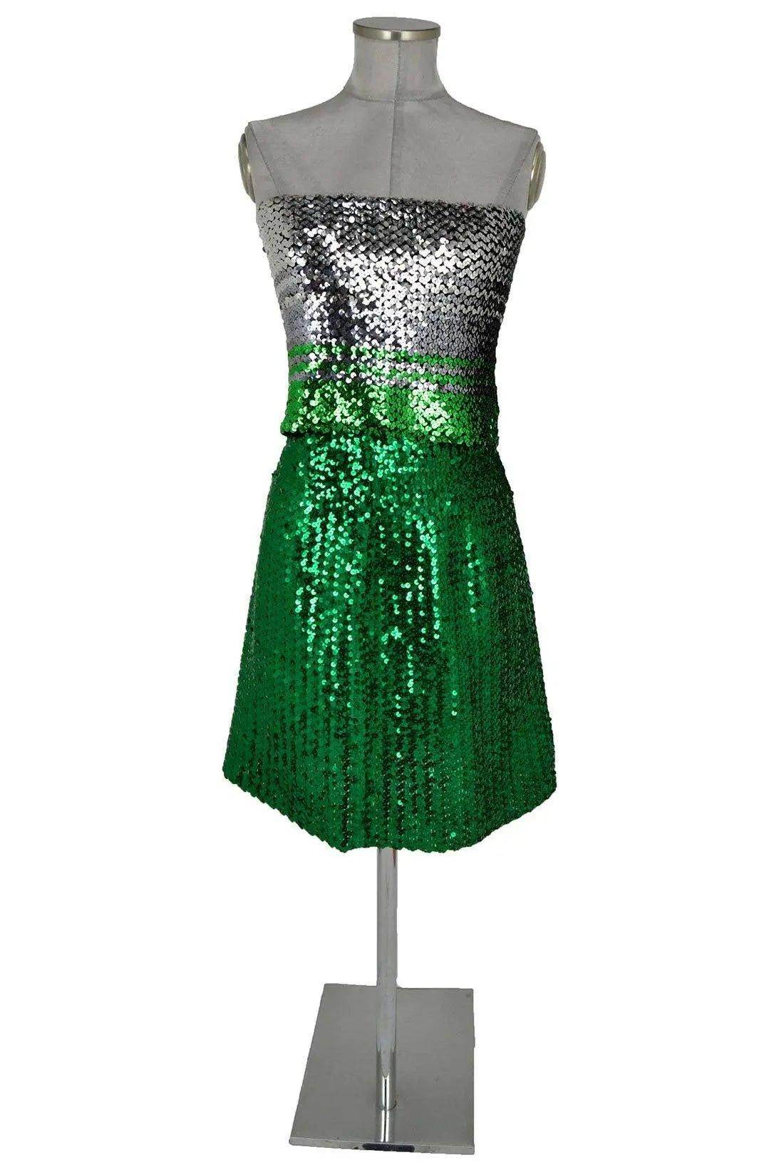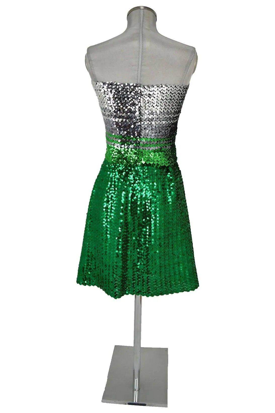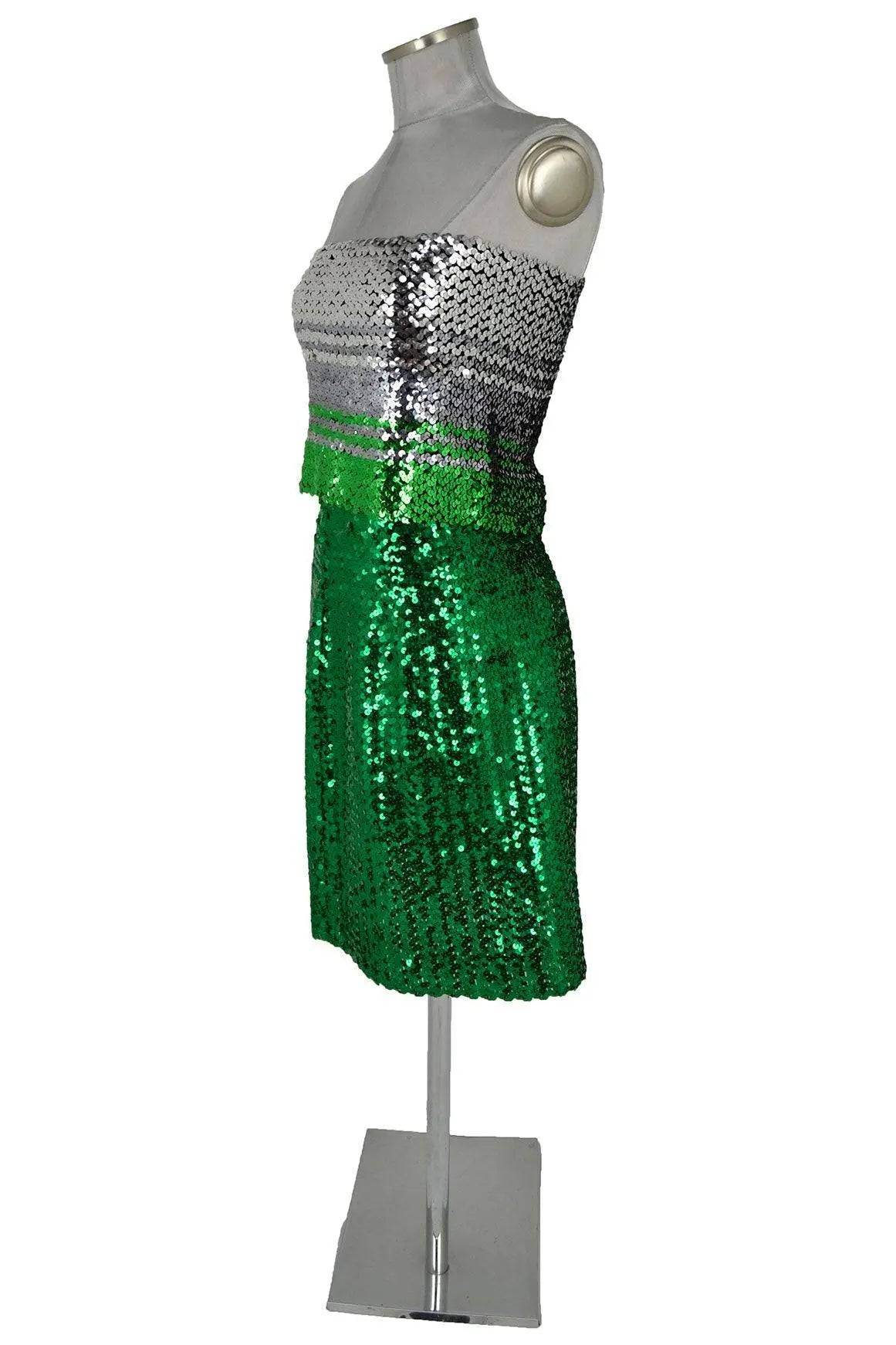 Noleggio abito donna anni '70 per teatro, feste e balletti. Due pezzi completamente di lustrini, sui toni del verde e dell'argento. Lo stile si rifà alle soubrettes della tv dell'epoca, ma può ispirare anche personaggi da fantascienza. Il top è elastico, la gonna leggermente svasata.