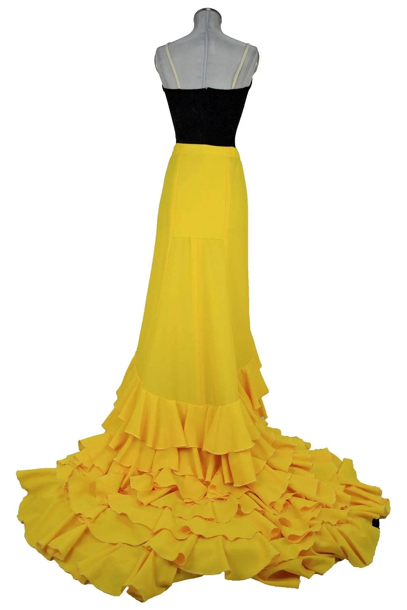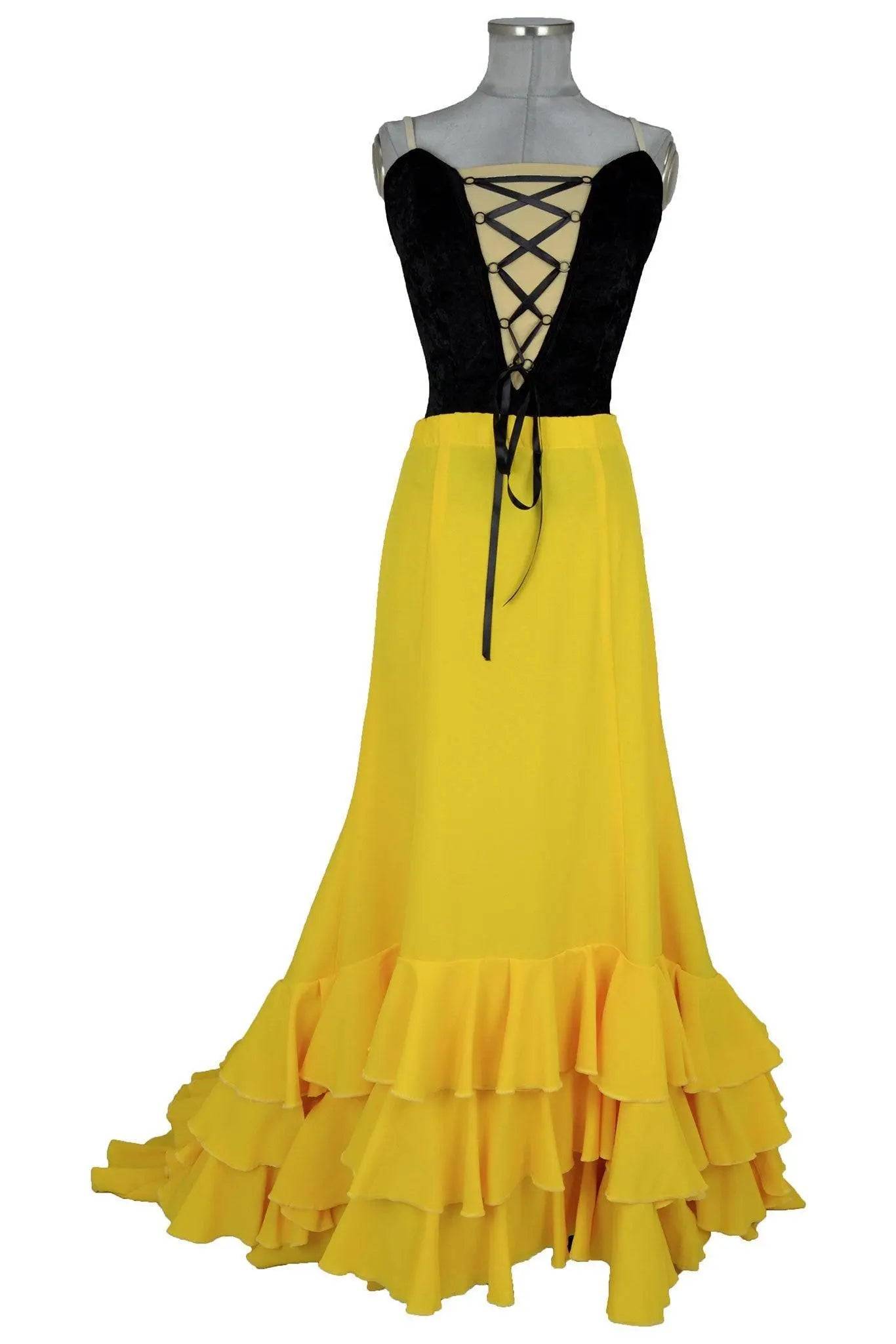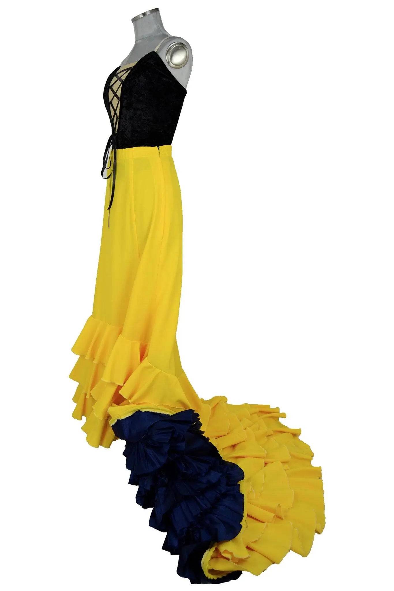 Noleggio abito donna di colore insolito e luminoso impreziosisce questa gonna svasata, con elastico in vita e tripla balza di volant con un accenno di coda. Pensata per ballare il flamenco e abbinata a un bustino stringato in stile zingaro, si adatta anche a serate mondane o a balletti modern, jazz e afro in stile Alvin Ailey.