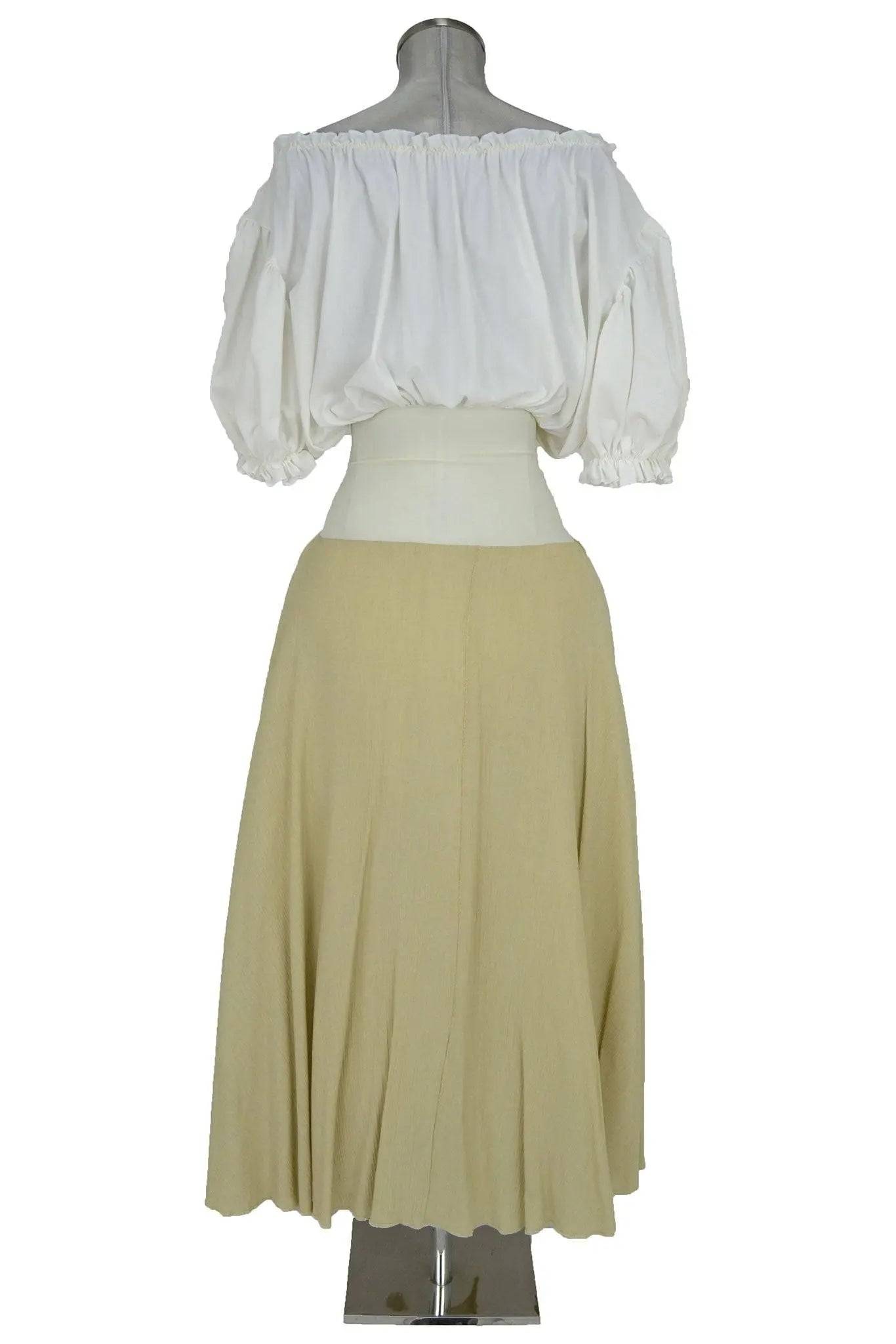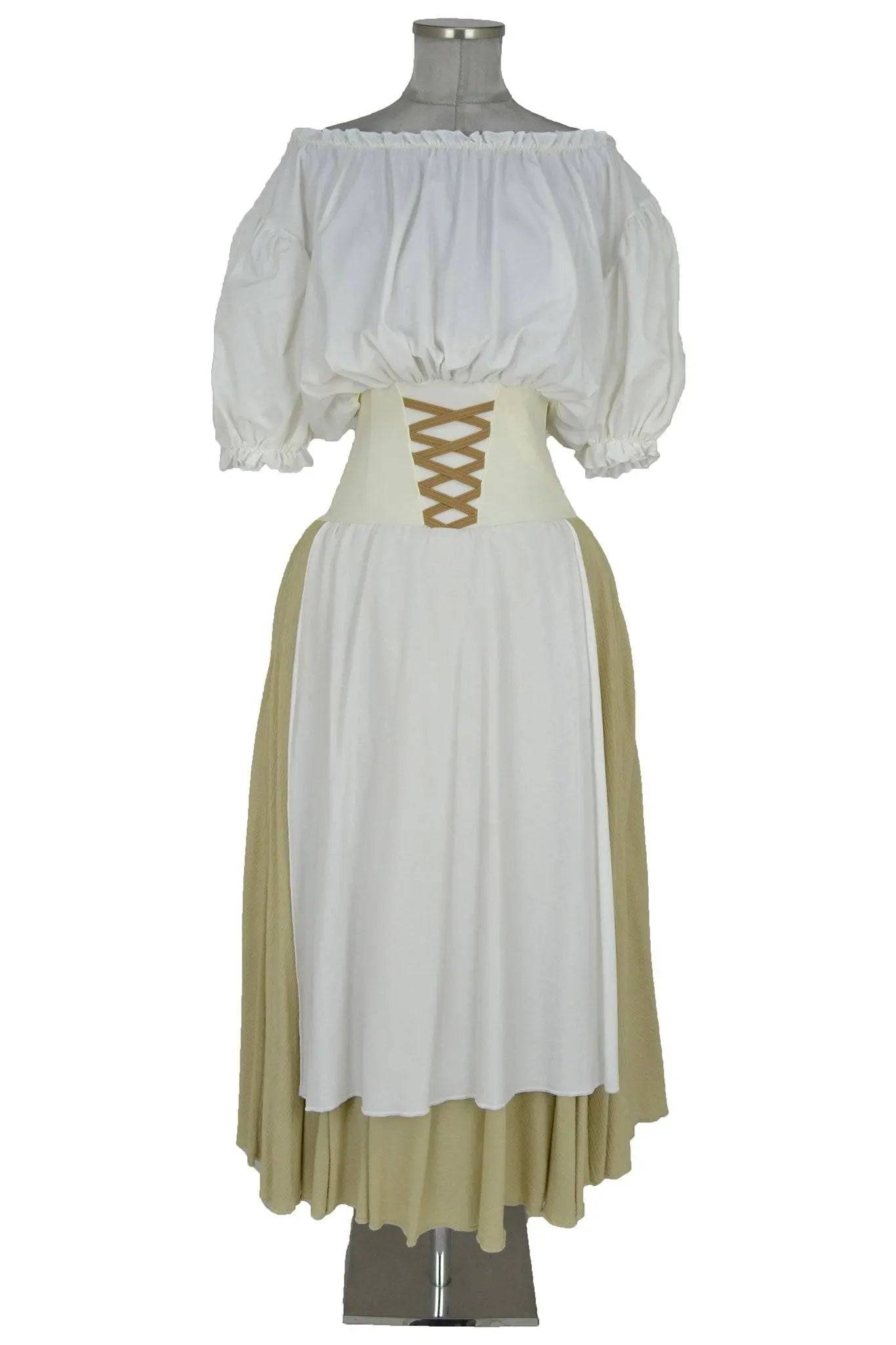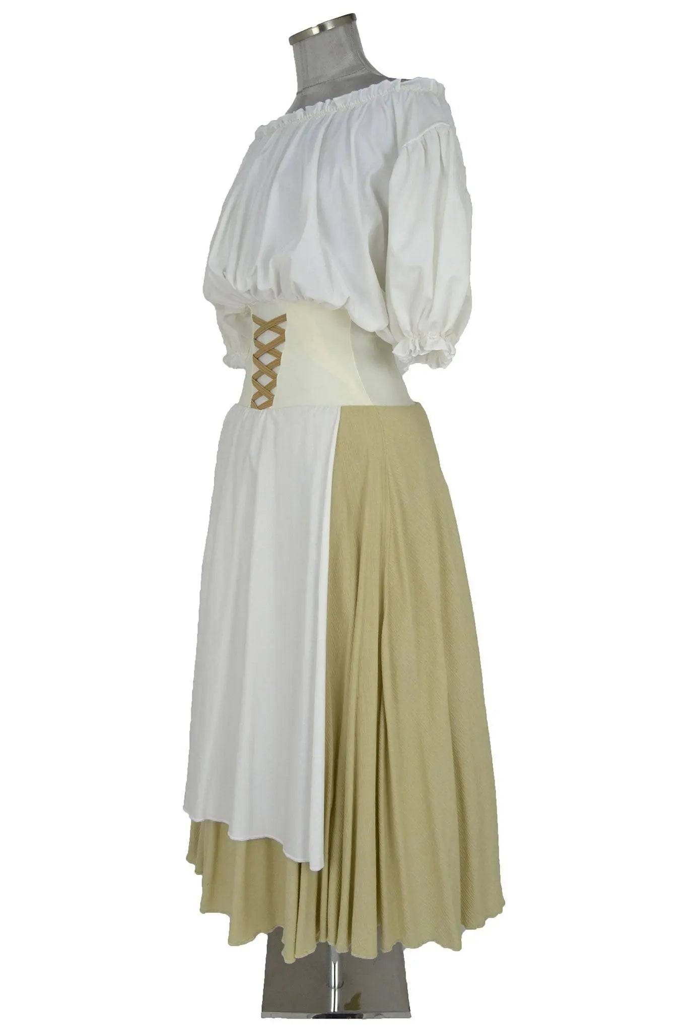 Noleggio abito donna popolana in bianco ed ecru, abbastanza leggero da poter essere indossato anche per balletti di danza, e in stile abbastanza neutro da adattarsi a personaggi di secoli vari, dal Medioevo al '700). Si compone di blusa arricciata e gonna con grembiule e bustino stringato.