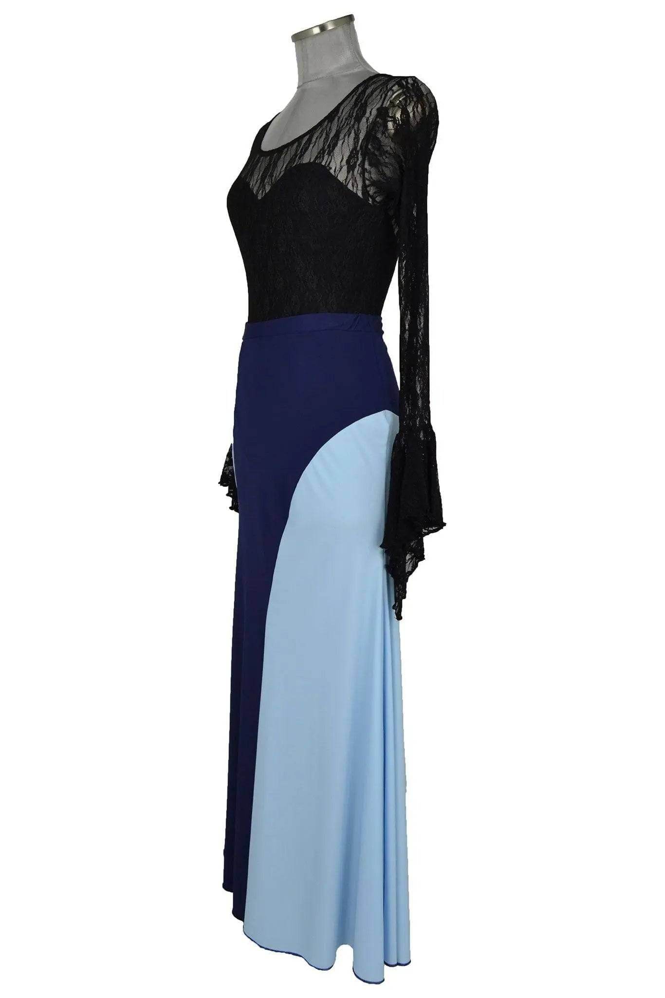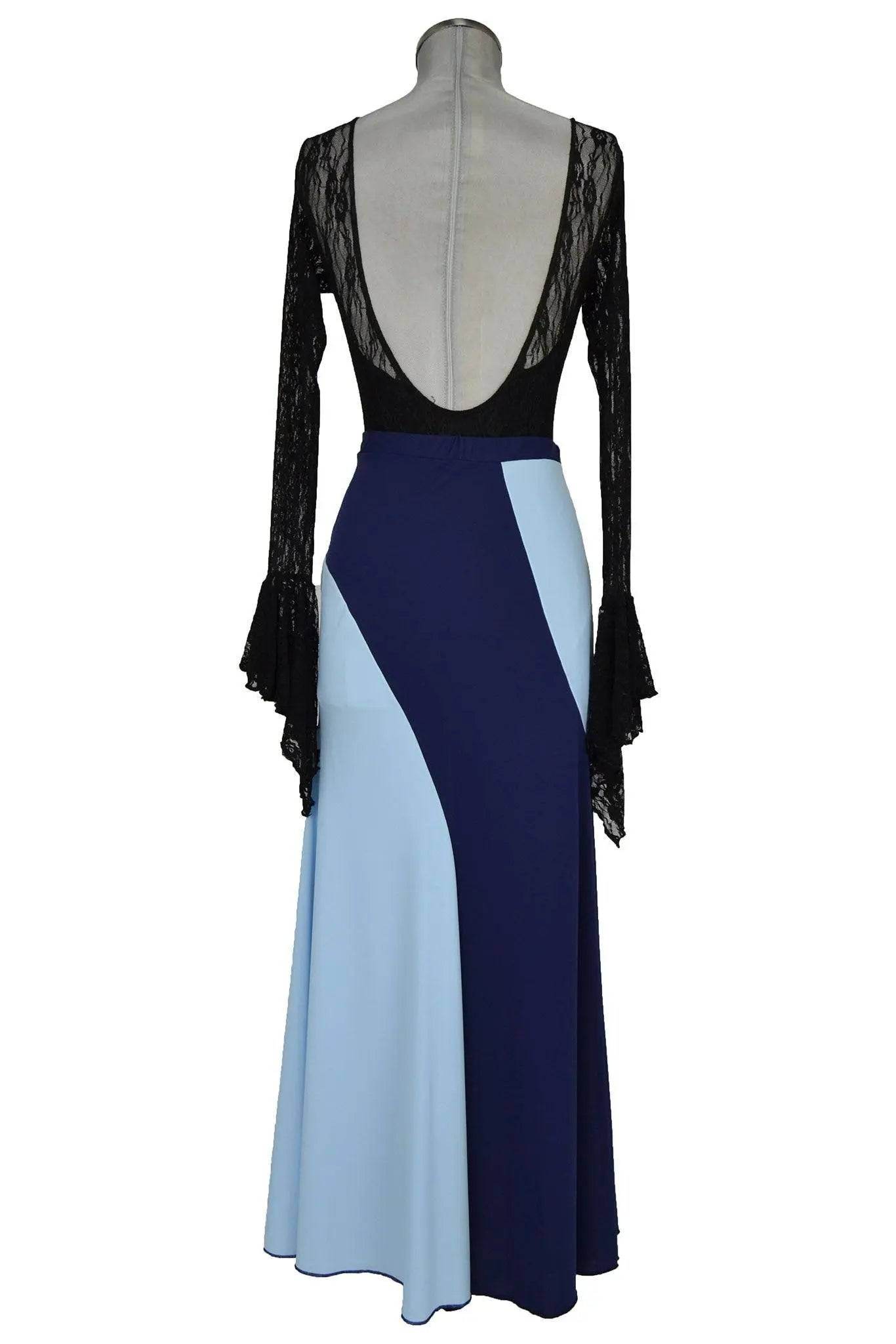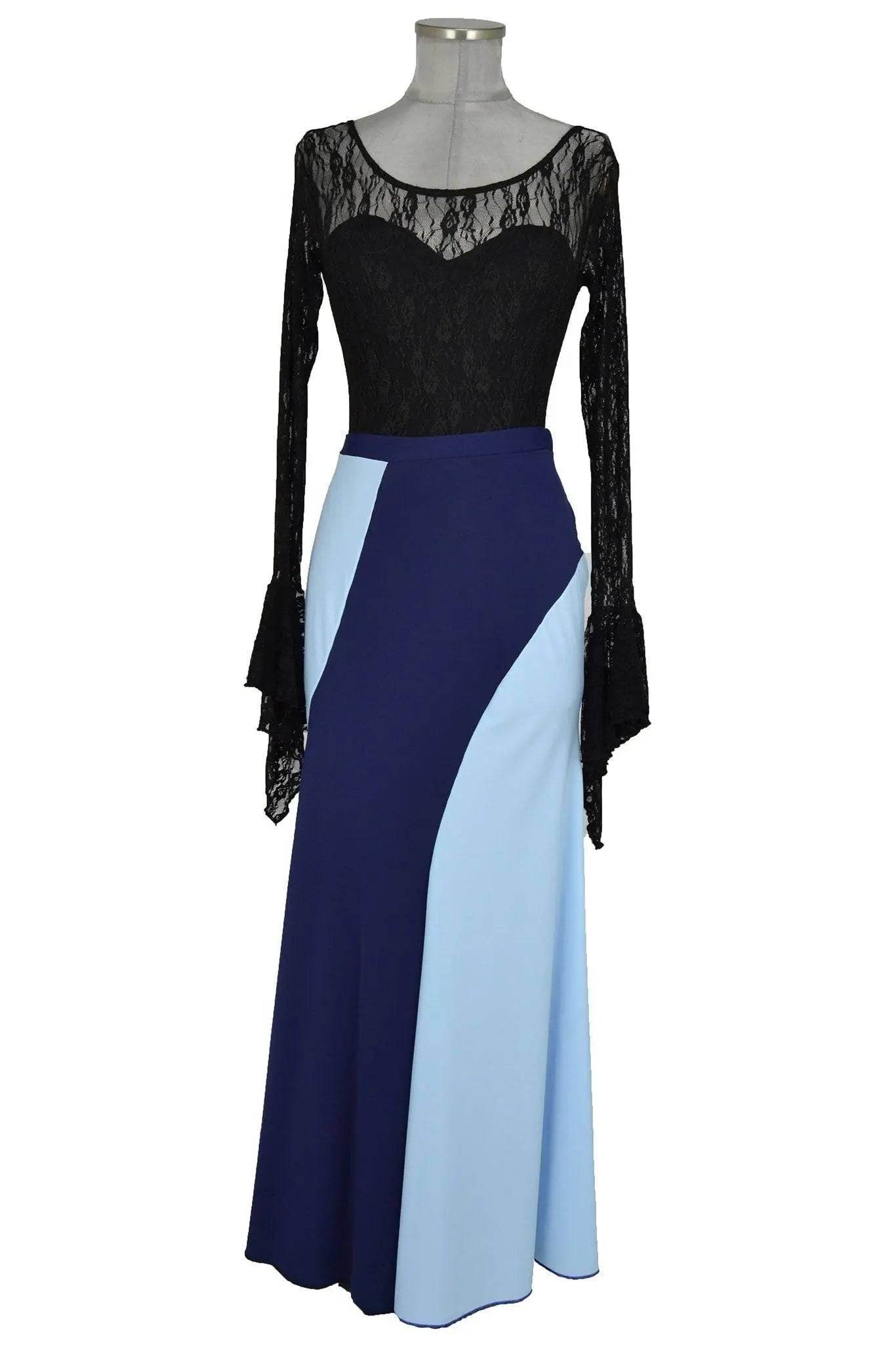 Il corpetto in pizzo nero dona un tocco di classe e raffinatezza, mentre la parte inferiore dell'abito gioca con un contrasto di colori tra il nero e il blu, creando un effetto dinamico ed elegante. Noleggio abito donna nero e blu da ballo flamenco è perfetto per chi desidera distinguersi con stile durante performance teatrali, serate di gala o feste a tema flamenco.