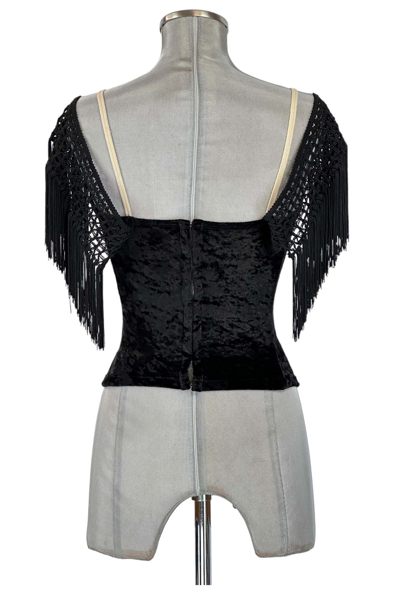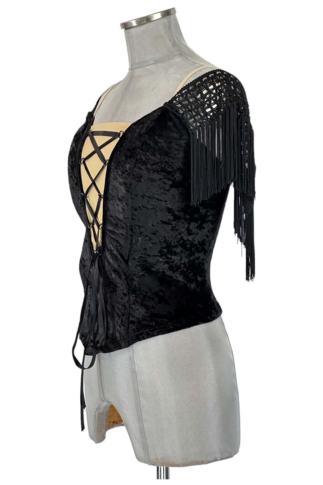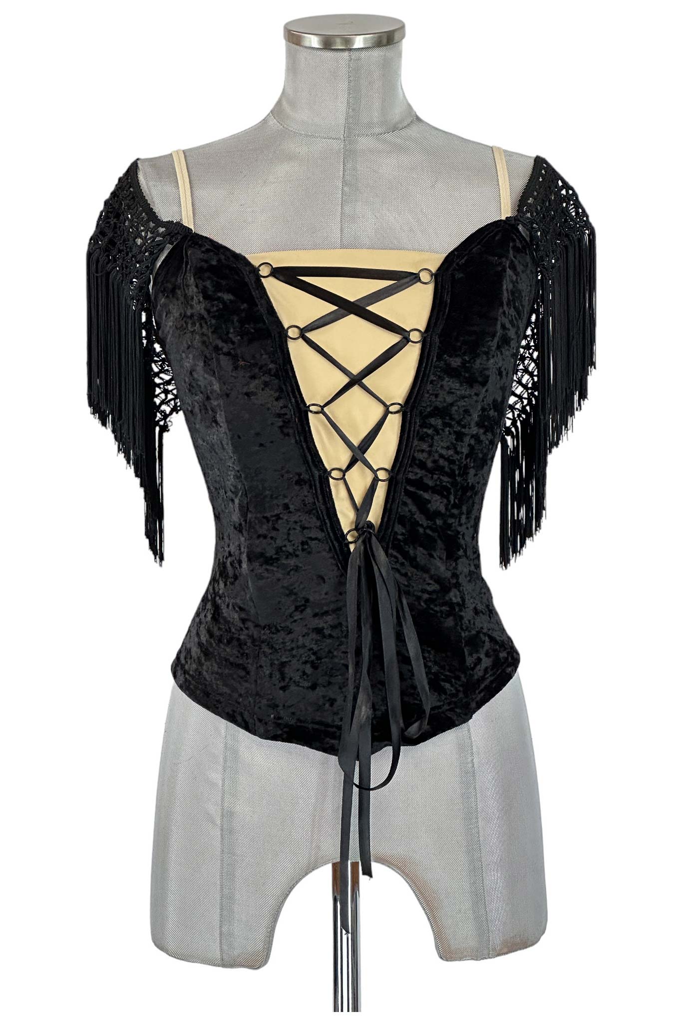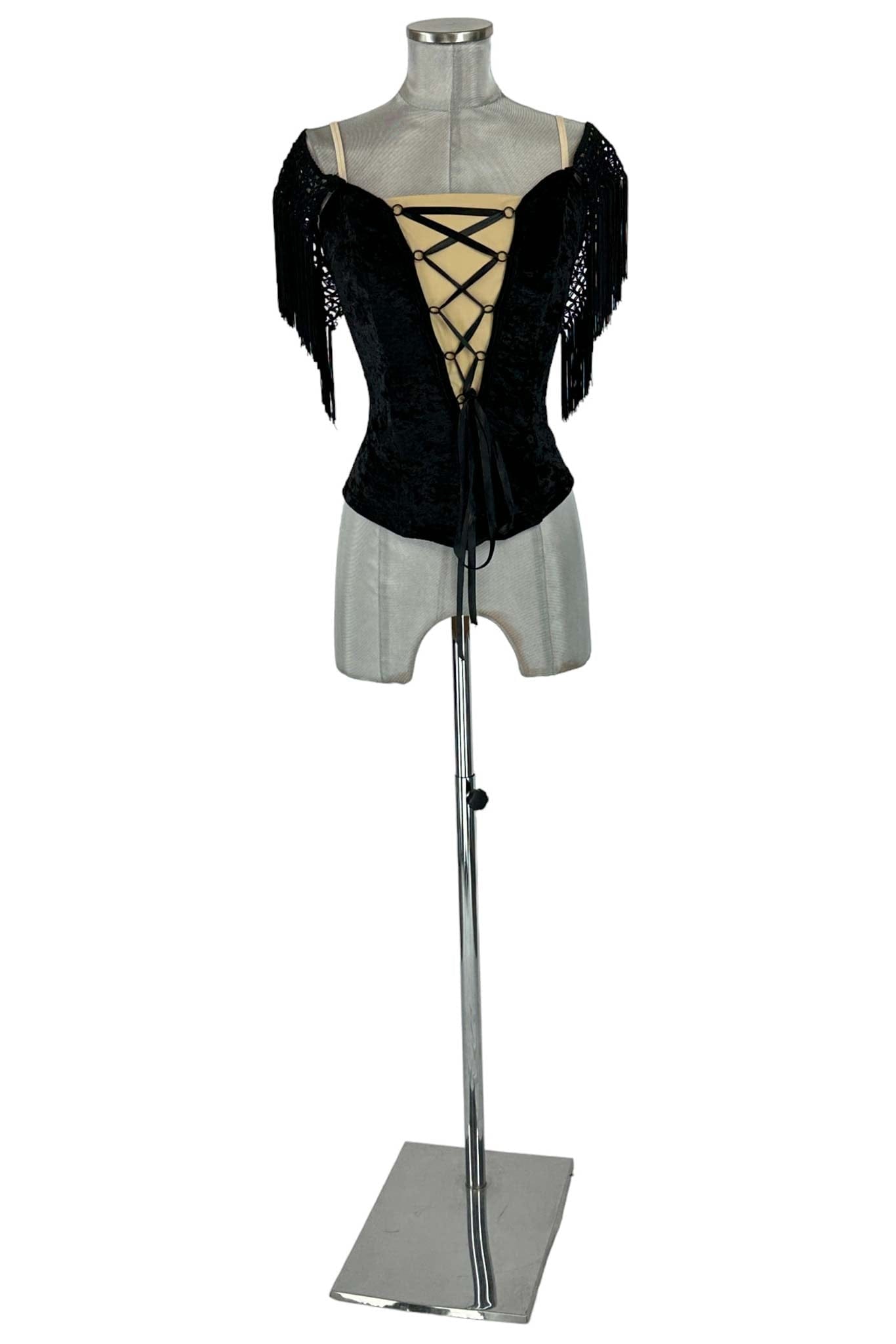 Il corsetto è realizzato in tessuto di velluto nero di alta qualità, con dettagli in pizzo e frange che aggiungono un tocco di sofisticazione e movimento. La chiusura frontale con nastri incrociati permette di regolare la vestibilità, garantendo comfort e una silhouette affusolata.