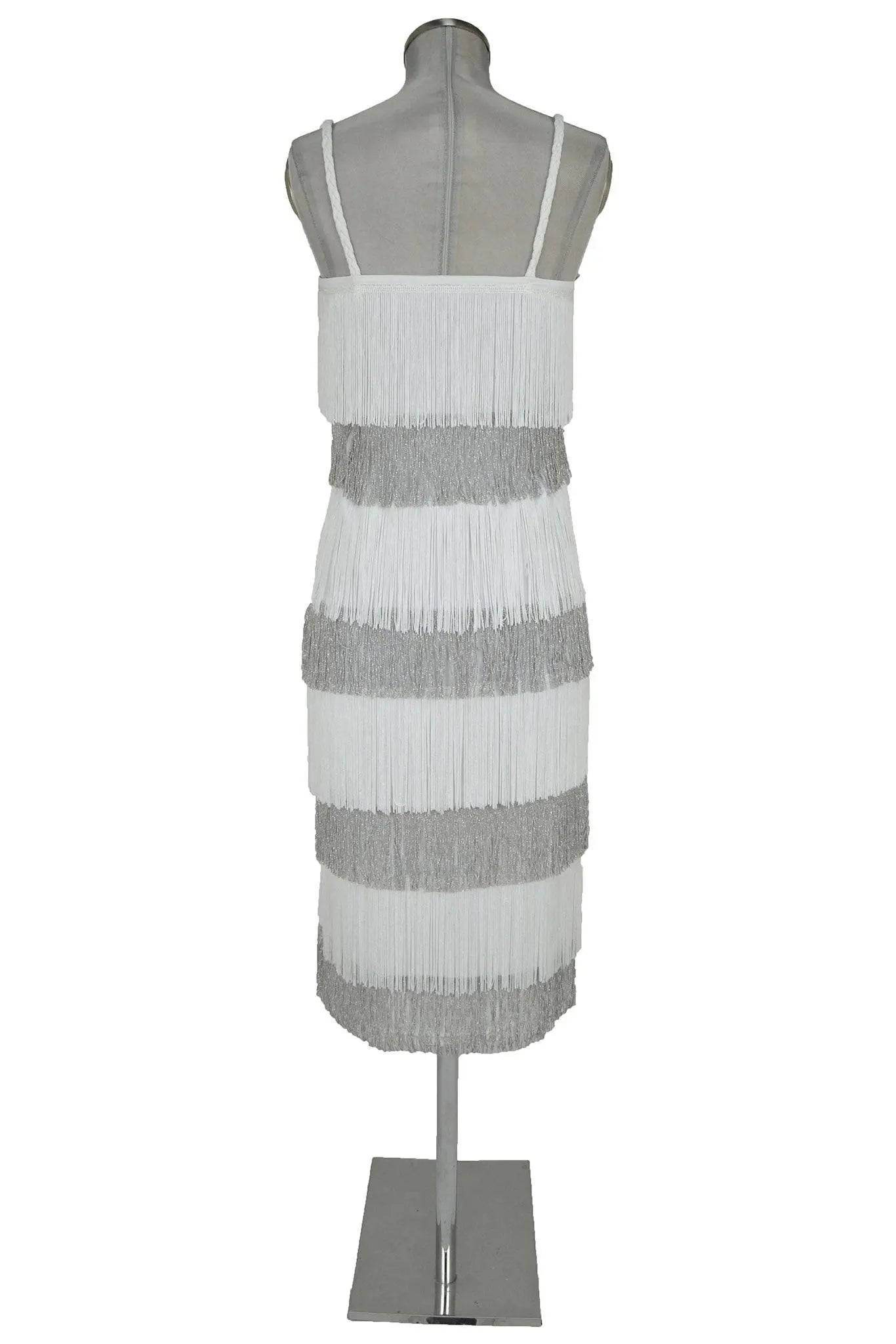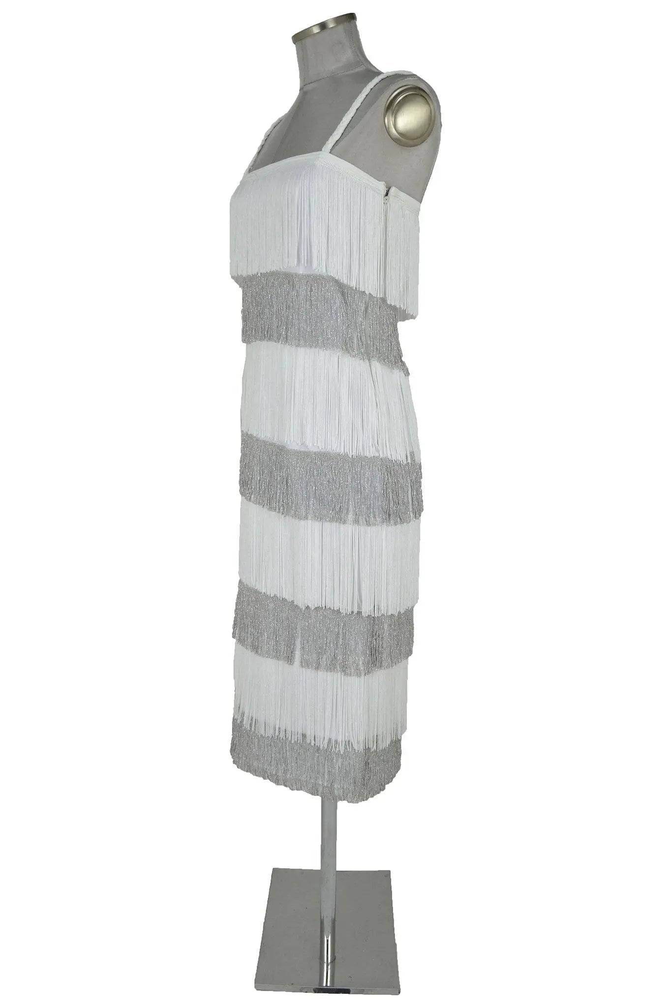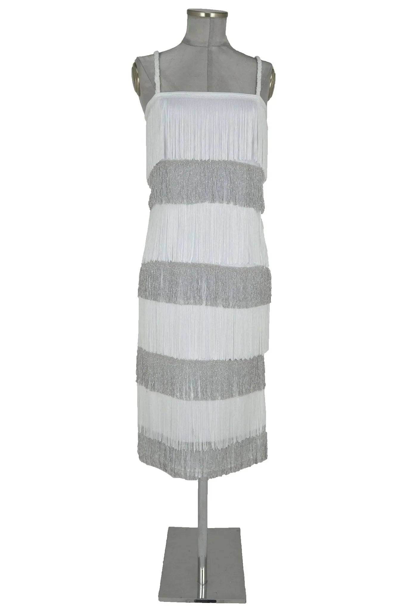 Noleggio Abito donna tipo Charleston ma di sapore più moderno, di taglio longuette e spalline in cordoncino intrecciato; le frange d'obbligo per questo genere sono otto alternate in bianco e argento, di diversa lunghezza sul corpino e sulla gonna. Di grande effetto con accessori in tinta.