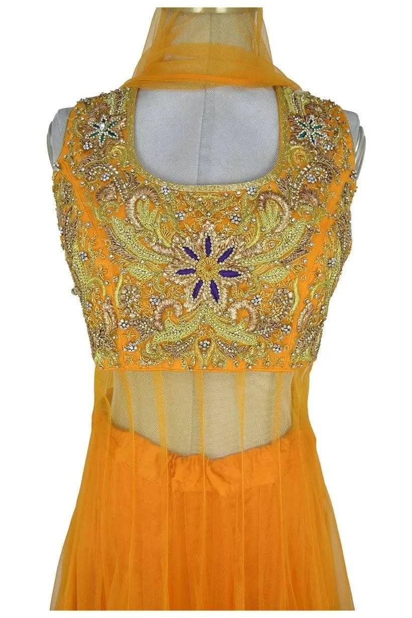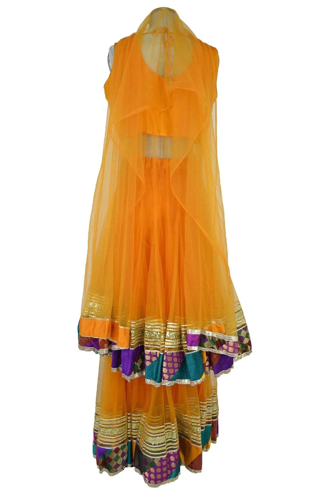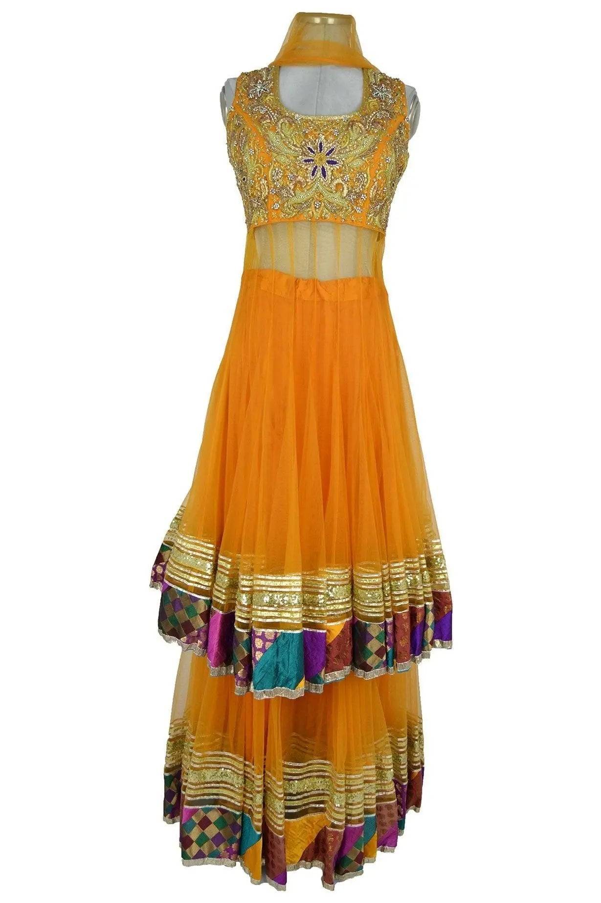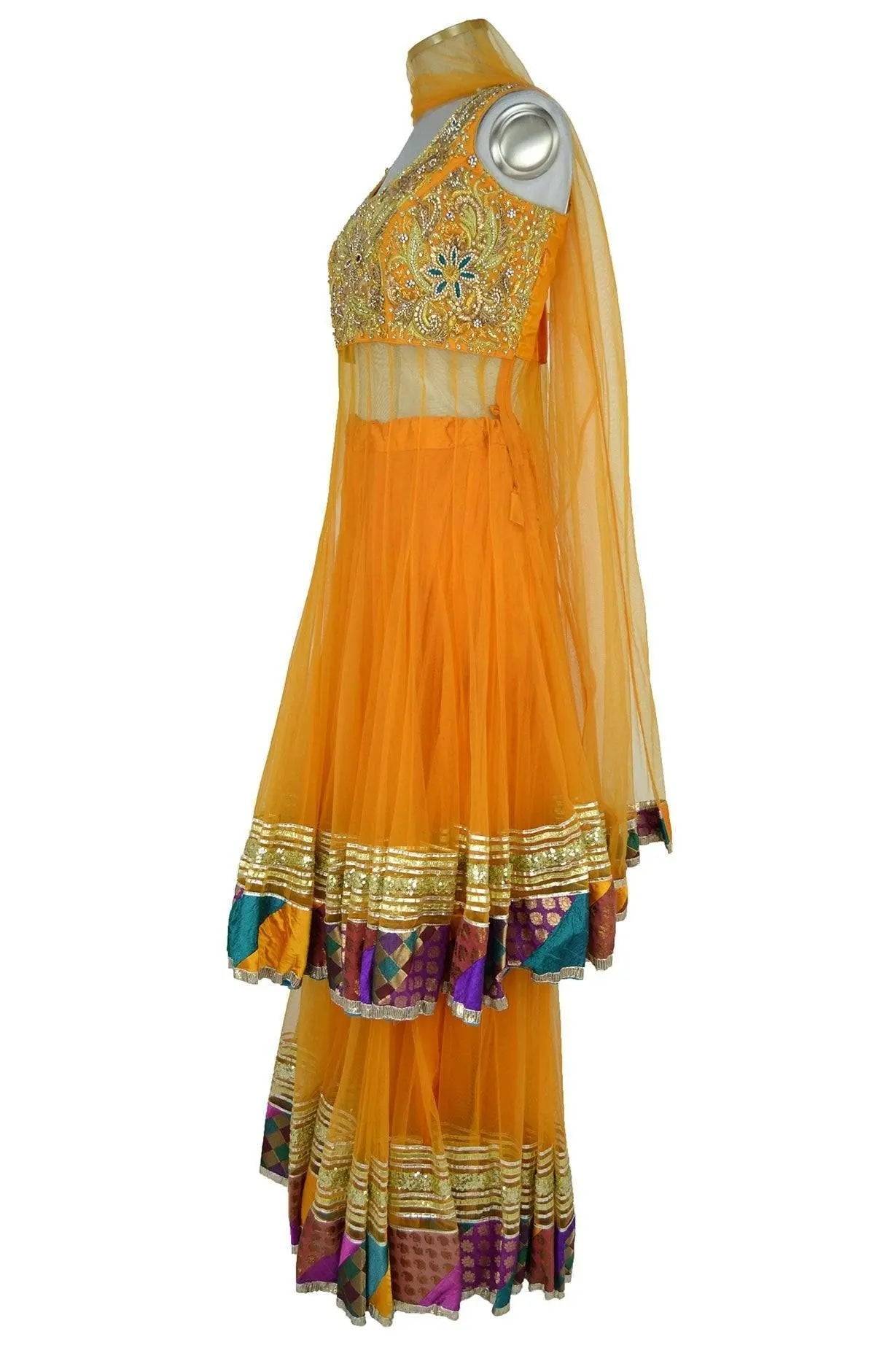 Noleggio Bellissimo abito donna di ispirazione orientale, adatto anche per danza del ventre, Bollywood, danze bengalesi e carnevale. Il corpino a vita alta è ricamato, la doppia gonna trasparente enfatizza le due lunghezze con balze a disegni geometrici, su sottogonna in tulle giallo oro.