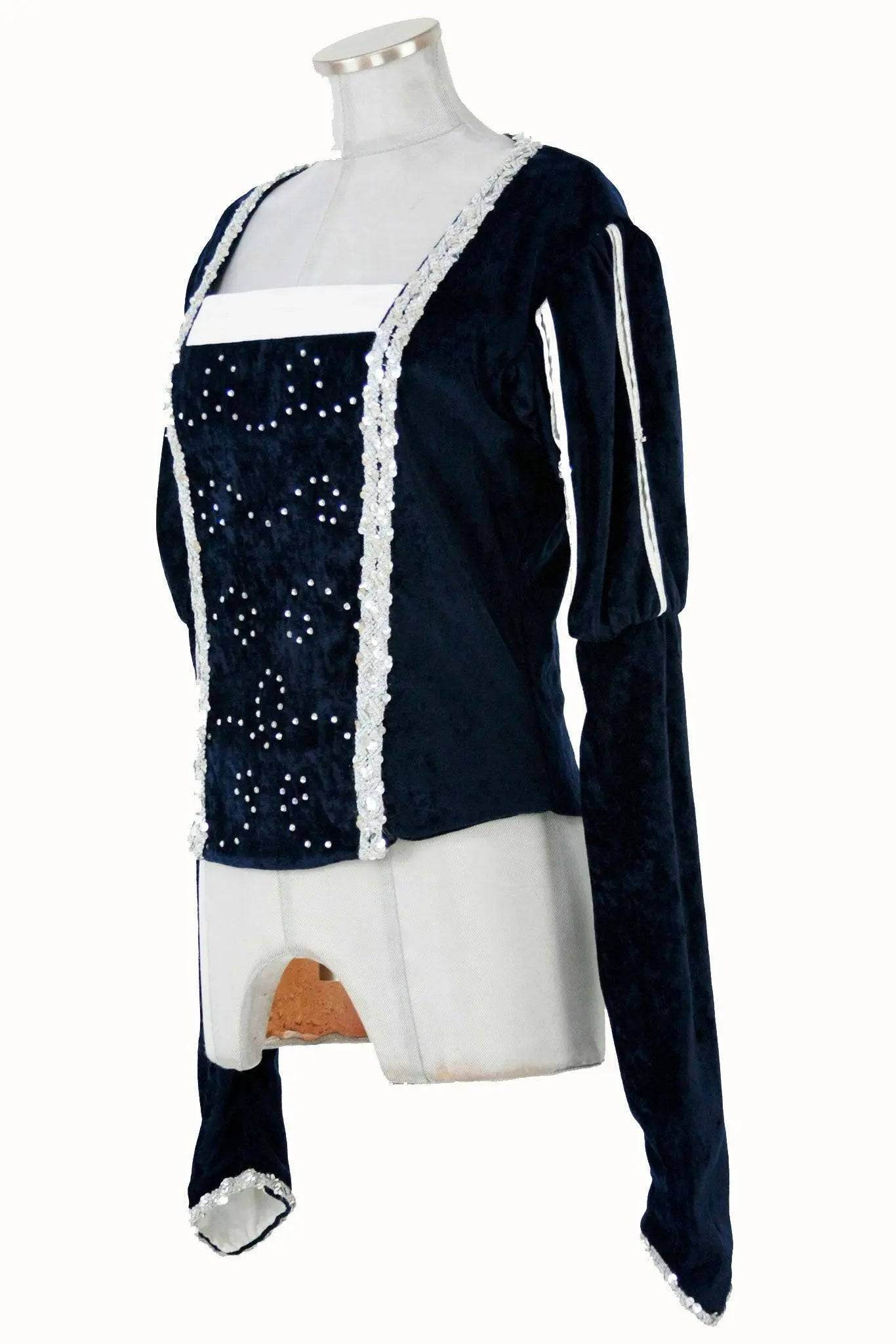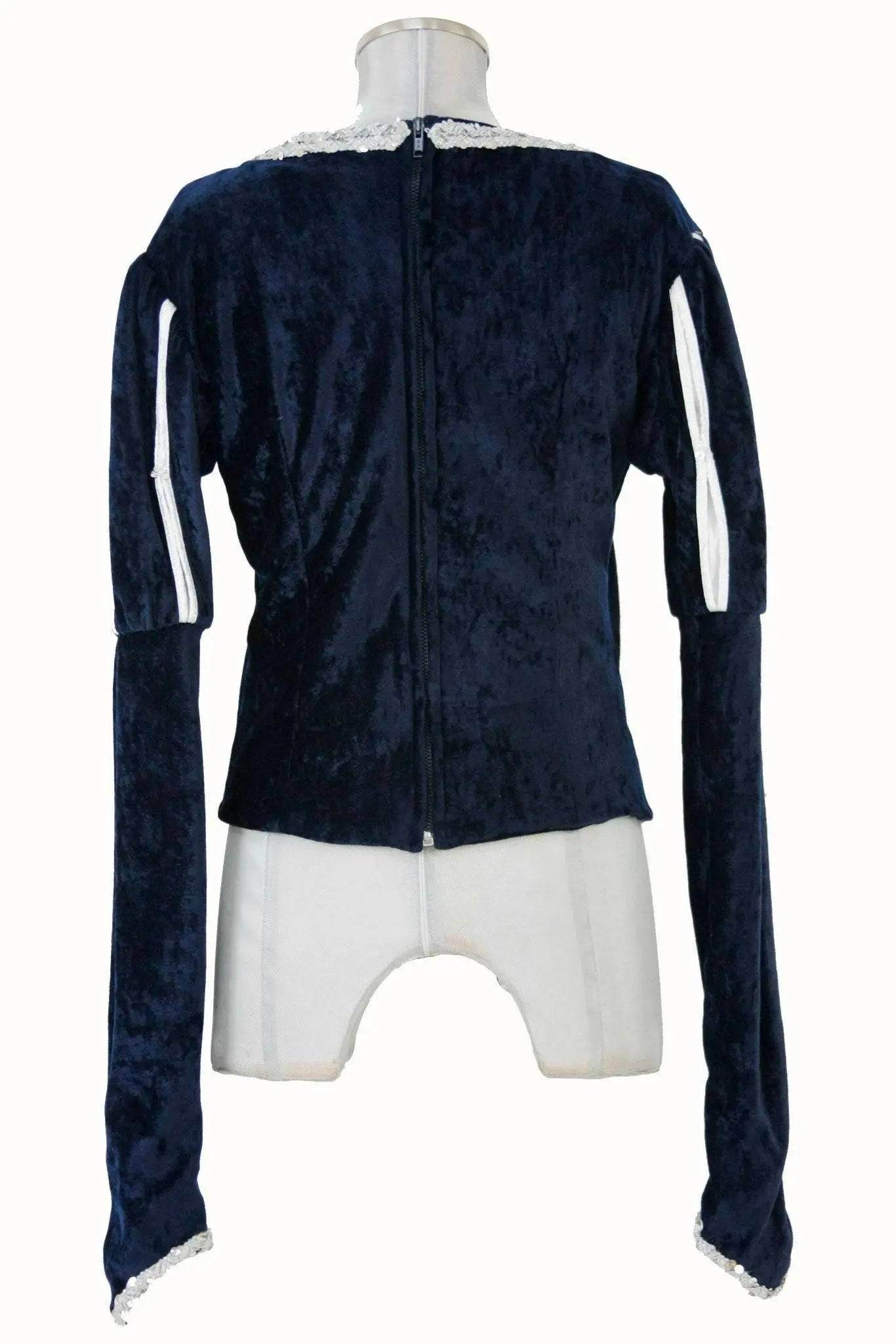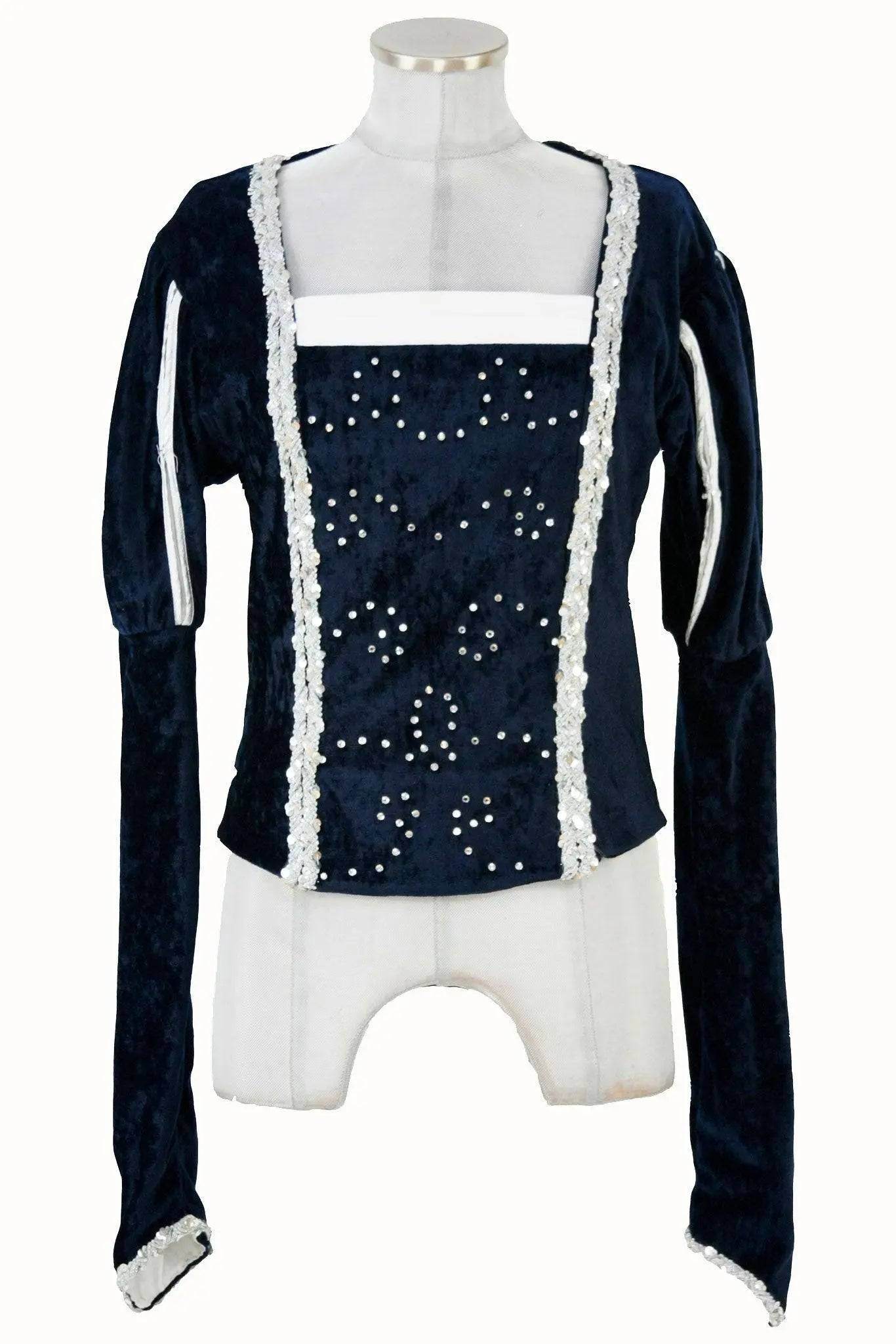 Giubba in stile medievale-rinascimentale con le tipiche maniche a tagli; è in velluto martellato blu notte con applicazioni di paillettes e passamanerie. Semplicemente perfetta per Romeo e per personaggi di principi in favole senza tempo, come “Il Lago dei Cigni”, o nel II° atto di “Giselle”.