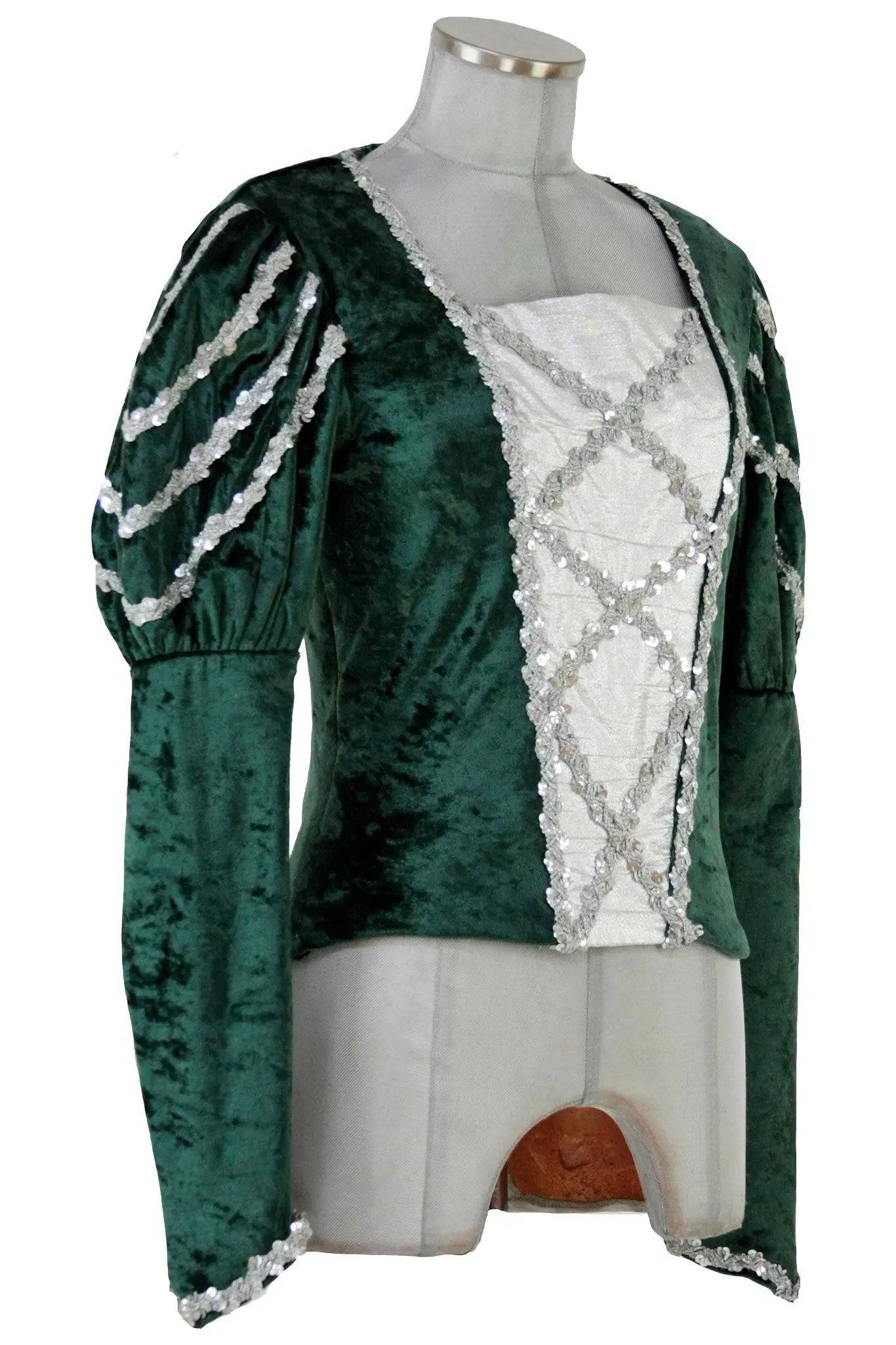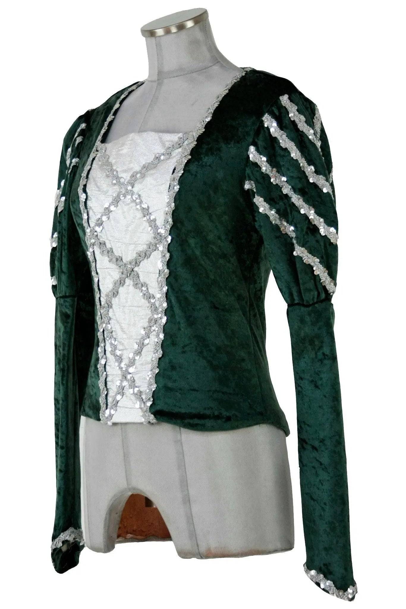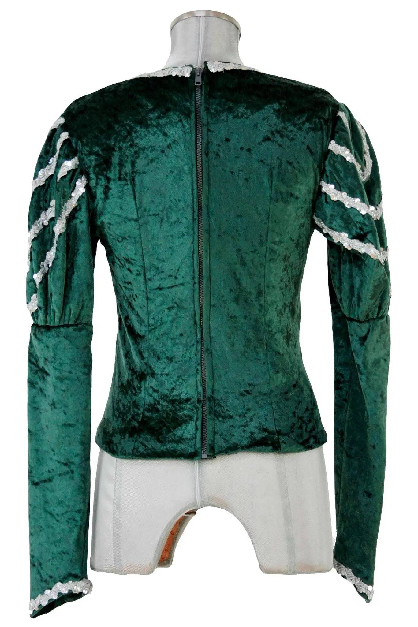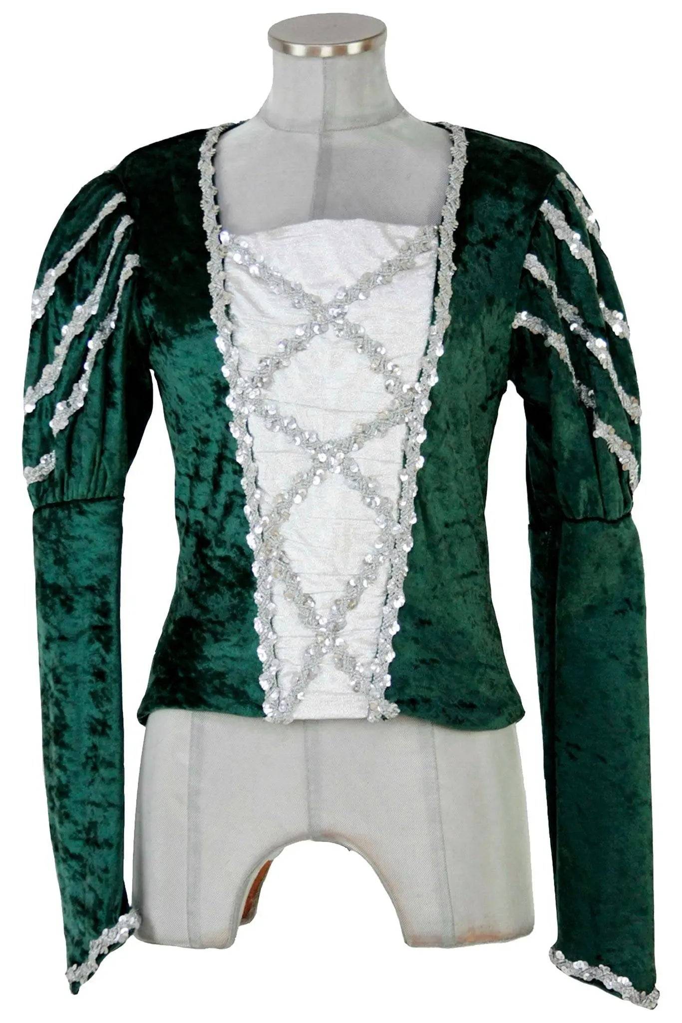 Noleggio corpetto danza uomo in velluto martellato e tela (che simula la camicia), con applicazioni di fili di paillettes argento che seguono in particolare la pettorina e le maniche a sbuffo. Perfetto per un principe romantico in balletti come Raymonda, Giselle o Romeo e Giulietta.