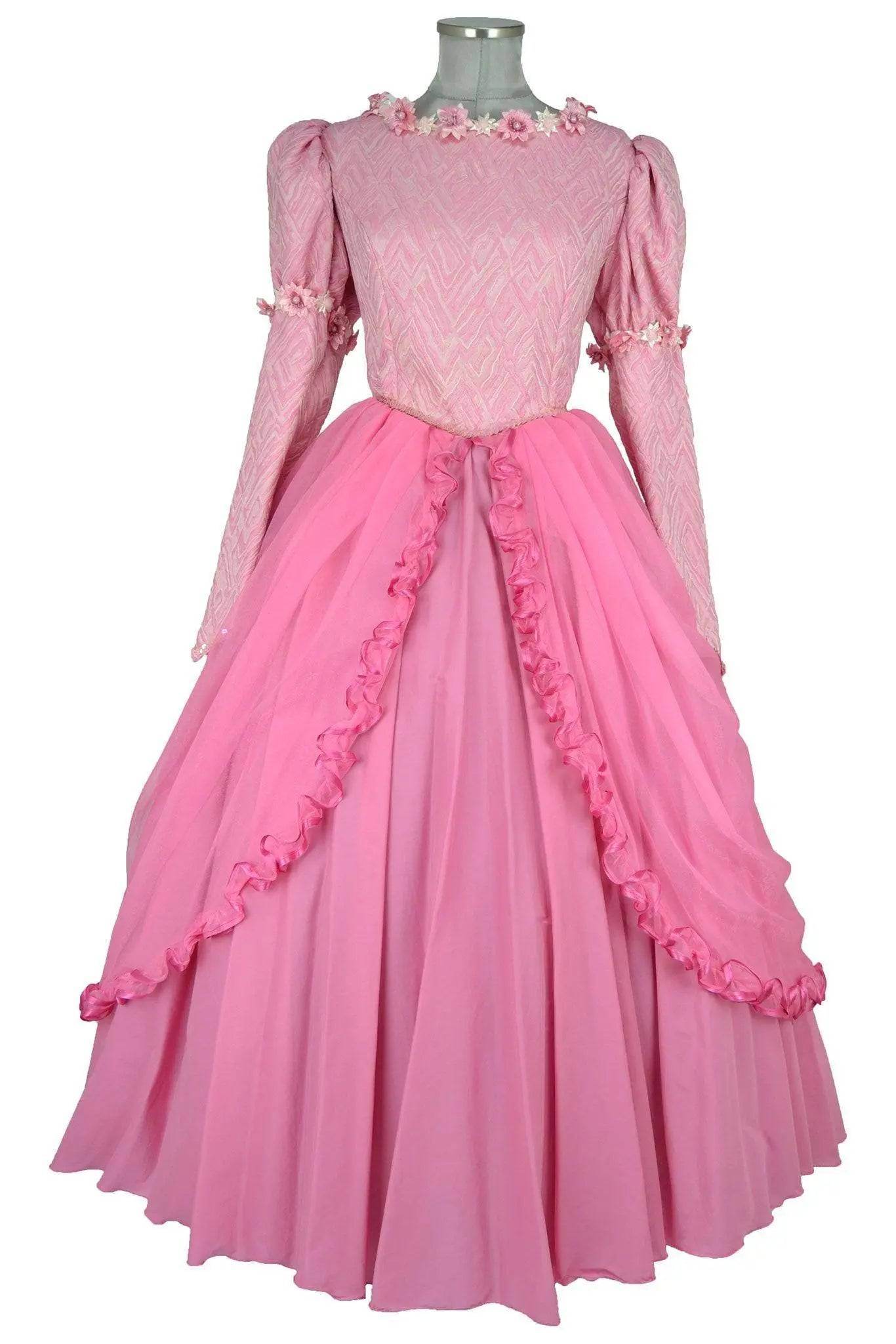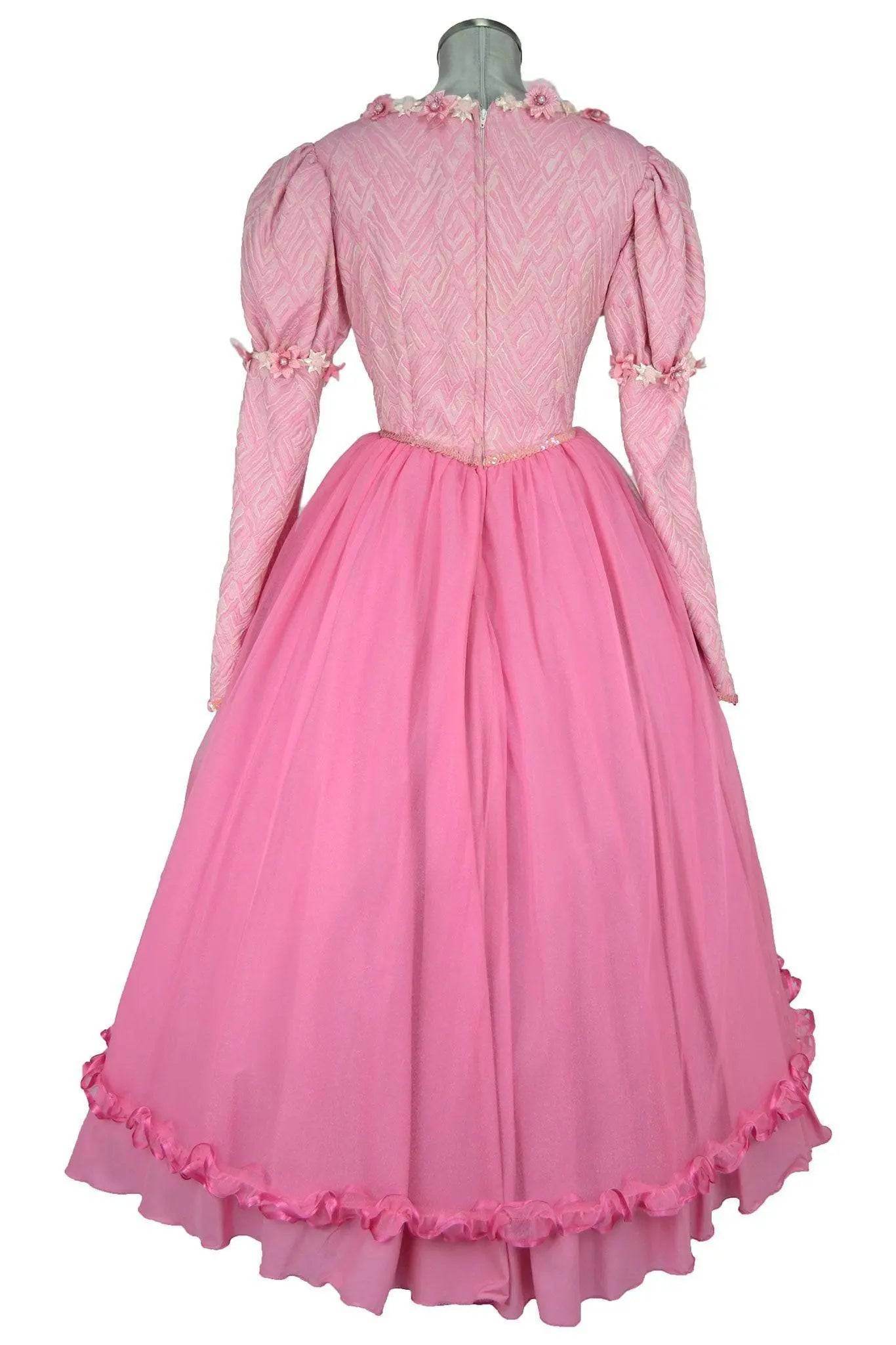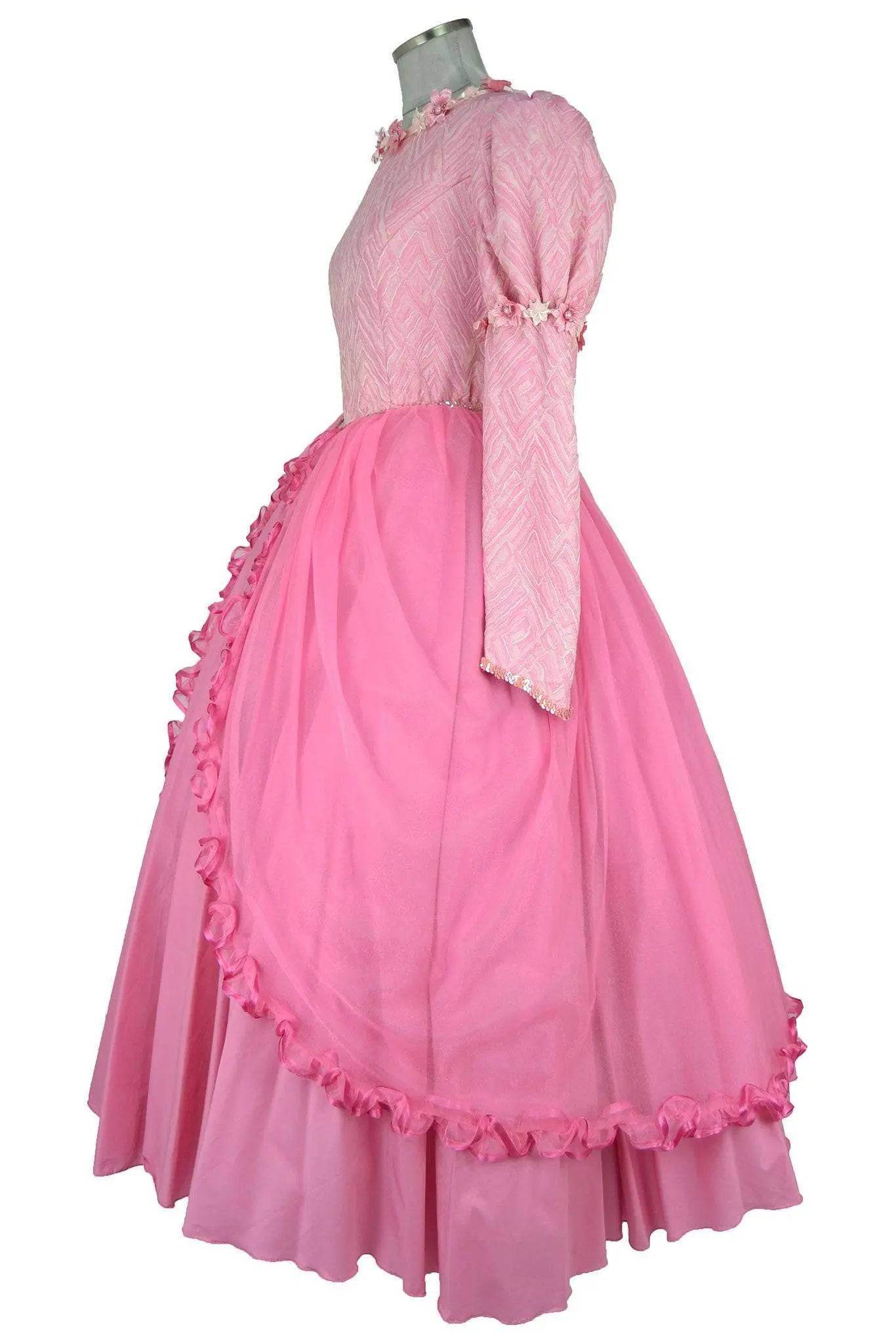 Noleggio Abito donna da ballo stile '800 adatto a una ragazza giovane e romantica, il corpetto a manica lunga è in tessuto operato sui toni del rosa con bordure di piccoli fiori, la gonna è in stoffa più leggera con il classico panneggio “da principessa” orlato di ruches. La scollatura a barchetta è appena accennata.