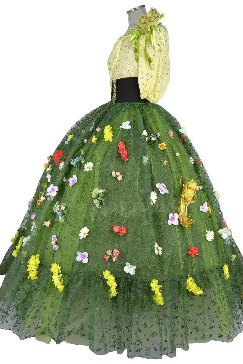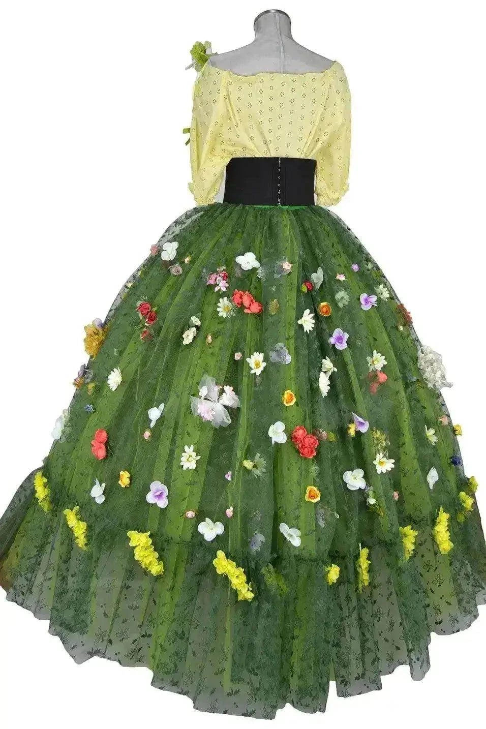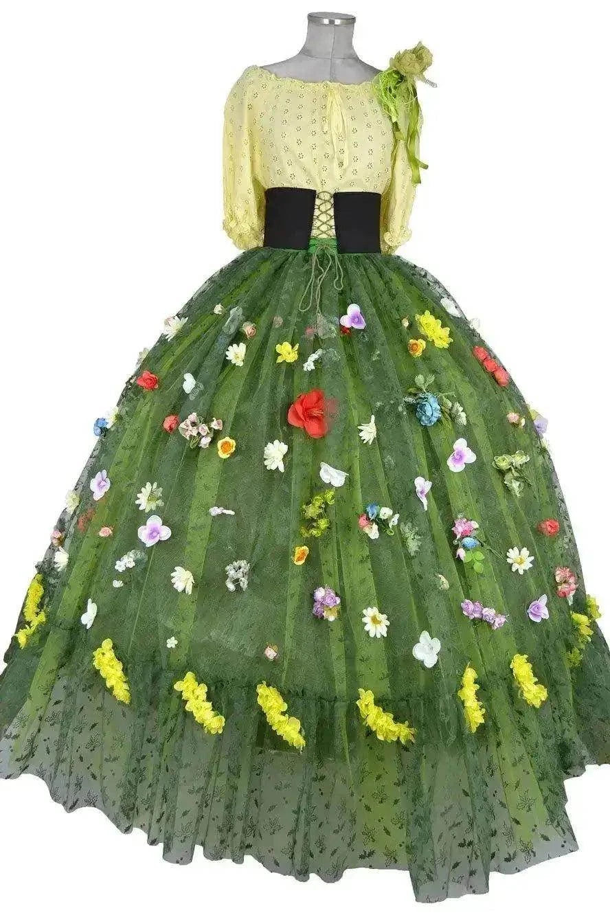 Realizzato con tessuti di alta qualità, l’abito presenta una gonna ampia verde, adornata con fiori colorati che evocano un giardino in piena fioritura. Il corpetto giallo, decorato con ricami floreali, aggiunge un tocco di eleganza e femminilità, rendendo l’abito ideale non solo per feste di carnevale, ma anche per rievocazioni storiche, eventi tematici e spettacoli teatrali.