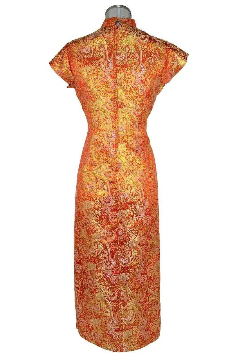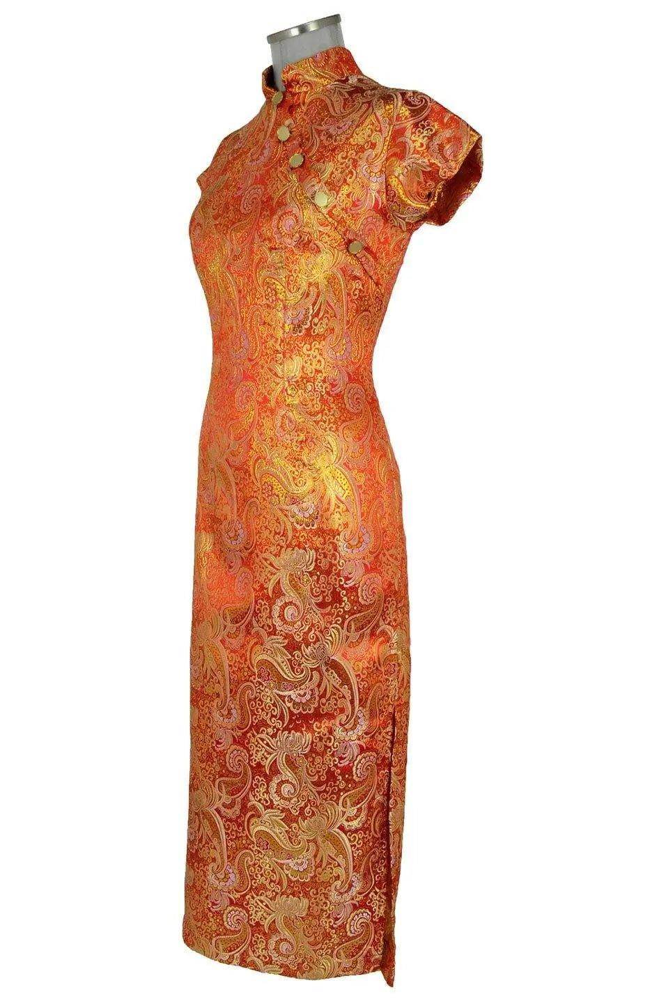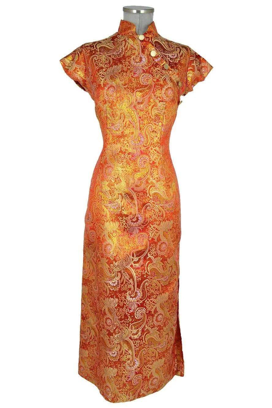 Noleggio bellissimo abito donna ispirato alla Cina, di sapore abbastanza folclorico per un ballo in maschera ma anche abbastanza elegante per una cerimonia o una festa. In tessuto damascato cangiante arancio e oro, ha maniche ad aletta e tipico collo rigido alla cinese con abbottonatura diagonale.