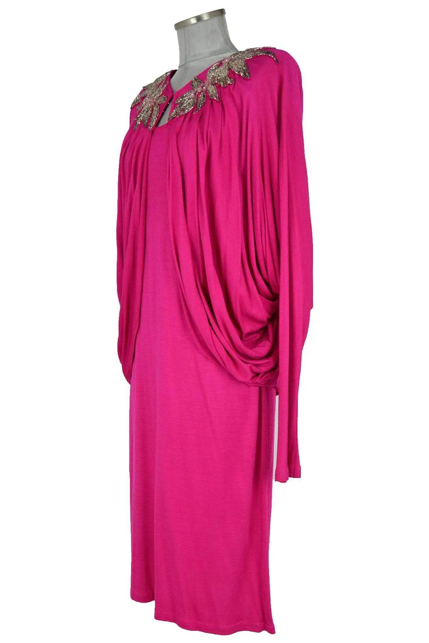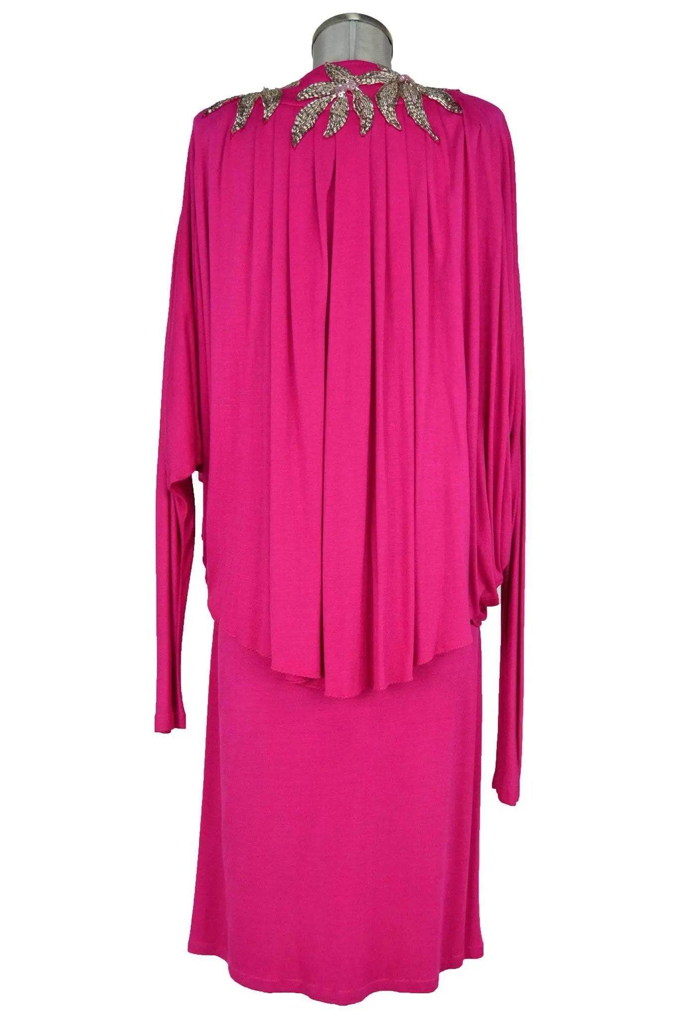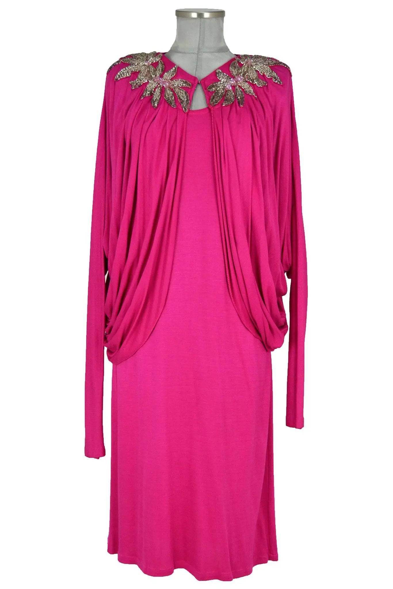 Noleggio abito donna di sapore anni '70 ma anche posteriore, il taglio dell'abito a tubino è neutro mentre la sontuosa giacca rimanda a personaggi del jet-set come la principessa Soraya. Infatti è riccamente drappeggiata e con ricami floreali in paillettes al collo. Per cerimonie, serate, teatro.