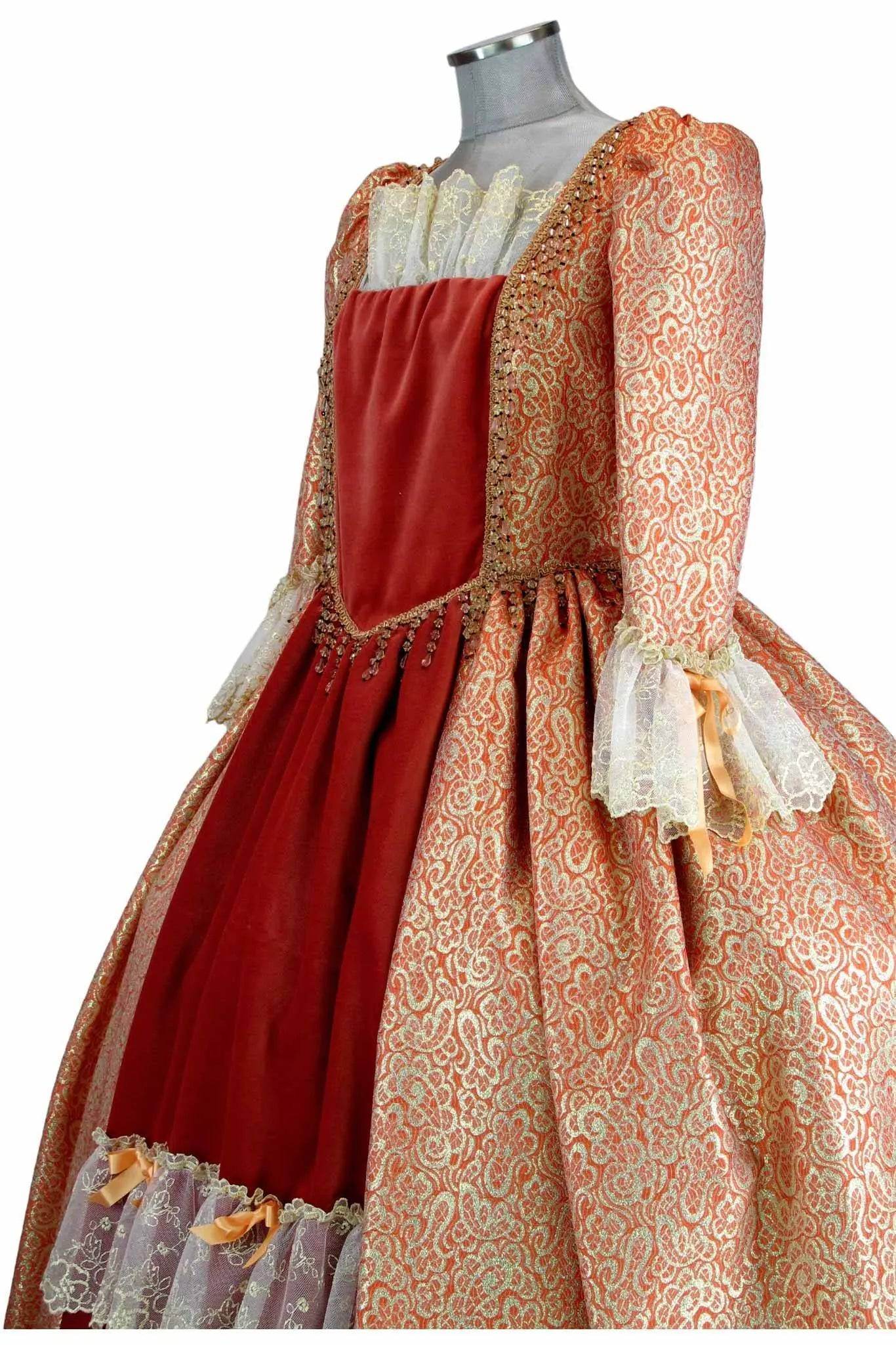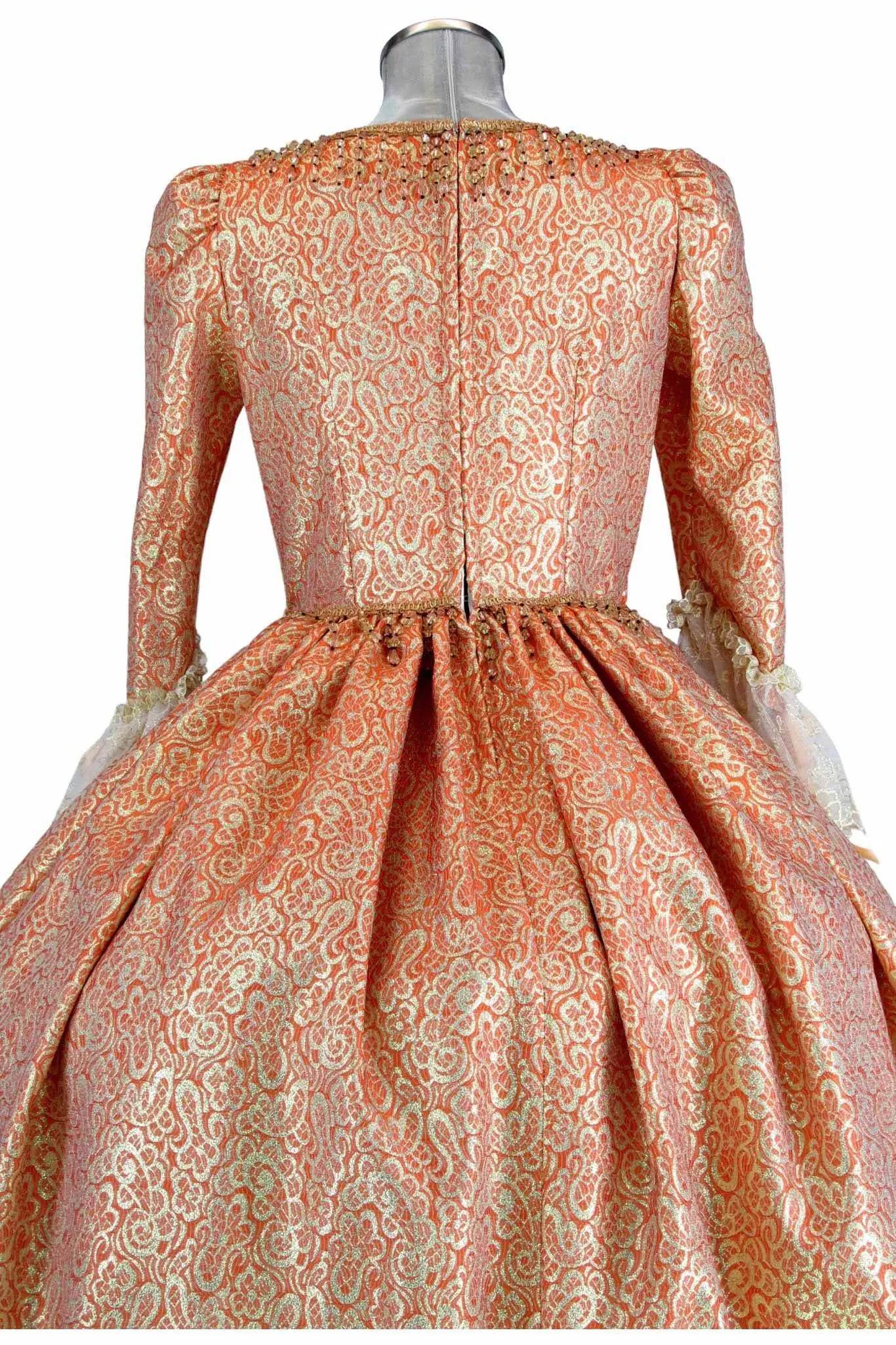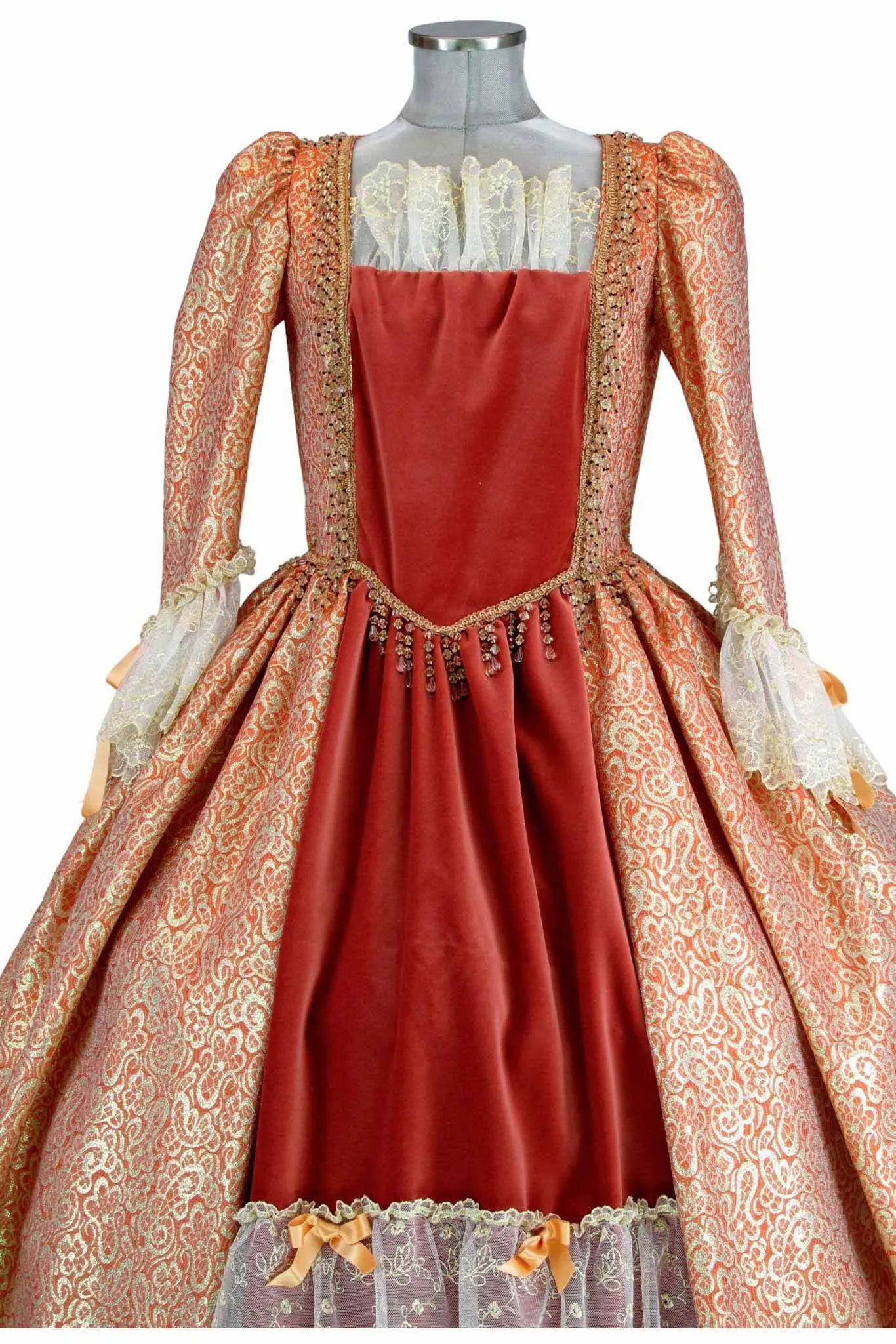 • Design Elegante: Il vestito presenta un intricato motivo dorato su sfondo arancione, con dettagli in pizzo che esaltano la sua bellezza e conferiscono un tocco di autenticità storica.