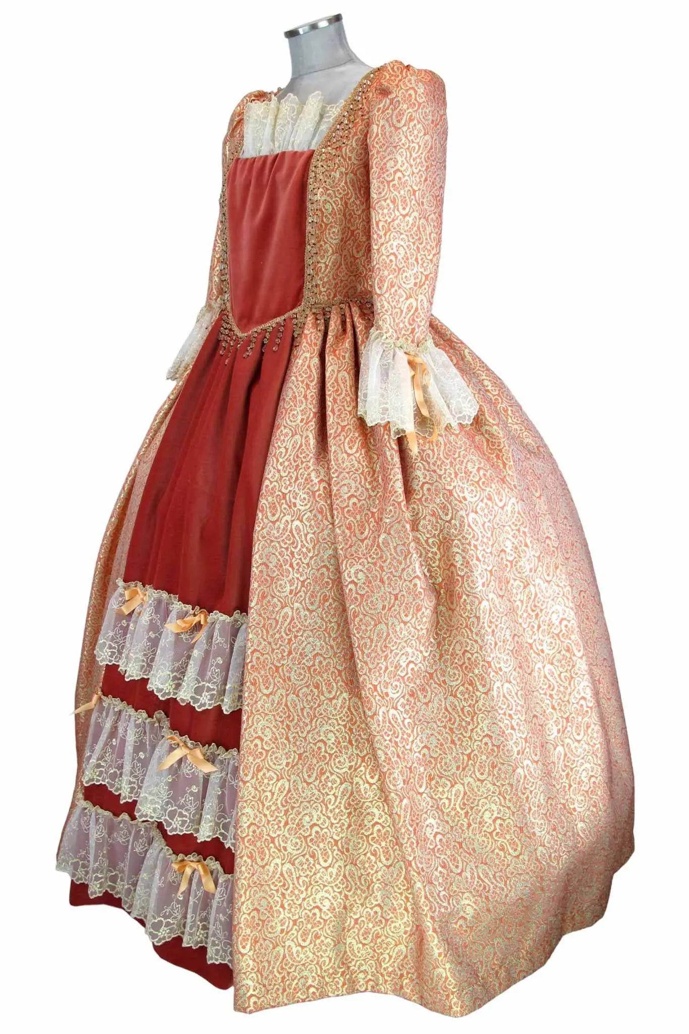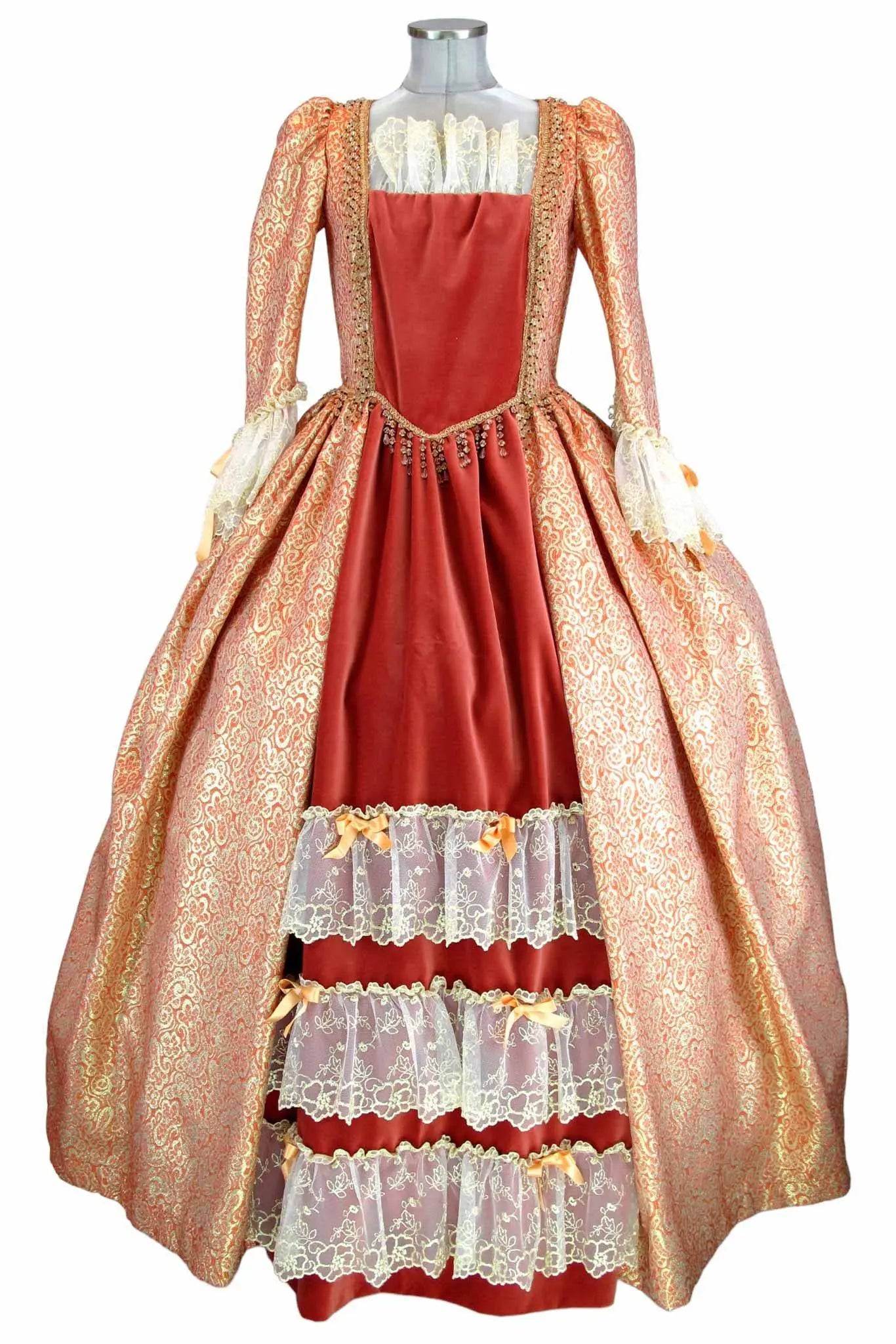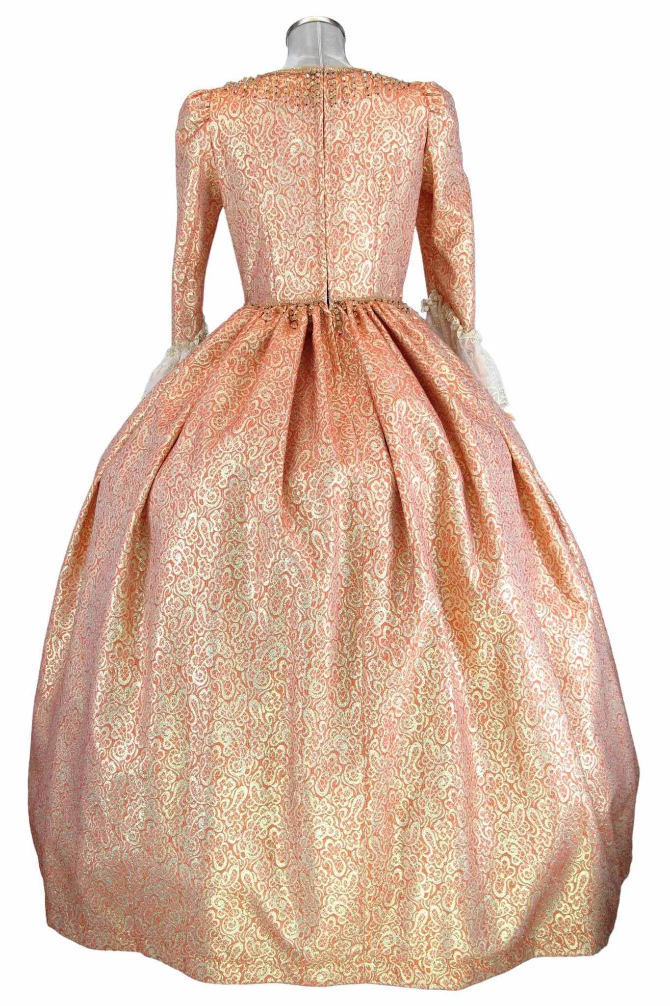 • Design Elegante: Il vestito presenta un intricato motivo dorato su sfondo arancione, con dettagli in pizzo che esaltano la sua bellezza e conferiscono un tocco di autenticità storica.