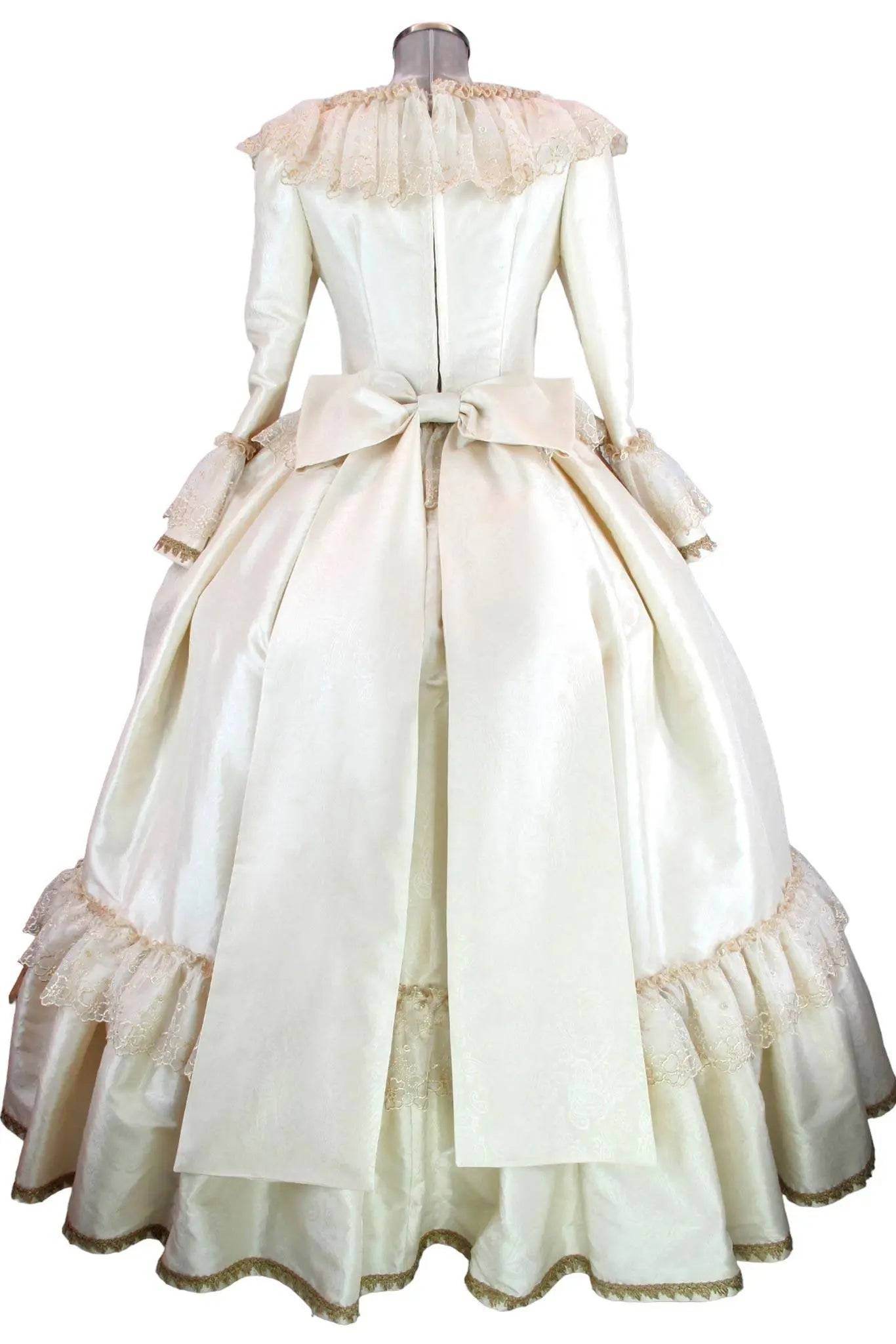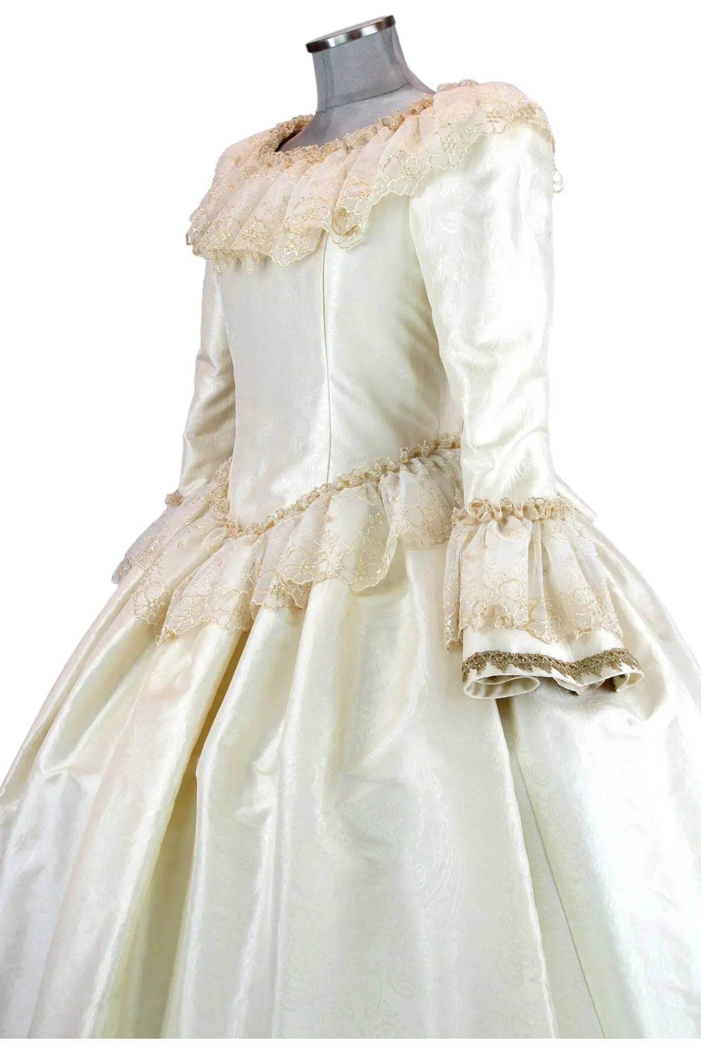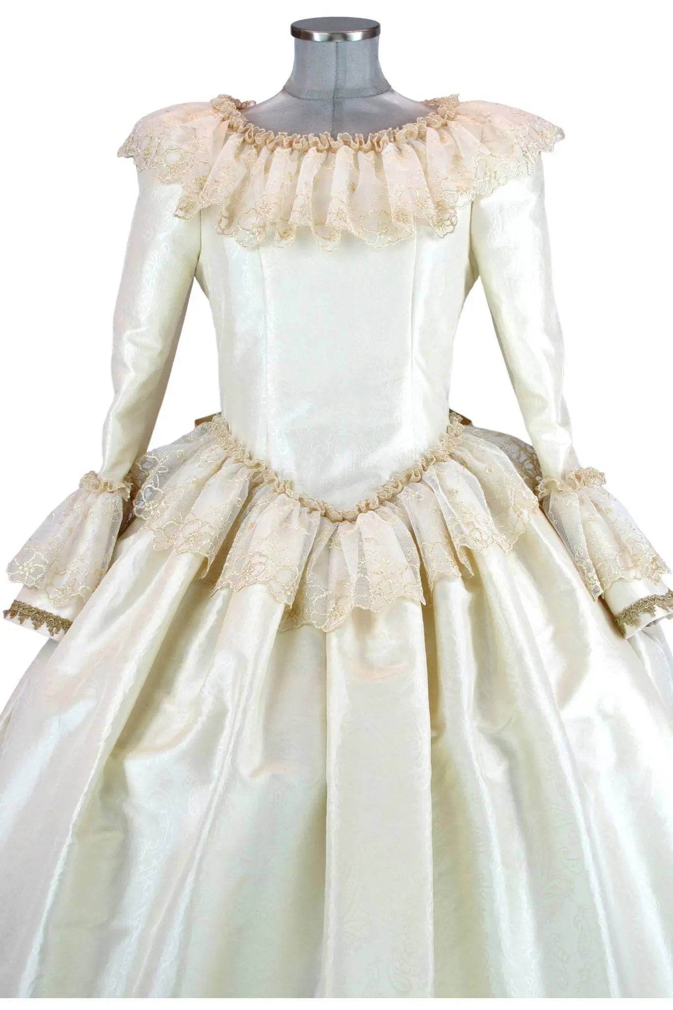 La gonna ampia e voluminosa è decorata con strati di pizzo delicato, che creano un effetto di movimento fluido e grazioso ad ogni passo. Il corpetto, con un'elegante scollatura decorata, valorizza la figura femminile, conferendo un aspetto regale e sofisticato. Le maniche lunghe e leggermente a sbuffo, anch'esse ornate di pizzi, completano il look con un tocco di grazia vintage.