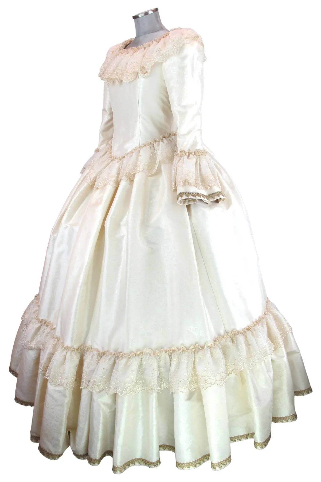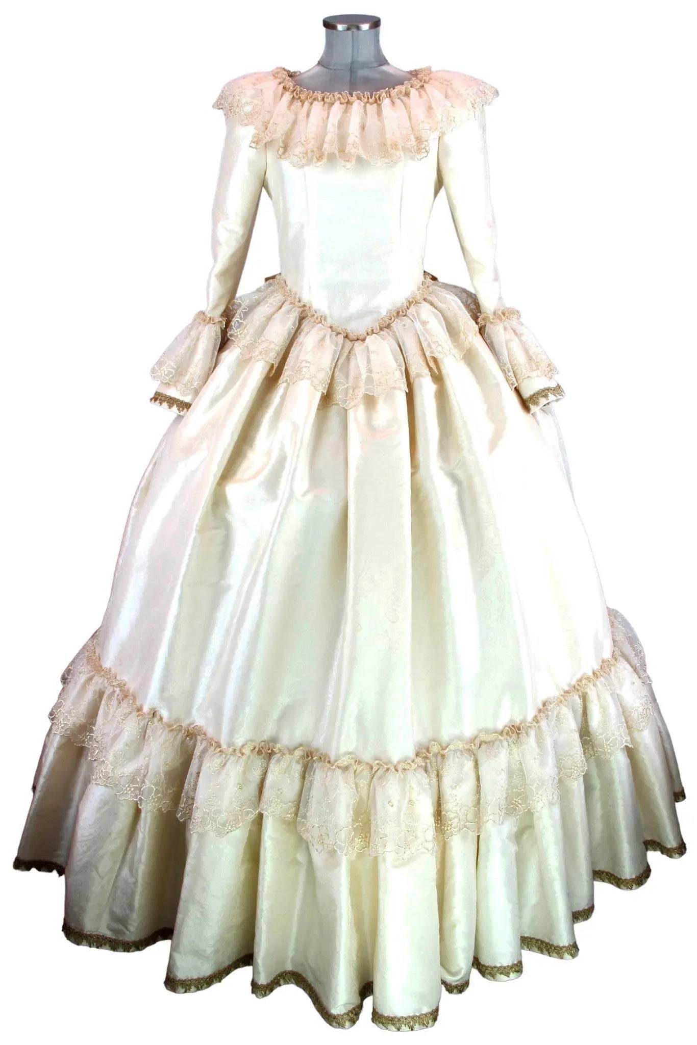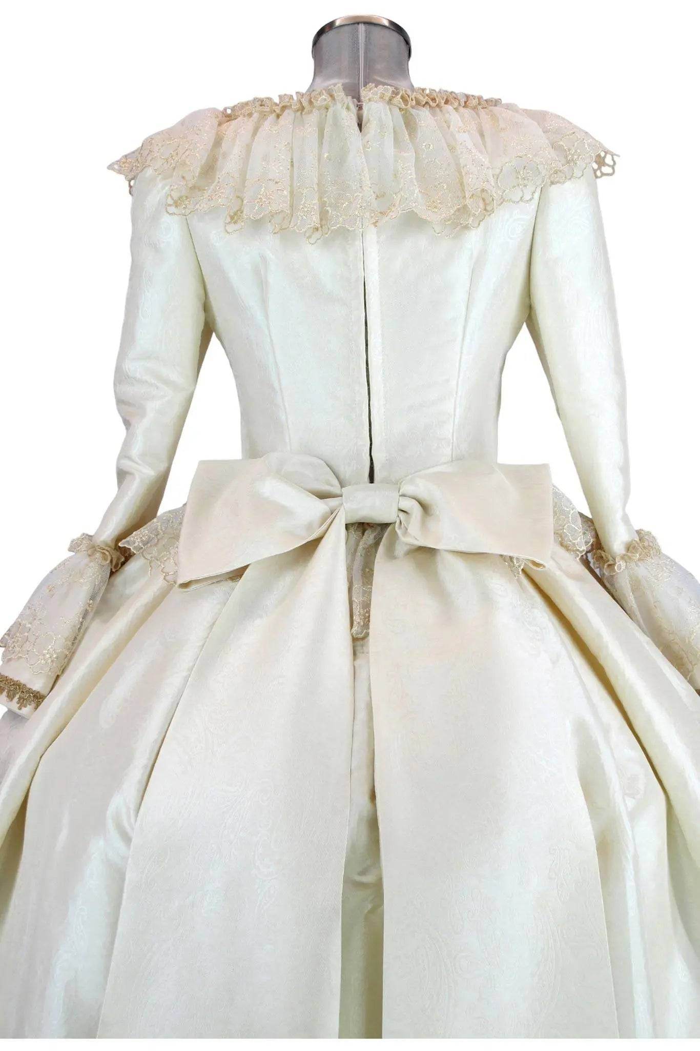 La gonna ampia e voluminosa è decorata con strati di pizzo delicato, che creano un effetto di movimento fluido e grazioso ad ogni passo. Il corpetto, con un'elegante scollatura decorata, valorizza la figura femminile, conferendo un aspetto regale e sofisticato. Le maniche lunghe e leggermente a sbuffo, anch'esse ornate di pizzi, completano il look con un tocco di grazia vintage.