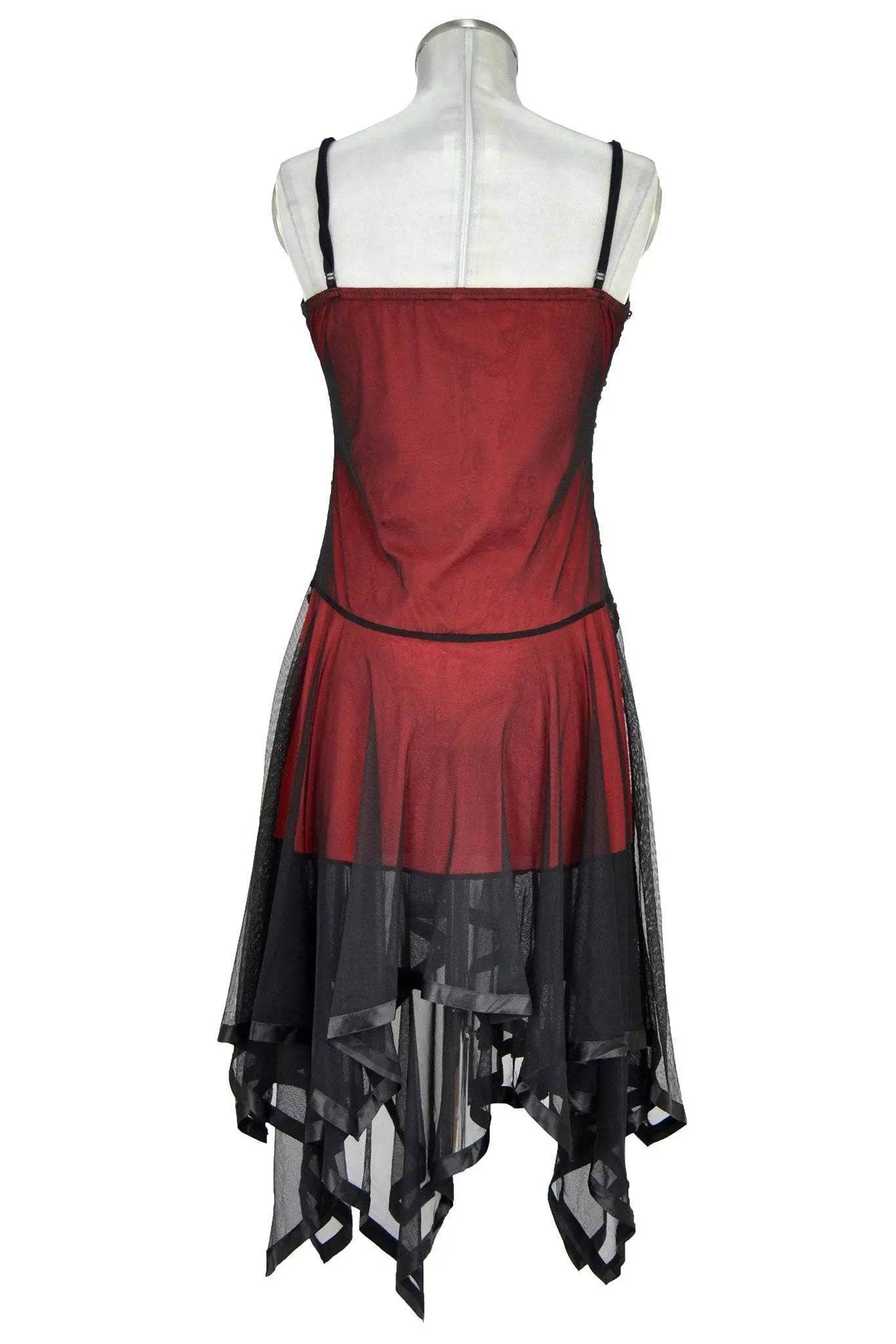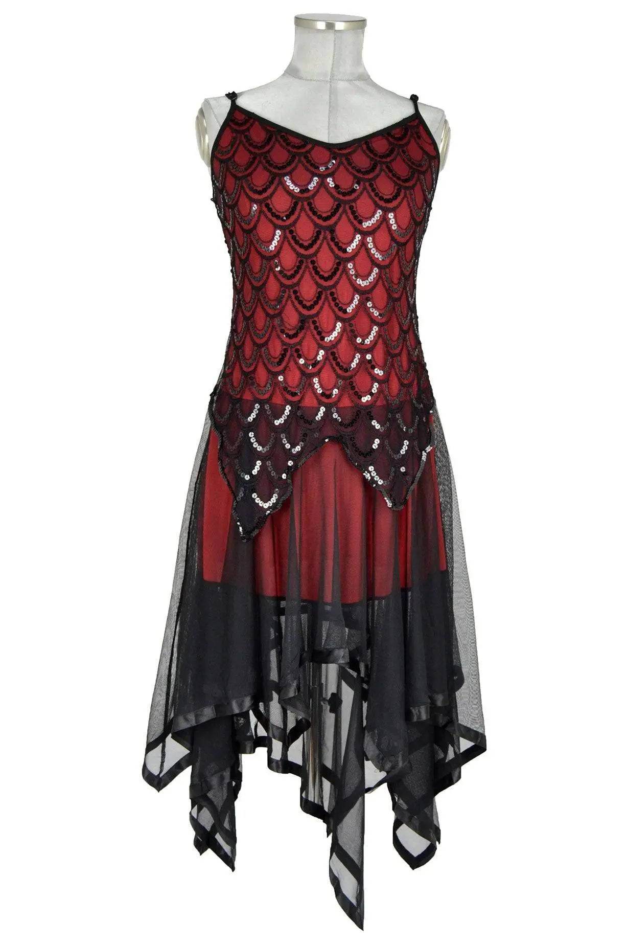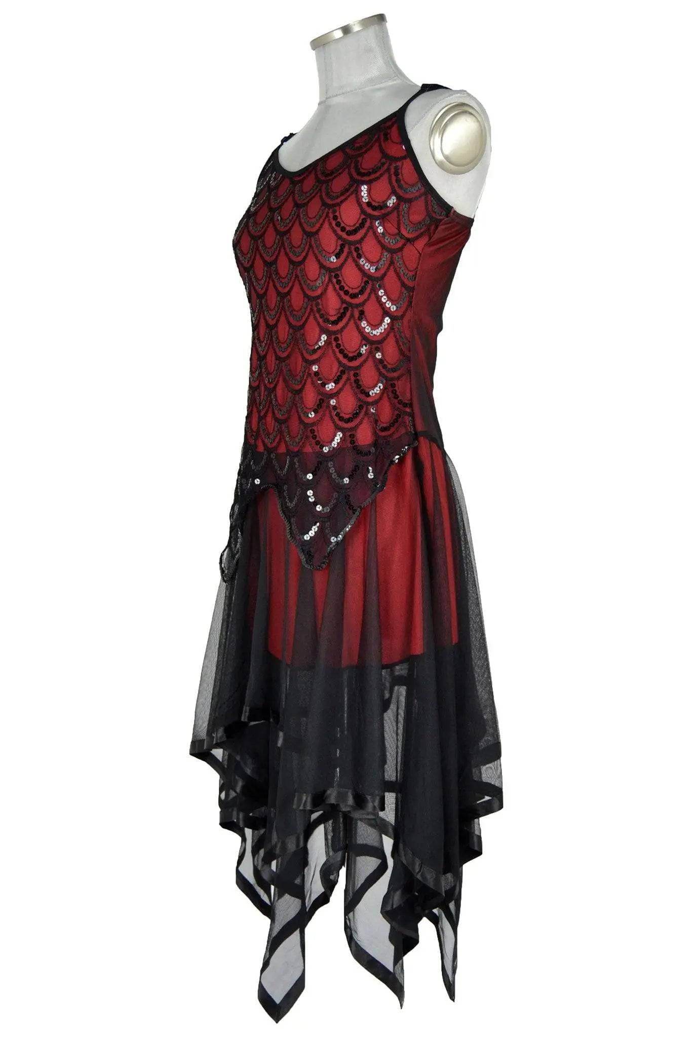 Noleggio abito donna asimmetrico adatto per serate eleganti o come costume per balletti fiabeschi. Sulla fodera in rosso mattone a sottoveste si appoggiano la gonna di velo bordata di raso, a punte quadre, e una tunichetta con ricami di paillettes che ricordano una corazza o le squame di una sirena.