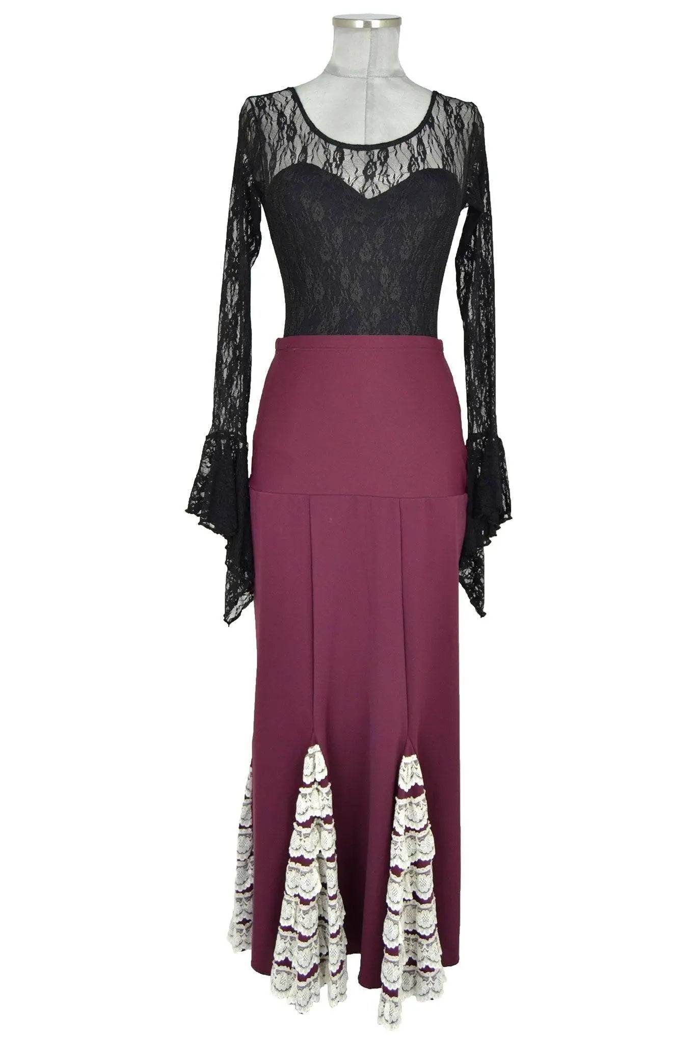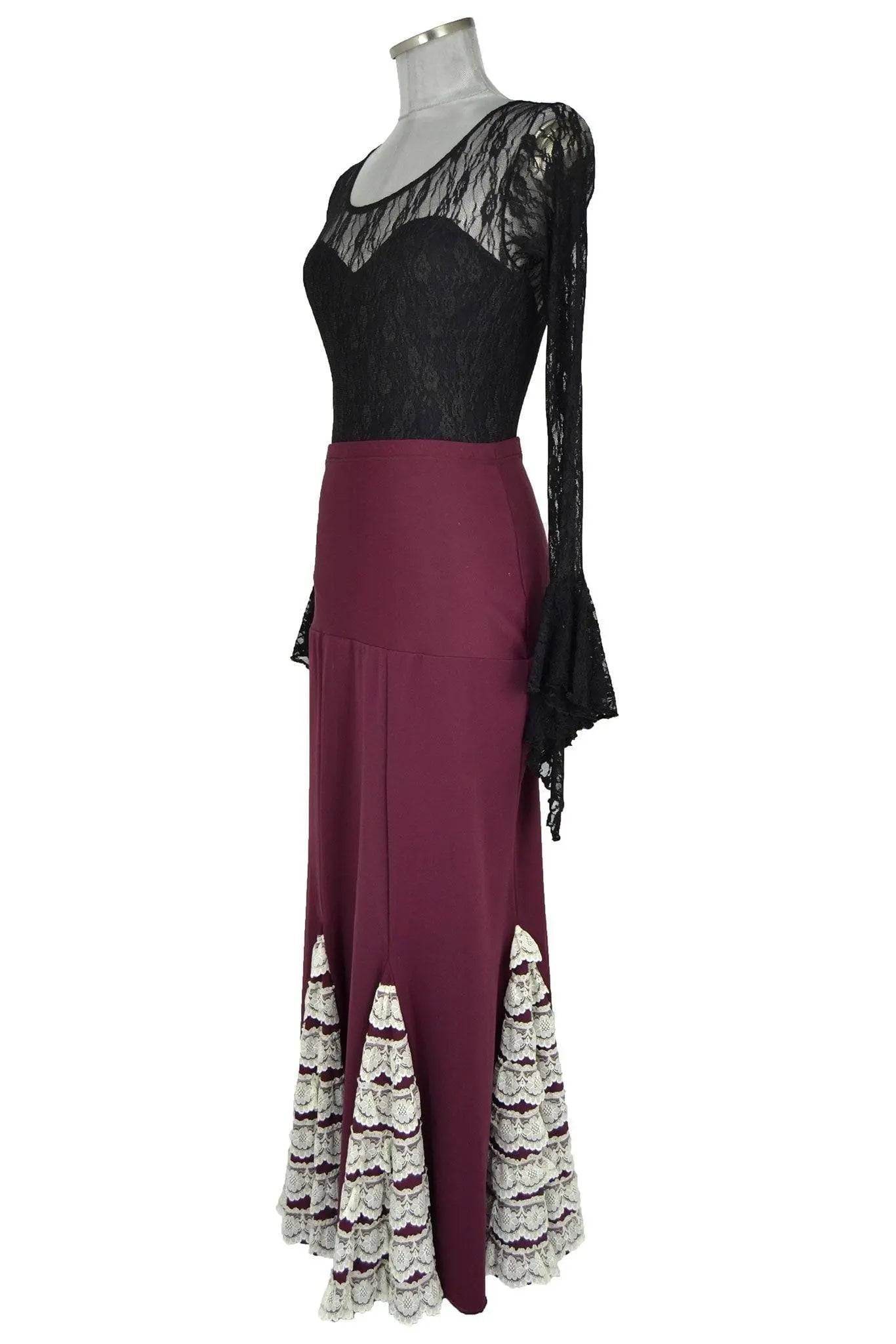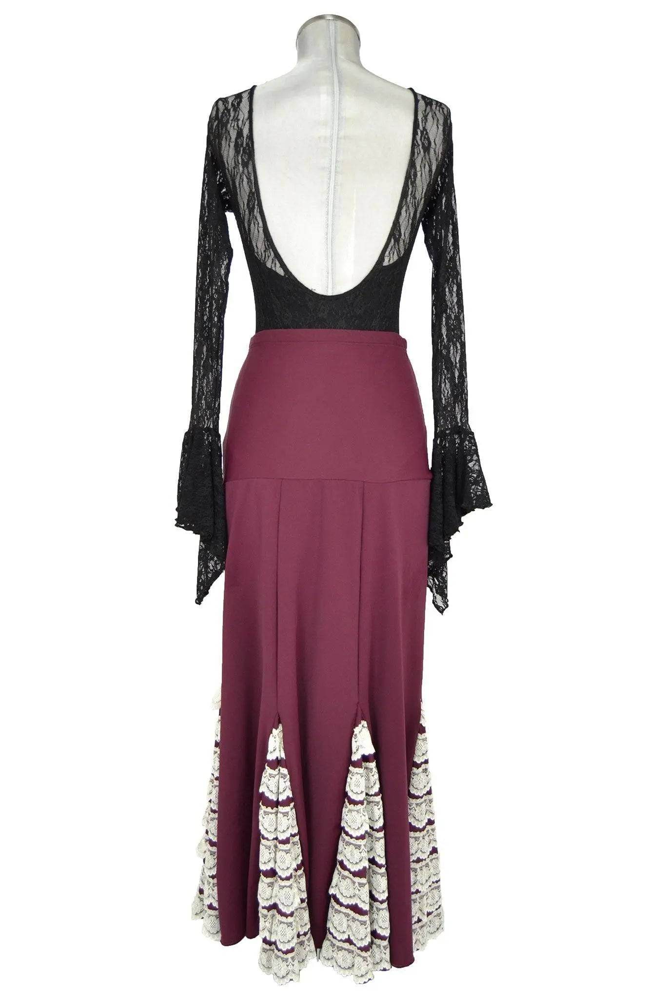 Il completo si compone di un raffinato corpetto in pizzo nero trasparente a maniche lunghe con eleganti svasature sui polsi, dal taglio aderente e sensuale, che lascia scoperta la schiena grazie ad una profonda scollatura posteriore. La gonna, di un caldo tono bordeaux, lunga e svasata, presenta inserti in pizzo bianco decorativo che richiamano le tipiche balze a volants del tradizionale abito flamenco. Questo dettaglio non è solo estetico, ma valorizza il movimento, rendendo ogni passo di danza fluido e scenografico.