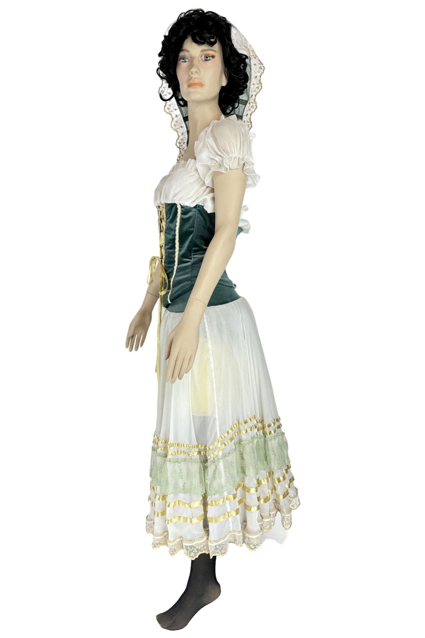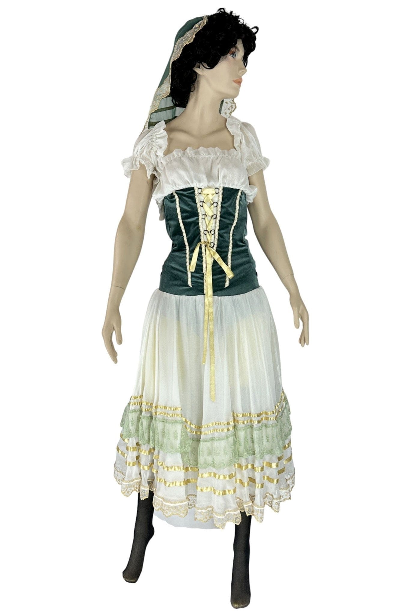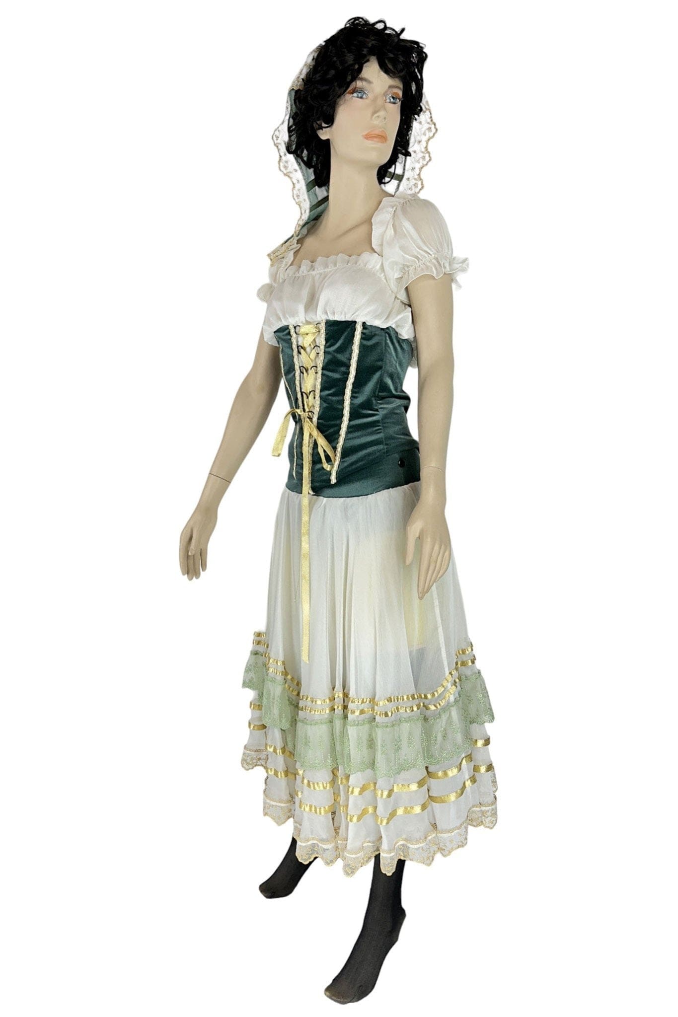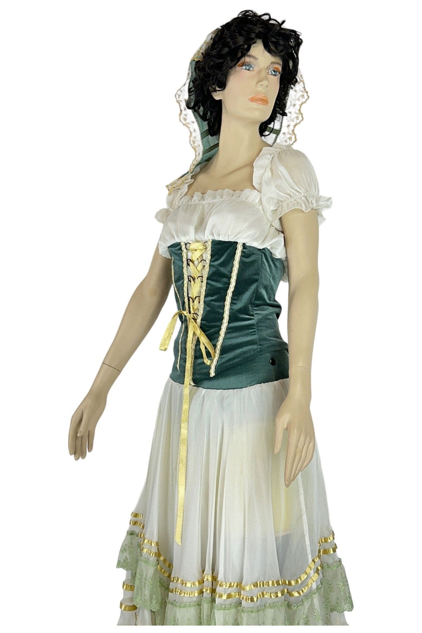 • Design: Il design dell'abito presenta un corpetto aderente in velluto verde con lacci dorati che accentuano la vita, una camicia bianca con maniche a sbuffo e una gonna ampia con dettagli in pizzo e nastri. Il copricapo coordinato completa il look tradizionale.