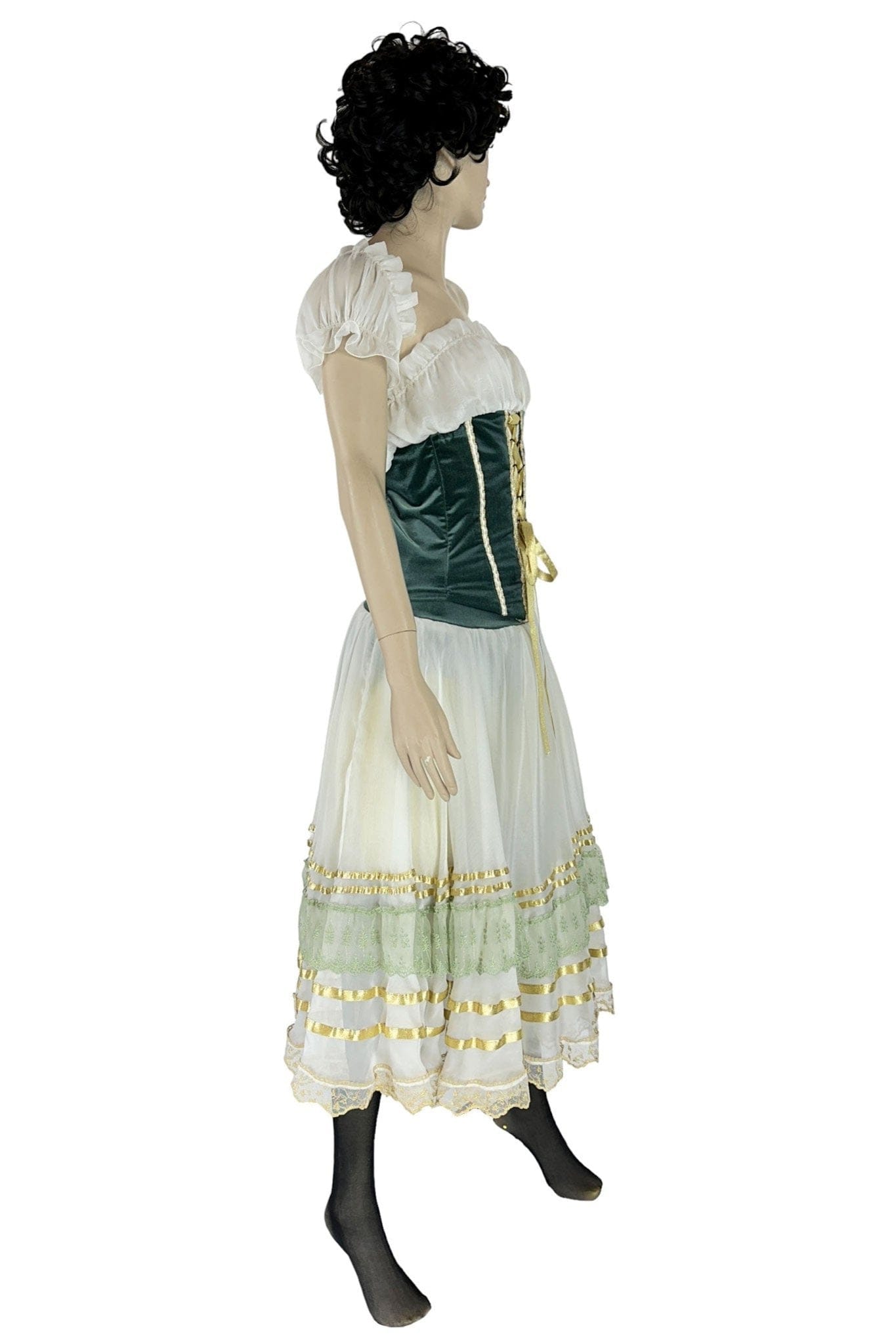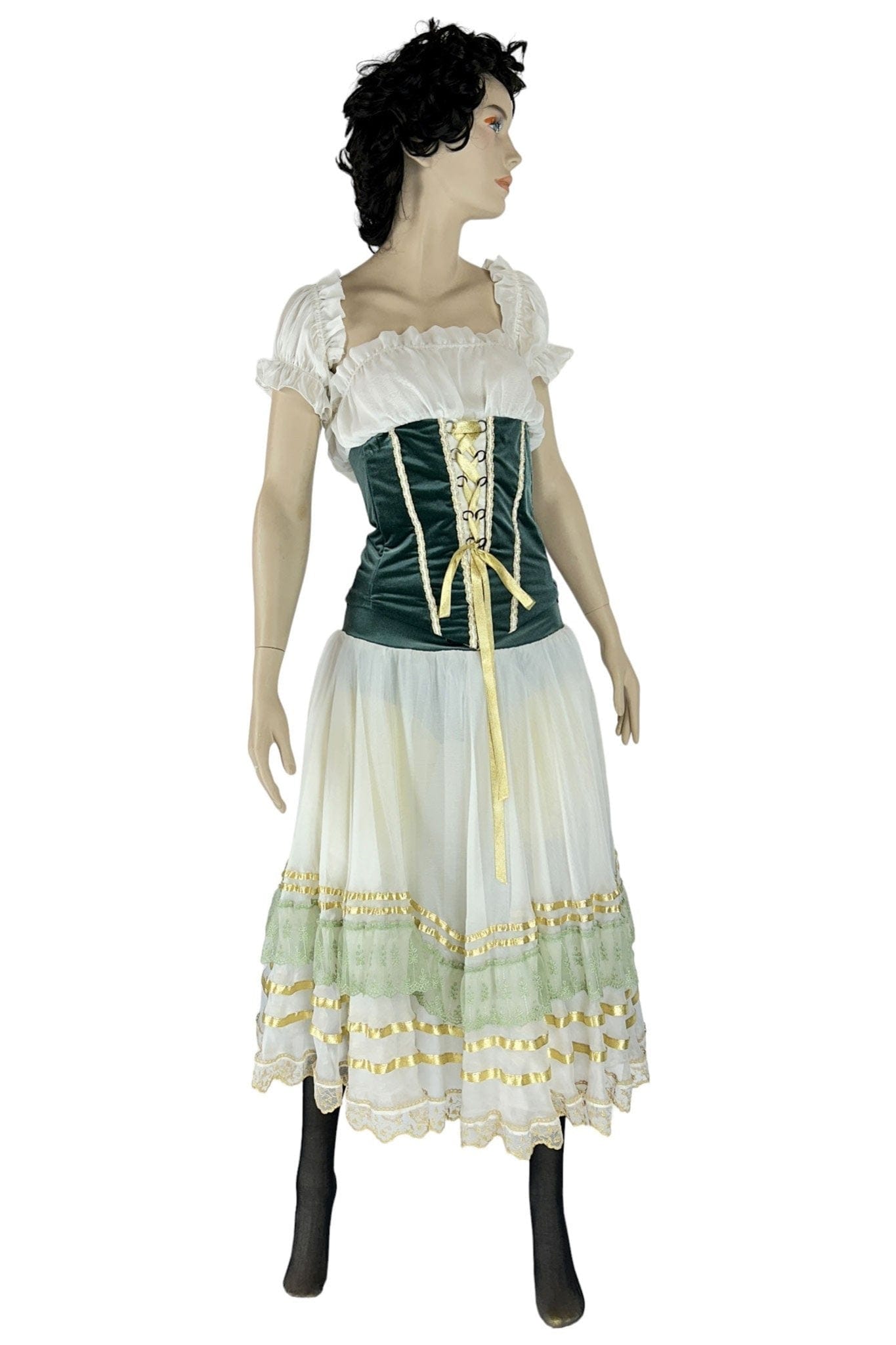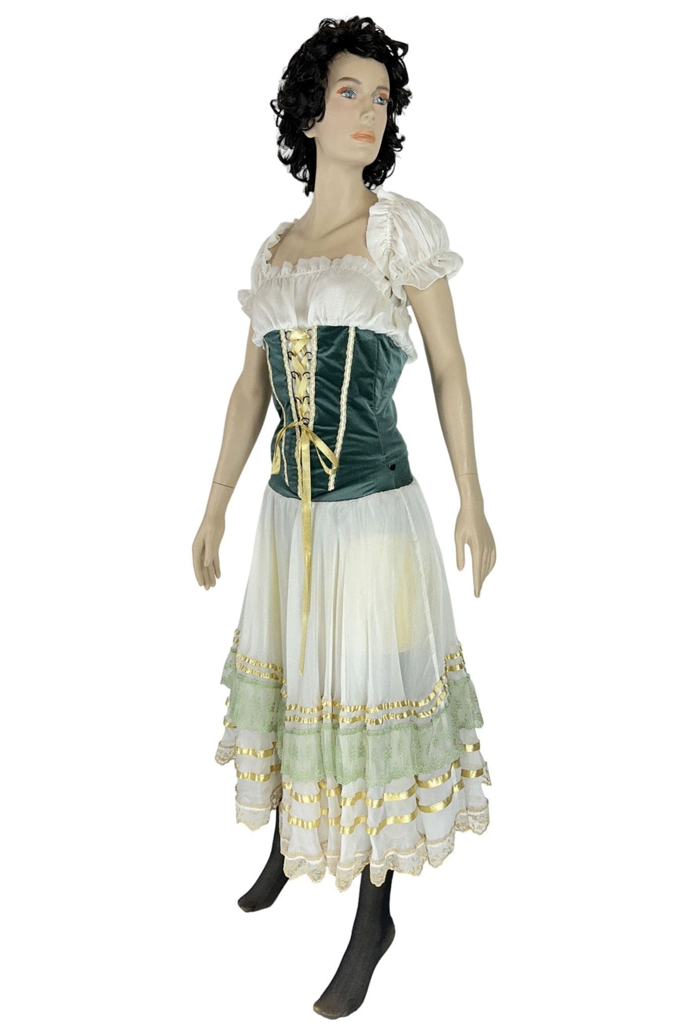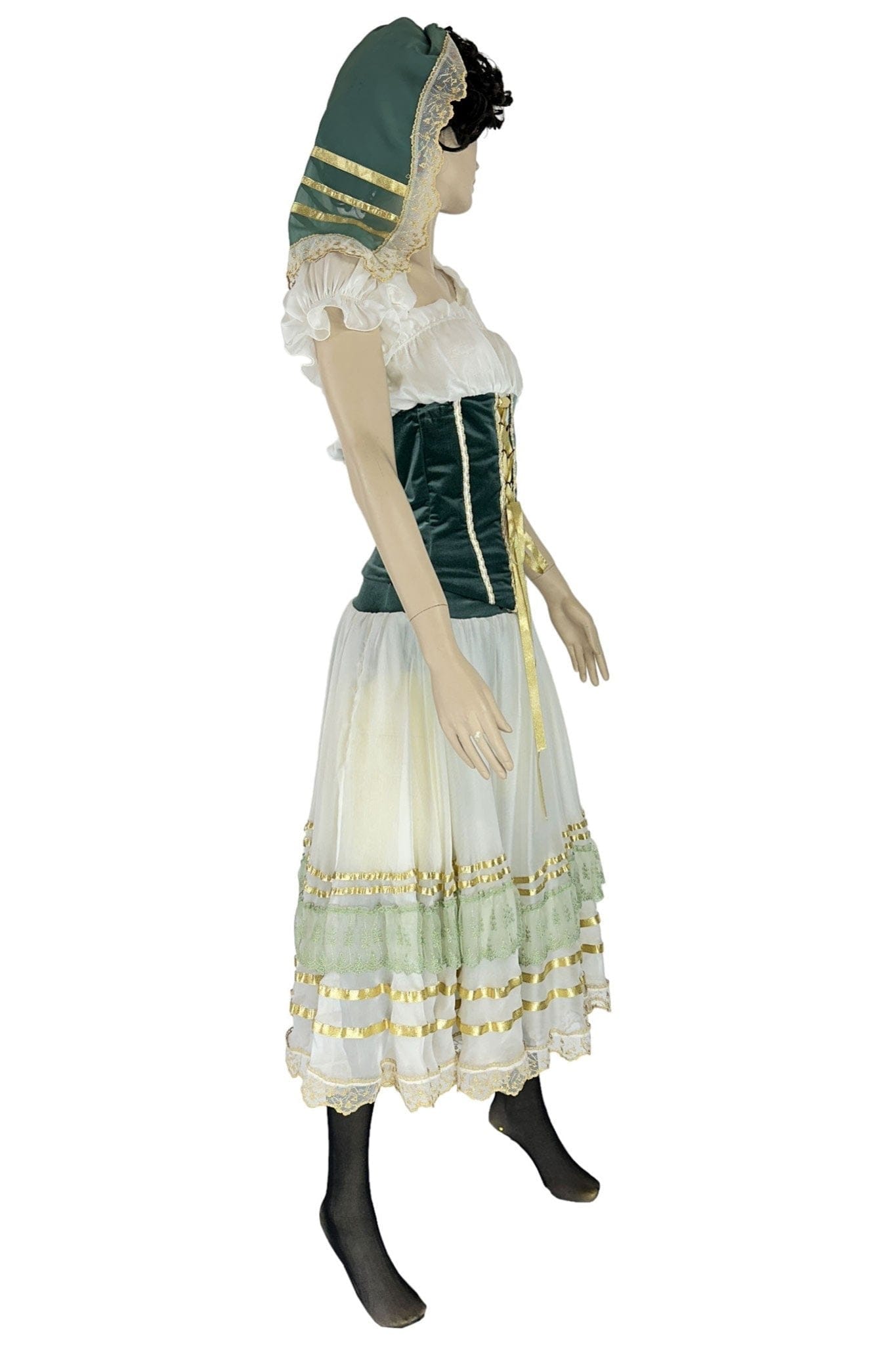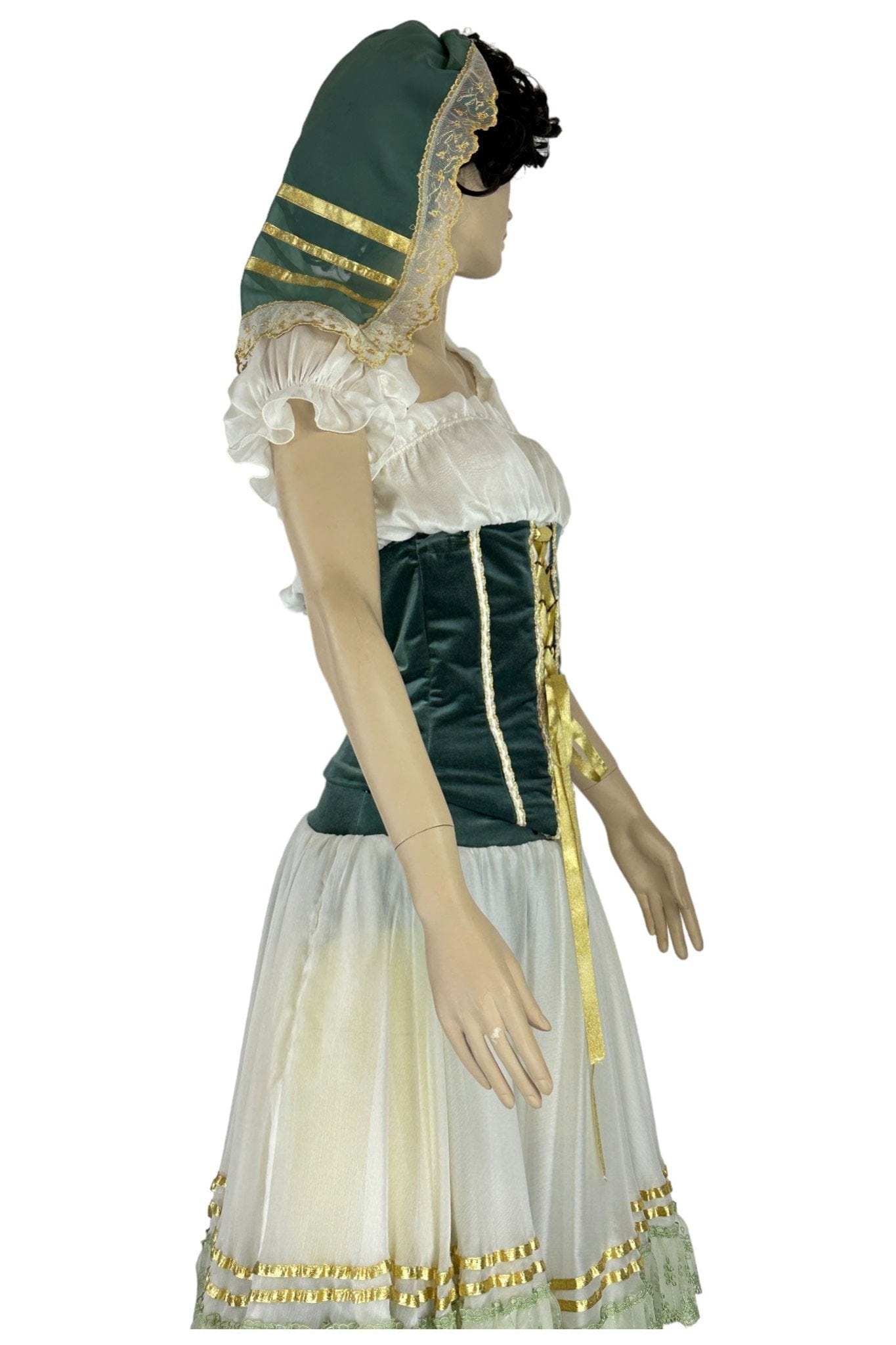 • Design: Il design dell'abito presenta un corpetto aderente in velluto verde con lacci dorati che accentuano la vita, una camicia bianca con maniche a sbuffo e una gonna ampia con dettagli in pizzo e nastri. Il copricapo coordinato completa il look tradizionale.
