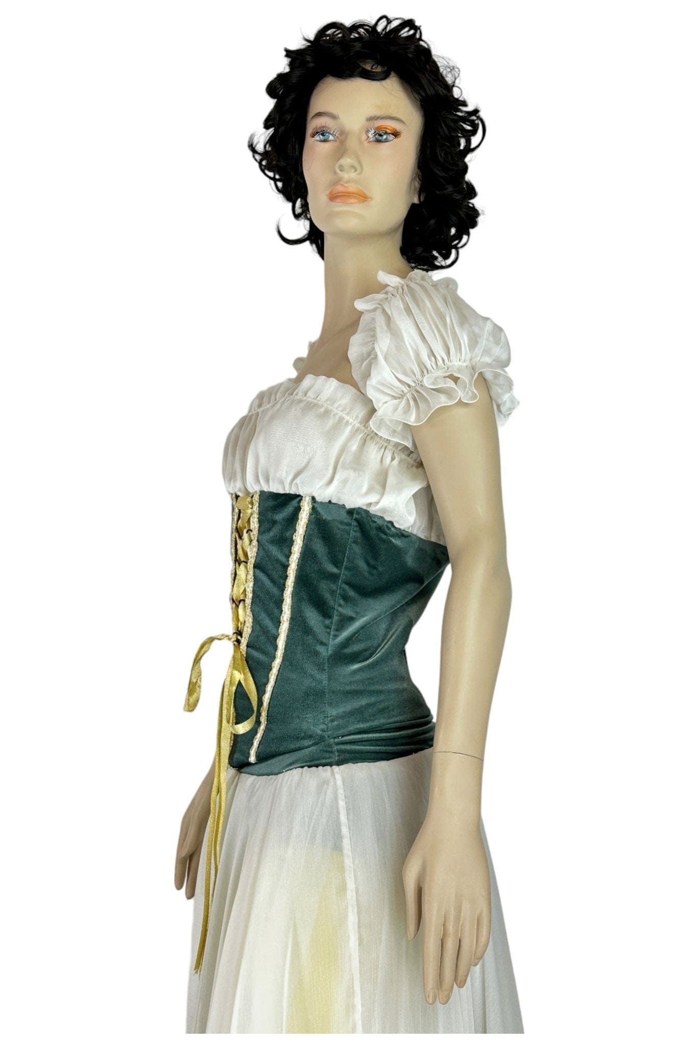 • Materiale: L'abito è realizzato in velluto verde di alta qualità per il corpetto e in tessuto leggero bianco per la gonna, offrendo una combinazione perfetta di eleganza e comfort. Le decorazioni in pizzo e i nastri gialli aggiungono un tocco di raffinatezza e autenticità.