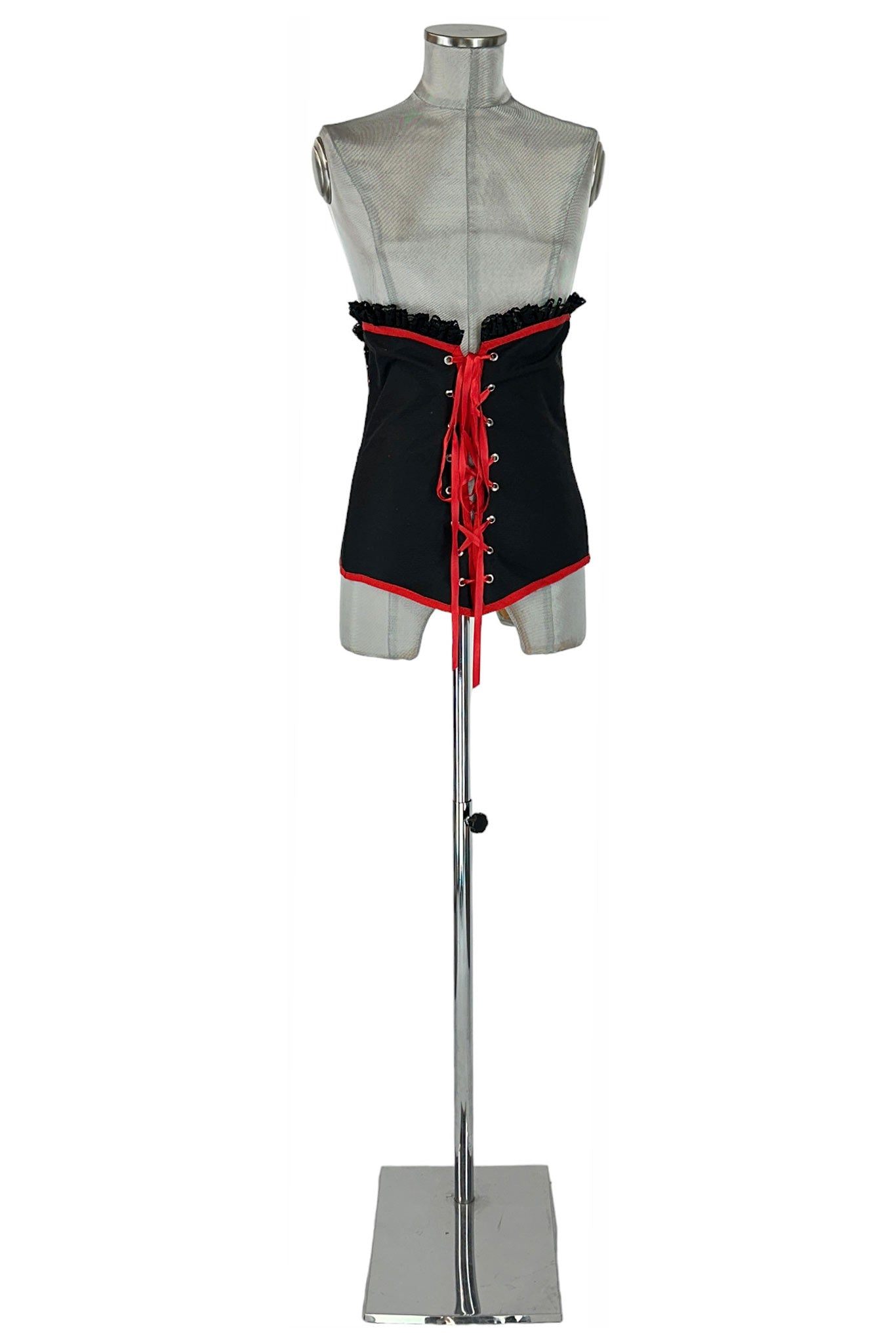 Il corsetto è realizzato in tessuto nero di alta qualità, con dettagli in pizzo lungo il bordo superiore e nastri rossi che aggiungono un tocco di colore e contrasto. La chiusura a corsetto con nastri rossi permette di regolare la vestibilità, garantendo comfort e una silhouette affusolata. Il design unico e i colori audaci rendono questo corsetto un pezzo versatile che può essere abbinato a diversi outfit per varie occasioni.