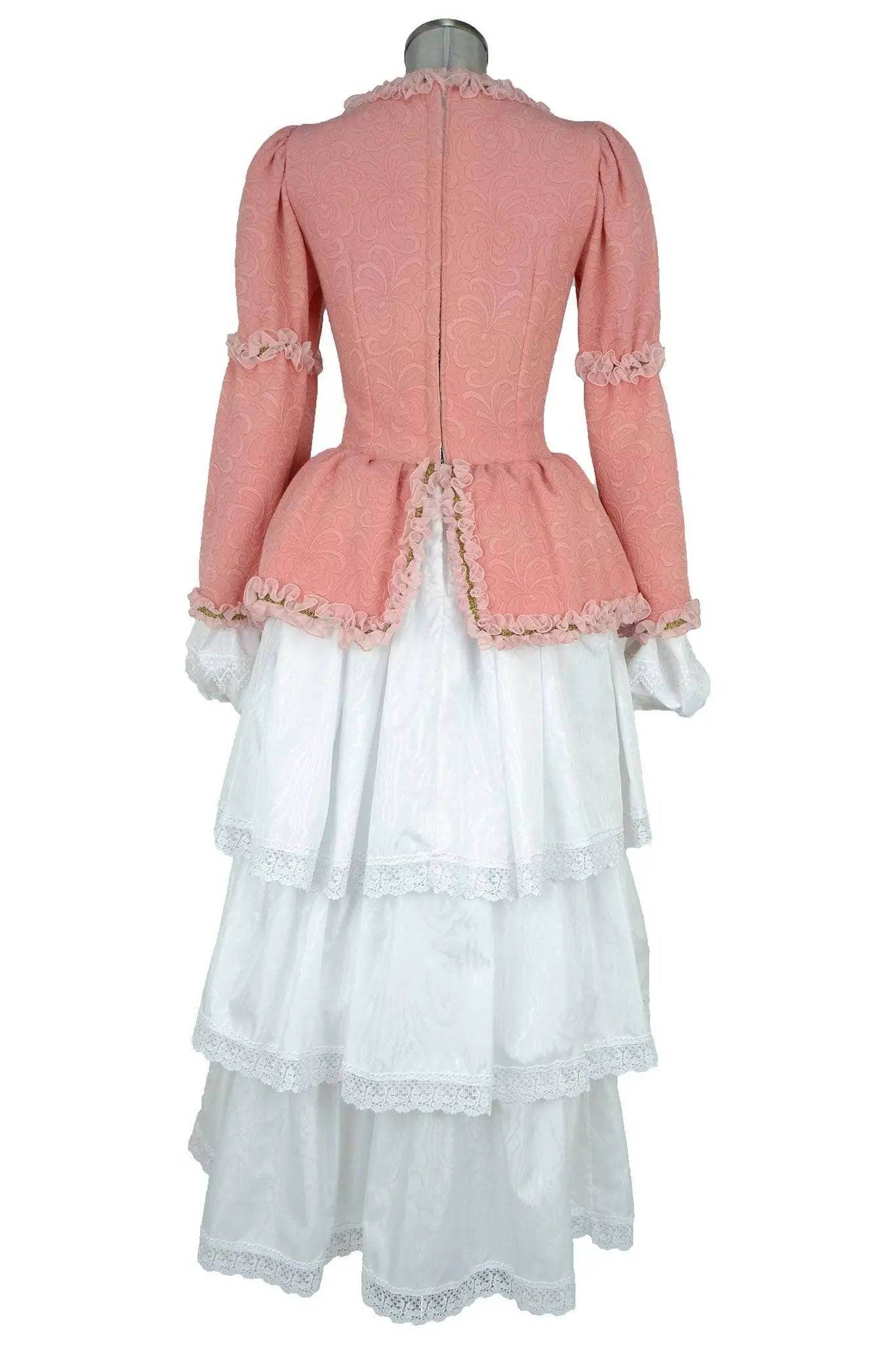 Noleggio Abito donna tipo '700 o carnevale veneziano che alterna il bianco e il rosa. La sua caratteristica sono i vari strati che compongono la gonna leggera, con inserti di nastri colorati e pizzi. Il corpino dalle ricche bordure di volant simula la giacchetta che si indossava sopra il bustino, qui ricreato da bande di merletto. Per personaggio di Colombina