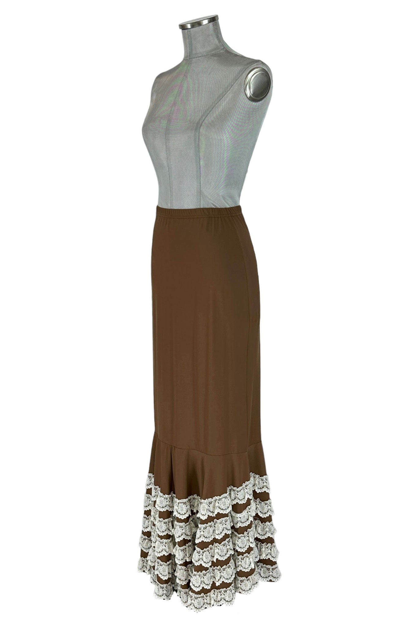 1. Design Elegante e Raffinato: Il design della gonna marrone con balze in pizzo bianco la rende un pezzo unico e sofisticato, perfetto per chi ama lo stile vintage.