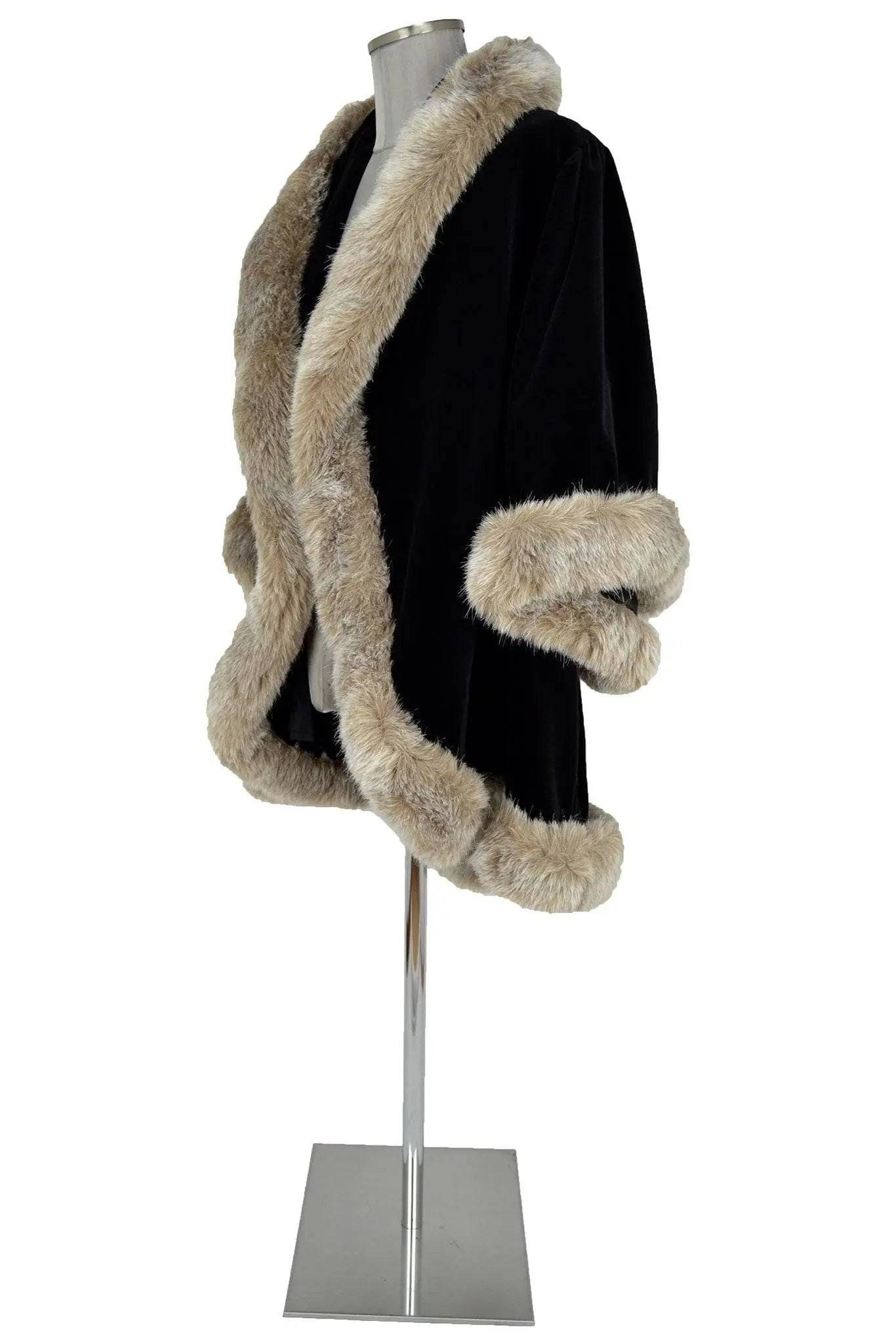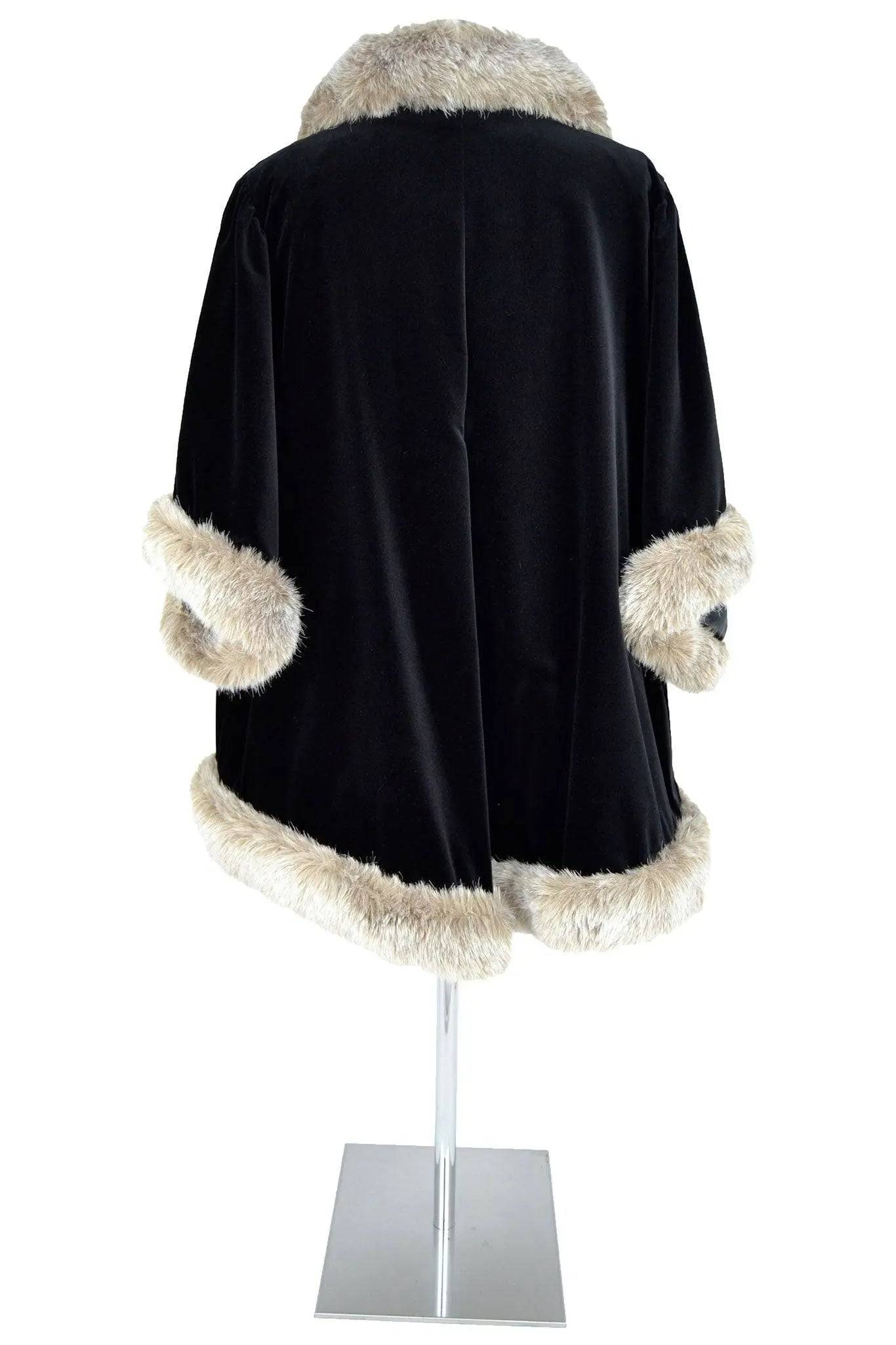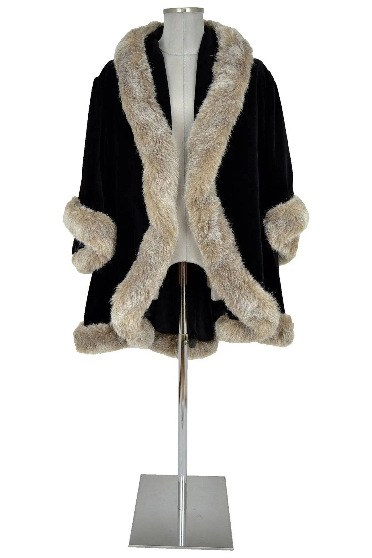 Soprabito corto con collo a scialle, maniche ampie e stondatura dei lembi anteriori. Realizzato in ottima stoffa nera, presenta bellissime bordure in morbida eco-pelliccia in colore contrastante. Da usare per una serata elegante, o per interpretare personaggi del bel mondo, anche travestimenti.