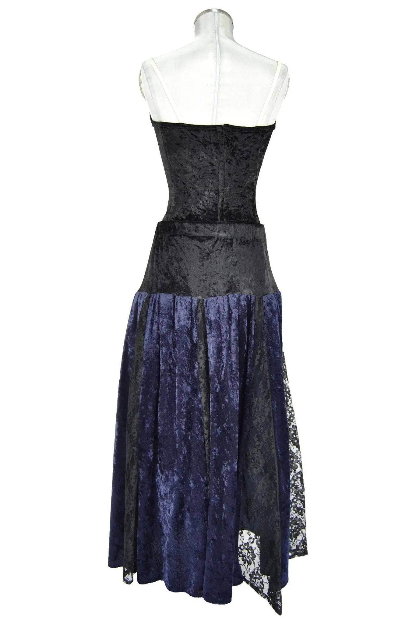 Noleggio Abito donna per Carnevale, Halloween, feste gothic o steampunk, composto da classico bustino in velluto martellato nero con spalline e finta scollatura color carne, e gonna lunga con base pure in velluto martellato nero e viola. Bello il contrasto tra il velluto viola e gli inserti in pizzo nero trasparente