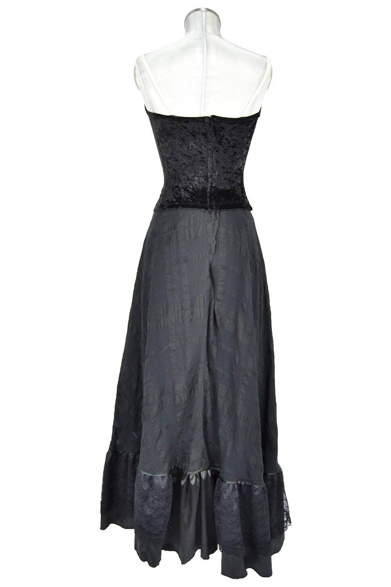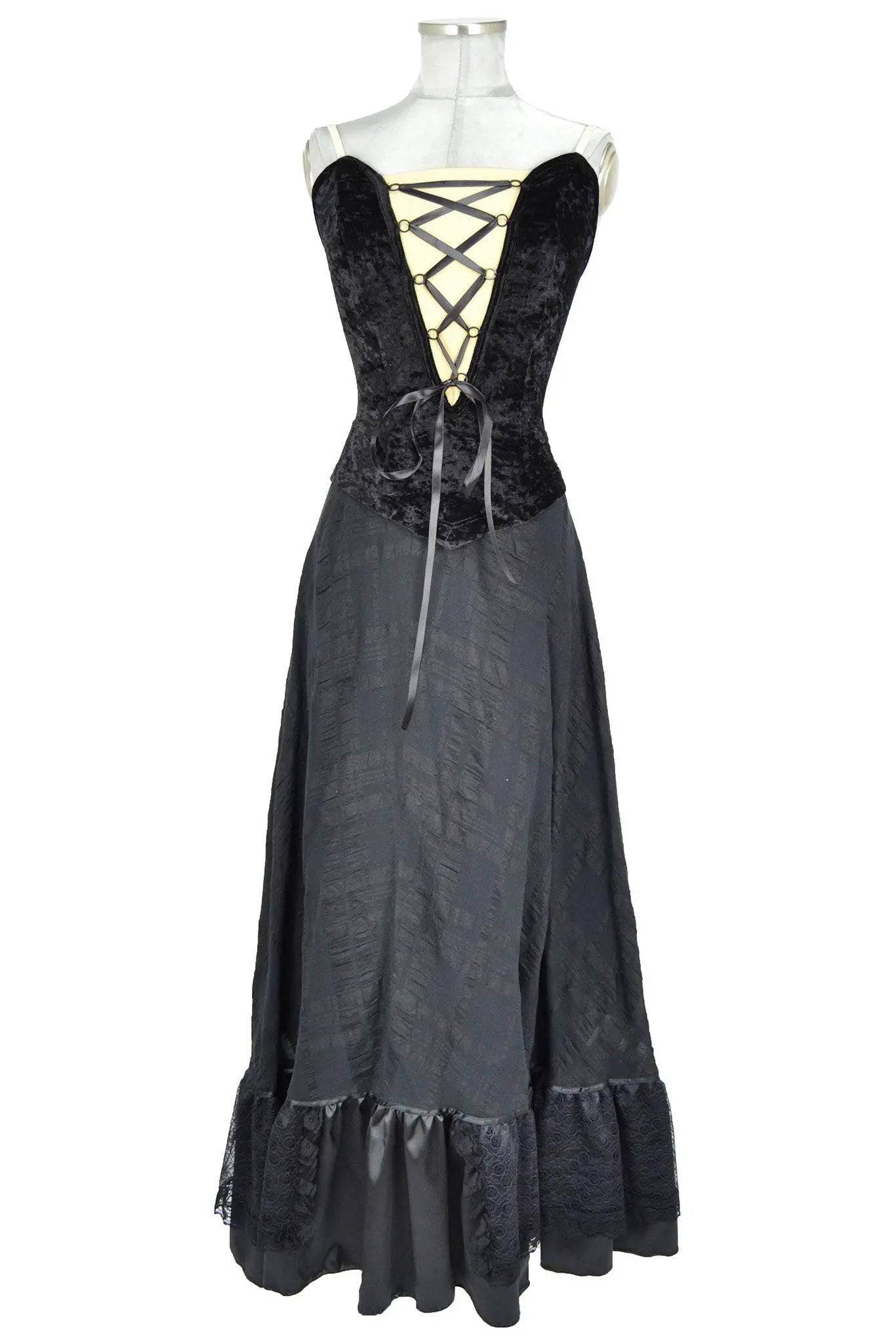Noleggio abito vittoriano donna utilizzabile anche per feste stile gothic-vampiresco, così com'è o con giacchino o mantello. Il bustino, con falsa scollatura stringata i cui nastri passano in comodi anelli, è in velluto martellato mentre la gonna lunga è in tessuto a riquadri lucidi con balza in raso e merletto.