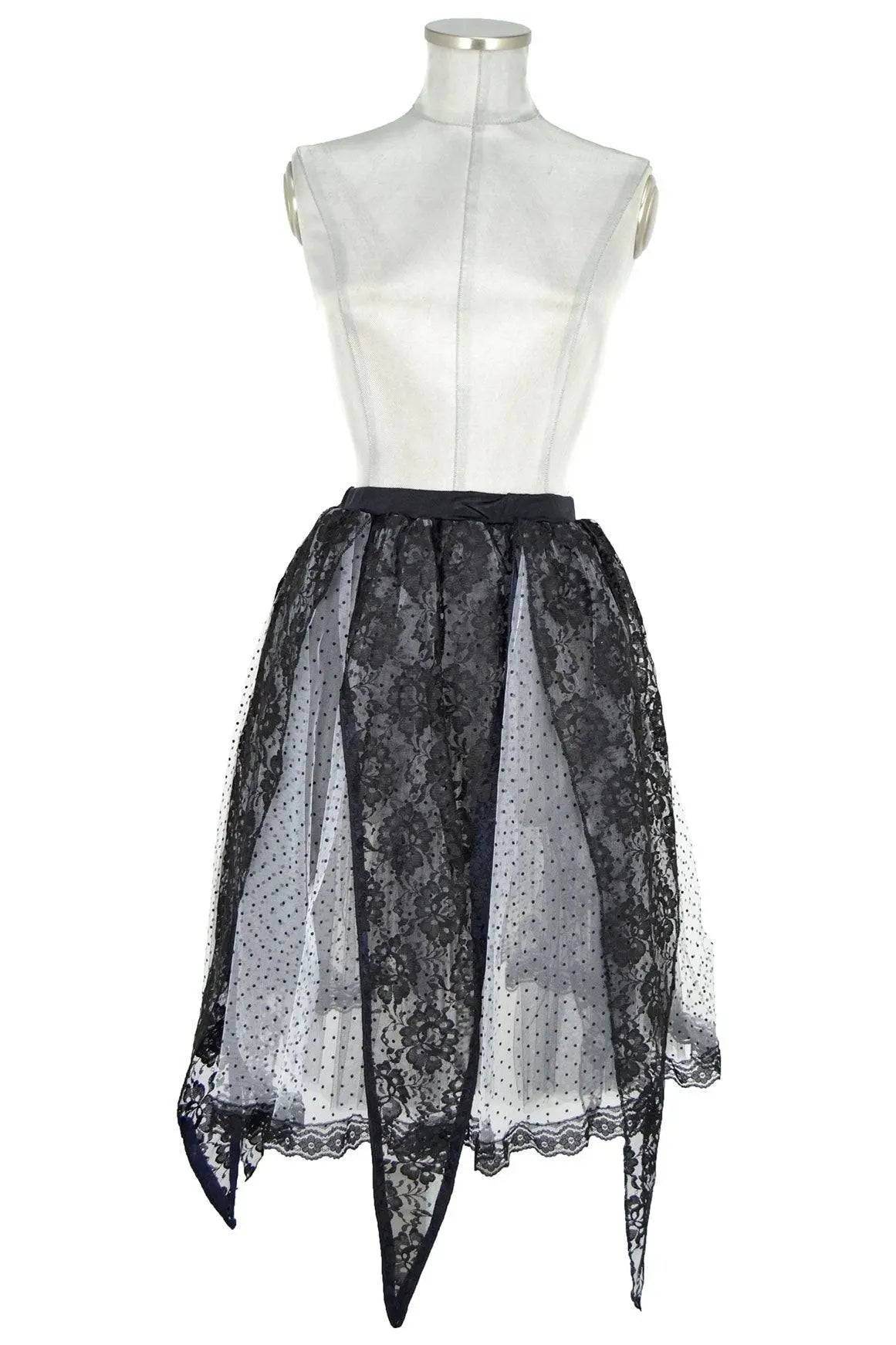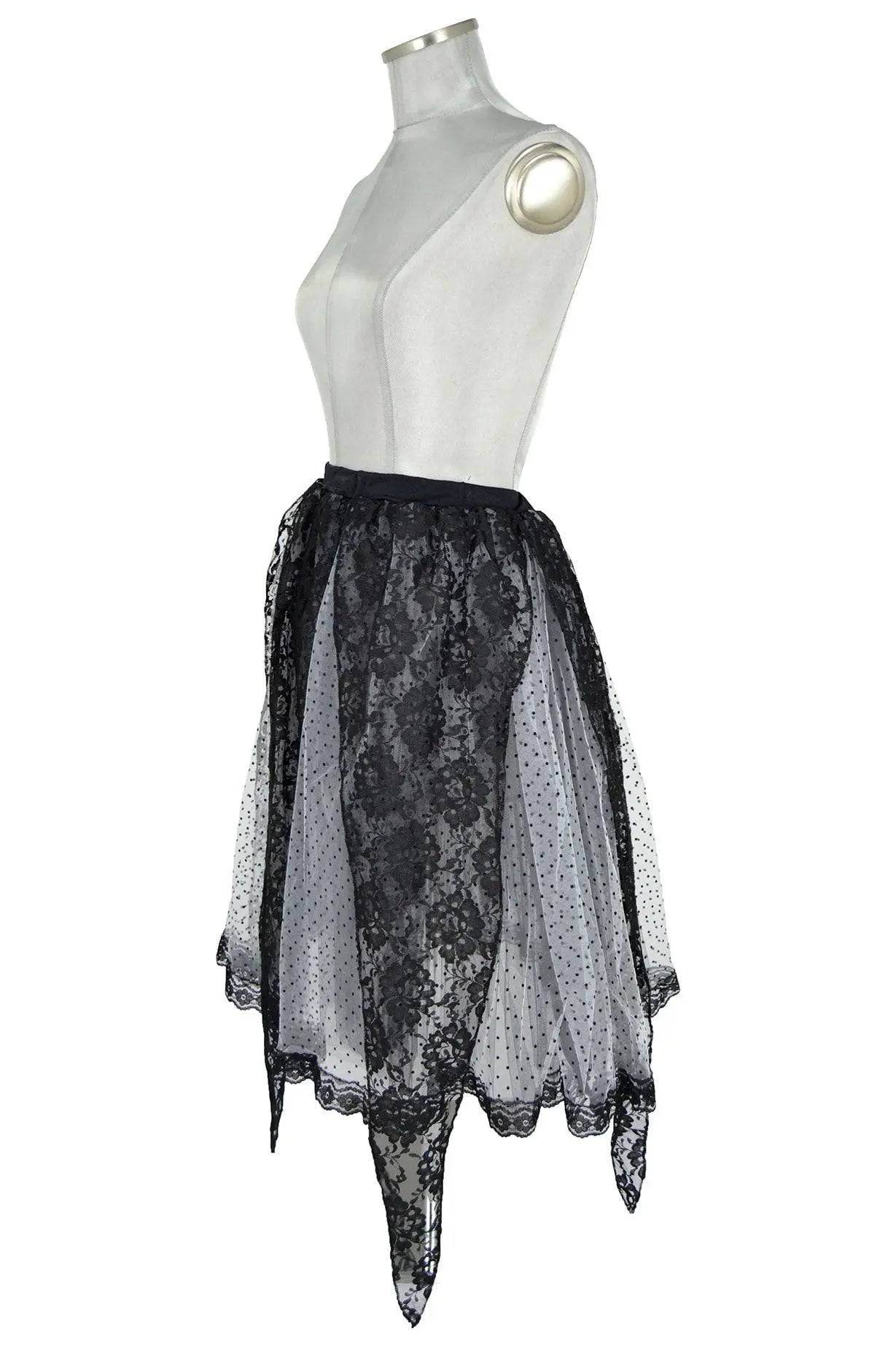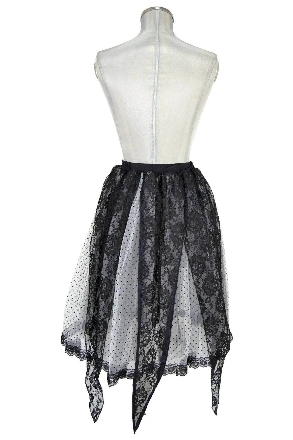 Noleggio abito con gonna romantica che suggerisce con lo strato a pois un personaggio buono e ingenuo, con gli spicchi di pizzo nero invece una personalità fatta di ombre, legata alla magia e al mistero. La gonna semitrasparente è orlata in pizzo e i grandi petali sono in merletto a disegni floreali, con cintura.