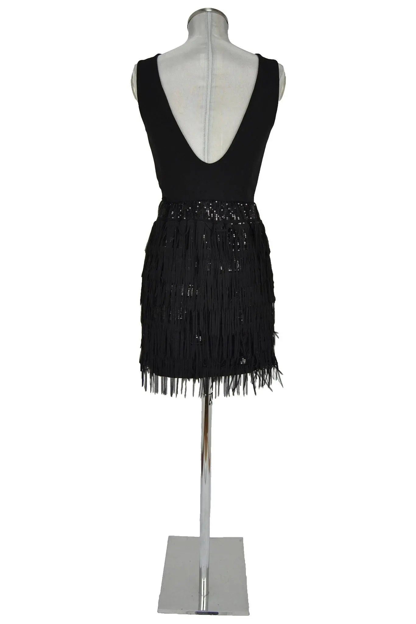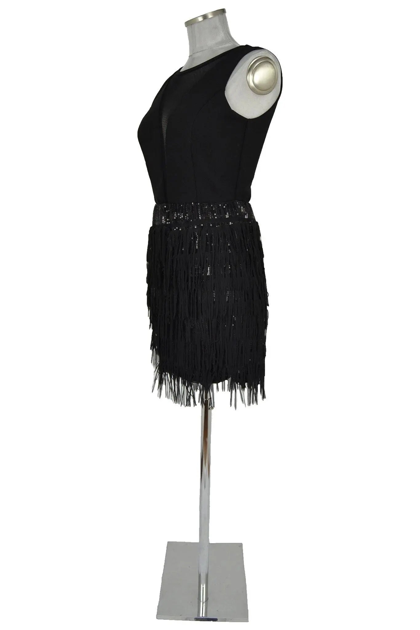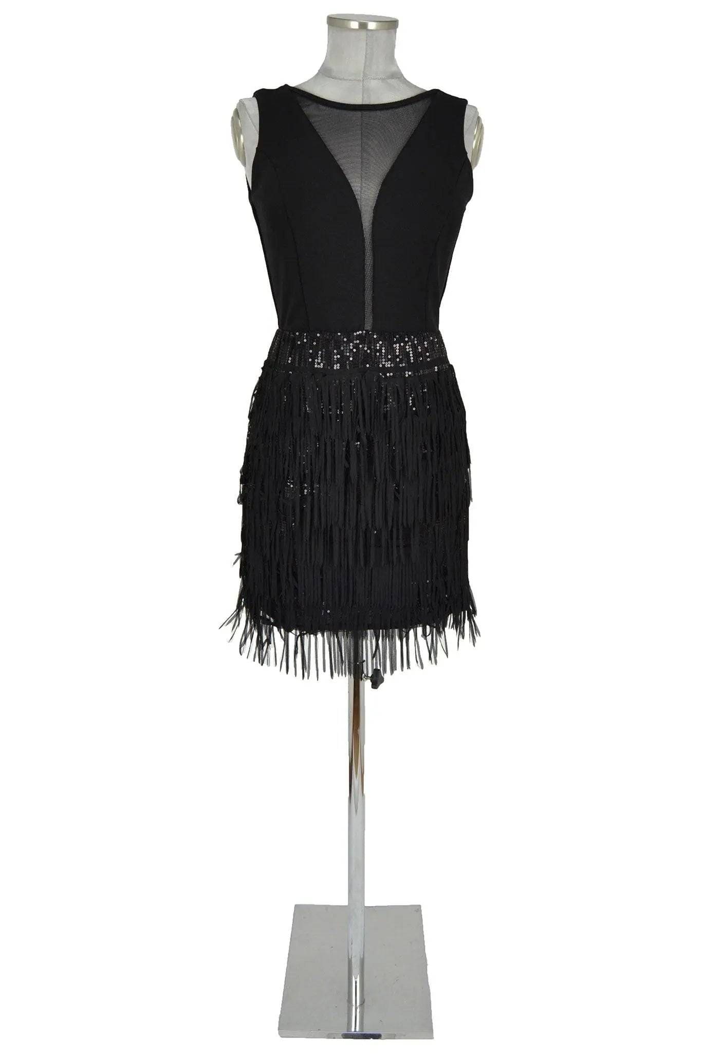 Noleggio Abito donna nero corto molto sensuale grazie all'abbinamento di diverse stoffe e tagli: il corpino ha una profondissima scollatura triangolare trattenuta da velo trasparente, la gonnellina tipo Charleston è tutta frange e paillettes. Per feste mondane, rappresentazioni teatrali, serate gothic.