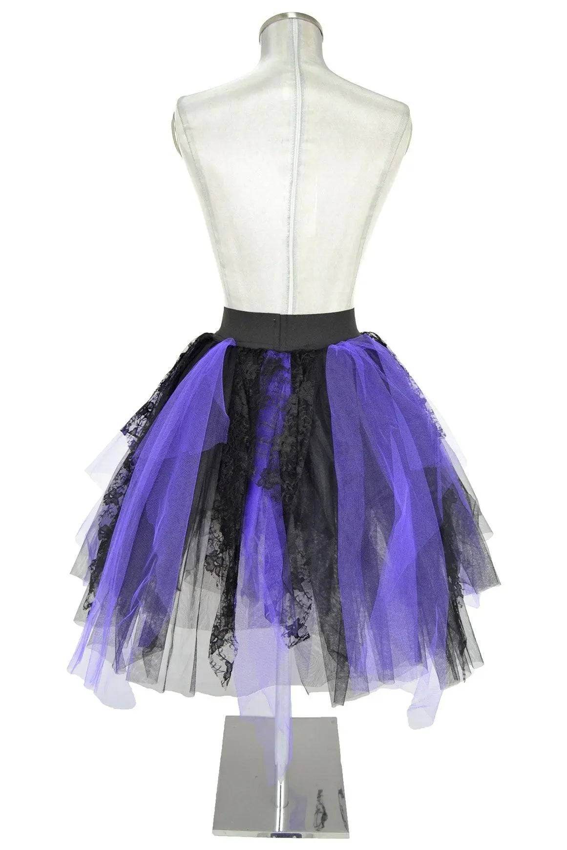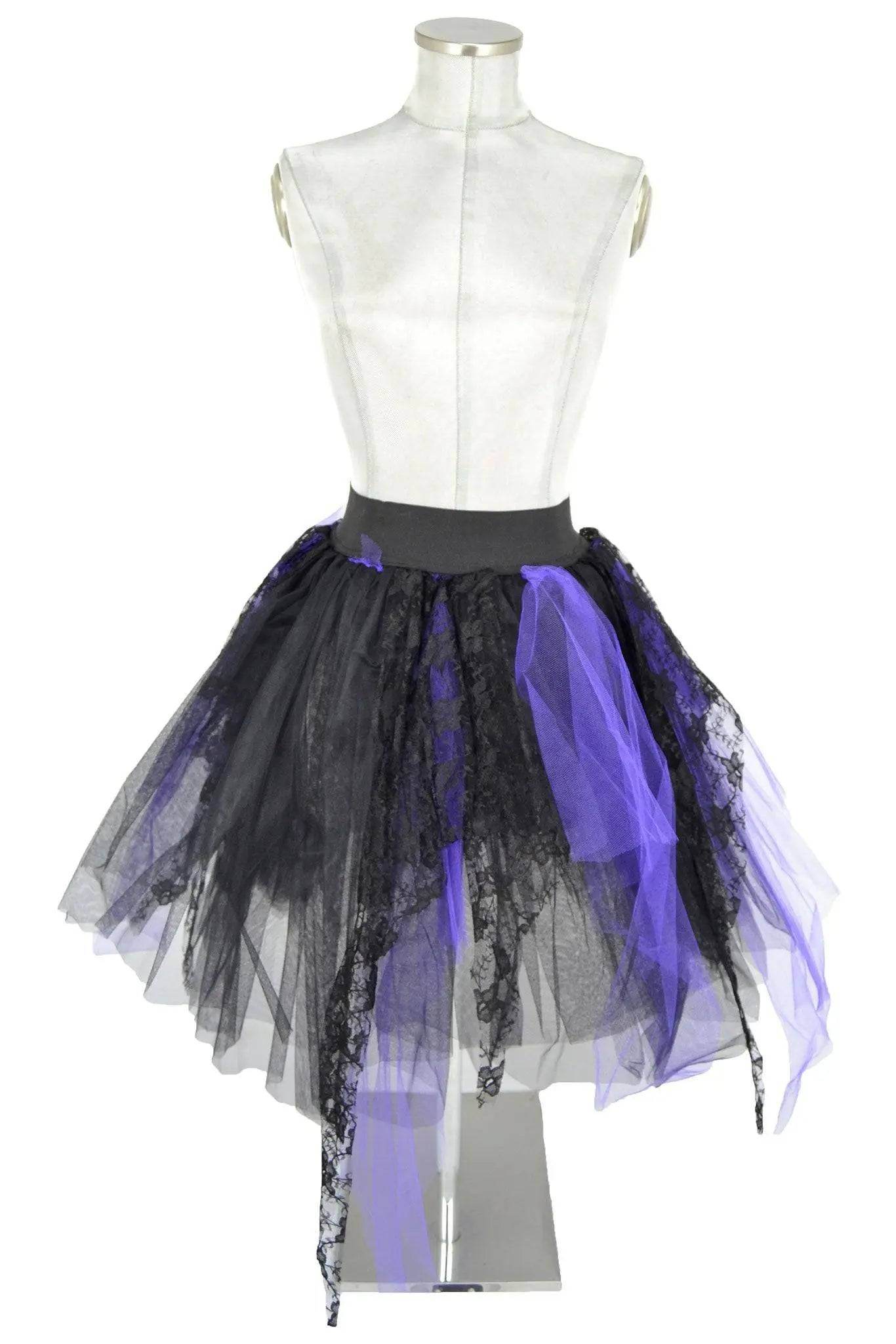 Noleggio abito con gonna-tutù di media lunghezza perfetta per feste di Halloween o Carnevale, interpretando personaggi di spettro, vampira, cartomante e simili. Alla fascia elastica in vita sono cuciti tre strati di tulle nero e viola, con suggestivi drappeggi e petali di pizzo nero a disegno floreale.