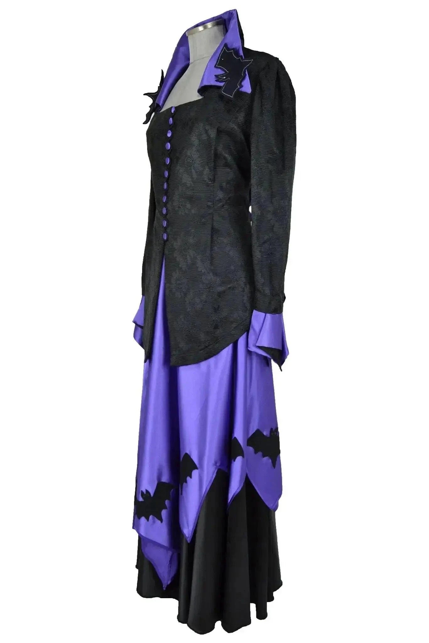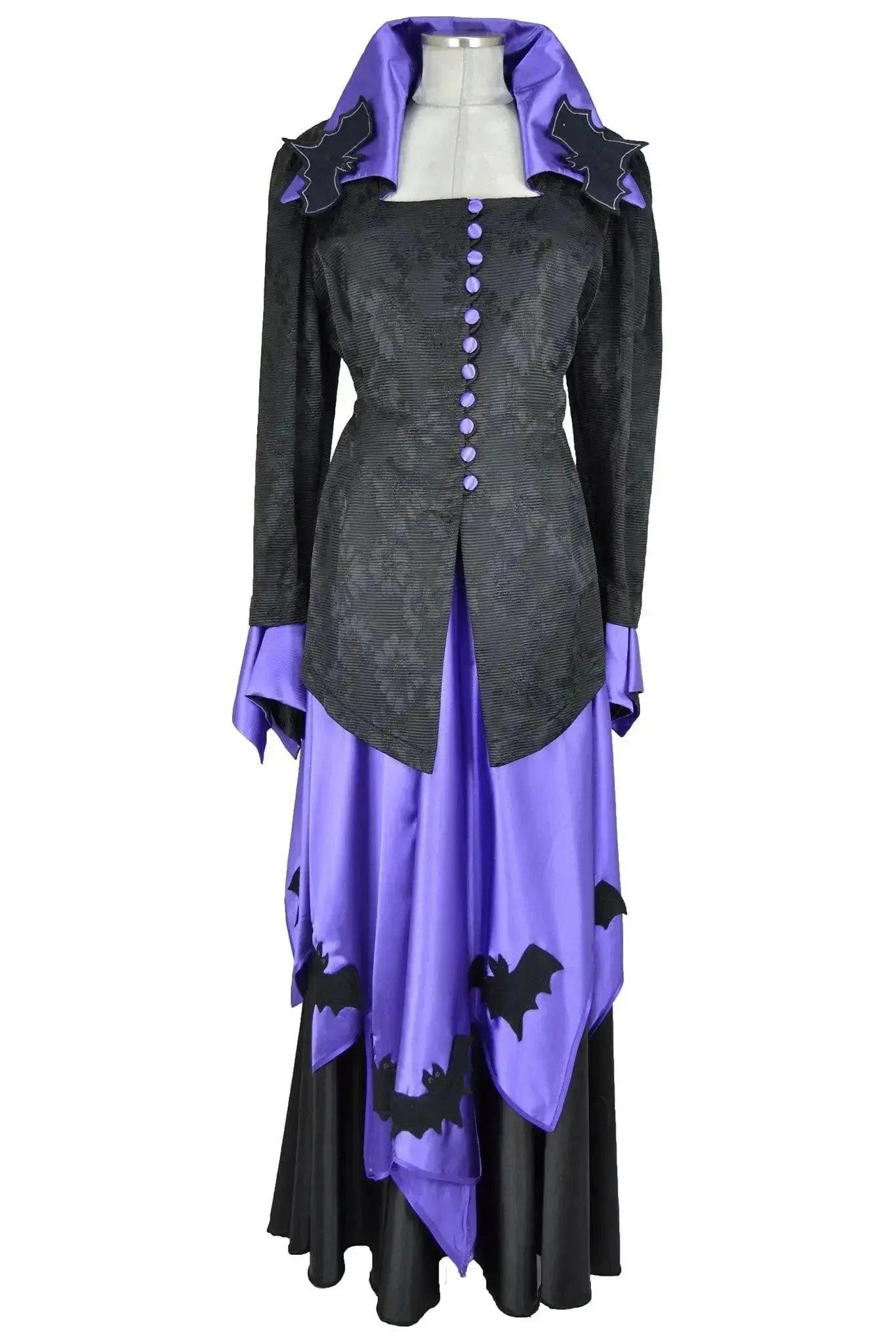 Il nostro "Noleggio Costume Strega Gotica Viola Donna - Eventi Halloween" è la scelta perfetta per chi desidera un look affascinante e misterioso durante le feste di Halloween o per eventi a tema gotico. Questo abito lungo, realizzato con tessuti di alta qualità, combina un design sofisticato con dettagli gotici che lo rendono unico e accattivante. La parte superiore dell'abito presenta un busto strutturato con bottoni e maniche lunghe che si allargano ai polsi, mentre la gonna lunga è decorata con eleganti pipistrelli neri su un fondo viola, aggiungendo un tocco di mistero e fascino.