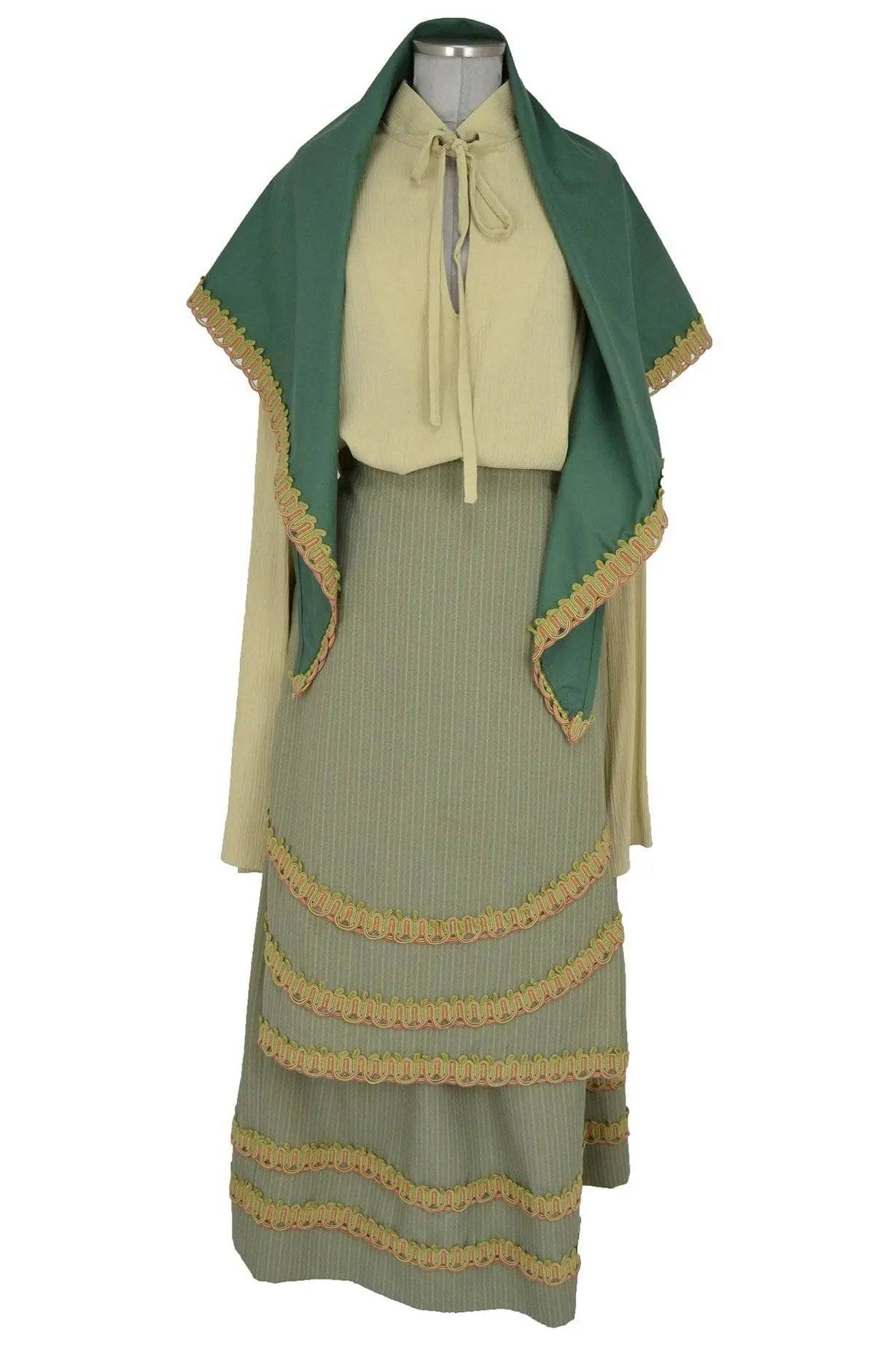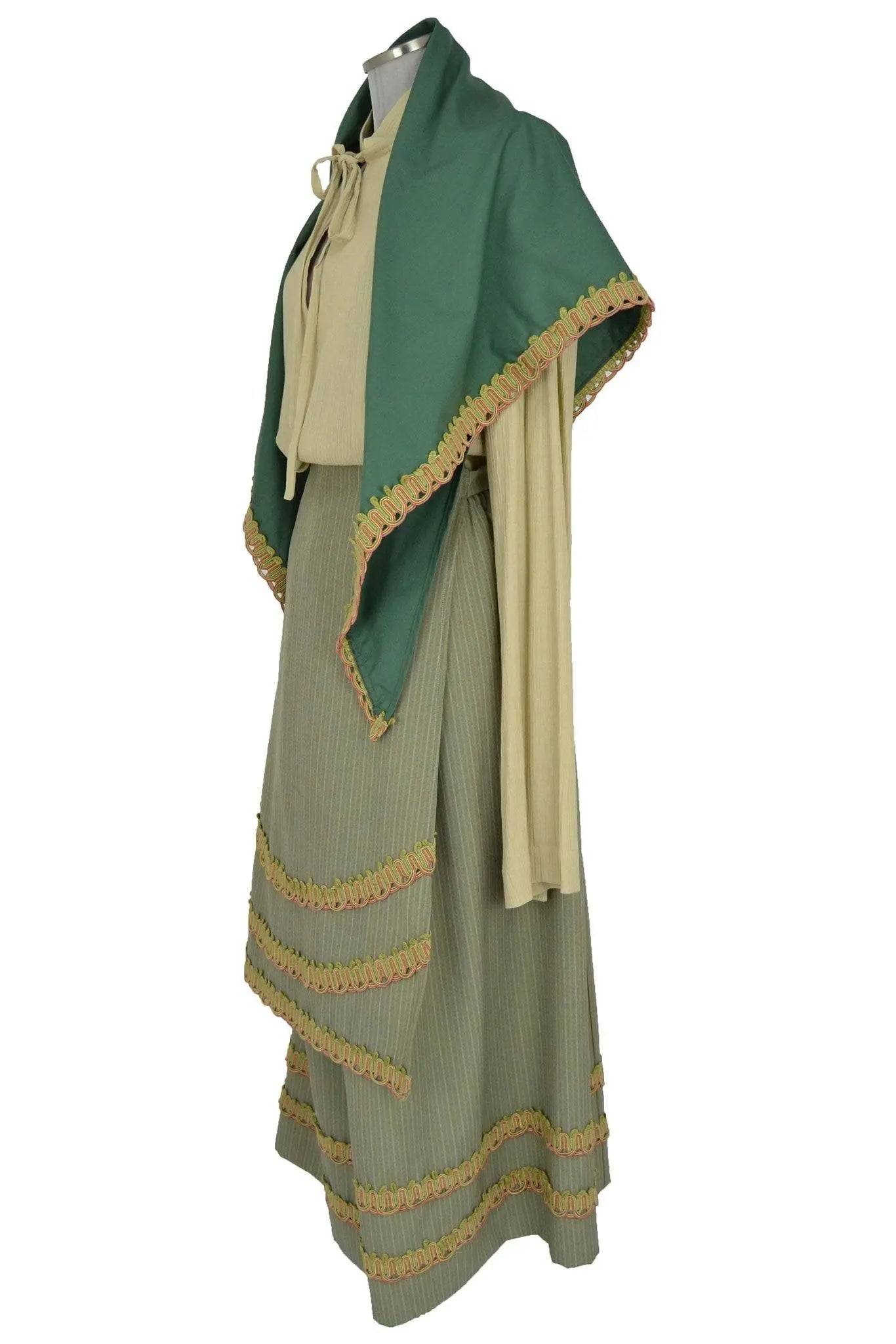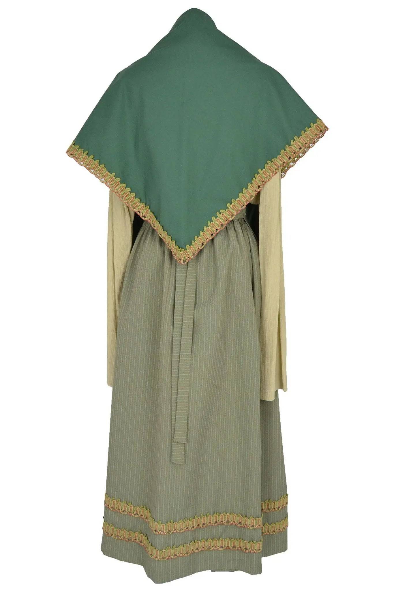 Noleggio abito donna di ispirazione popolare del '900 simile a molti costumi tradizionali italiani e stranieri; la camicia annodata sulla gola ha un collo particolare, la gonna e il grembiule a righine hanno bordure in passamaneria riprese anche dallo scialle in tinta. Adotto per presepe vivente o rievocazioni.