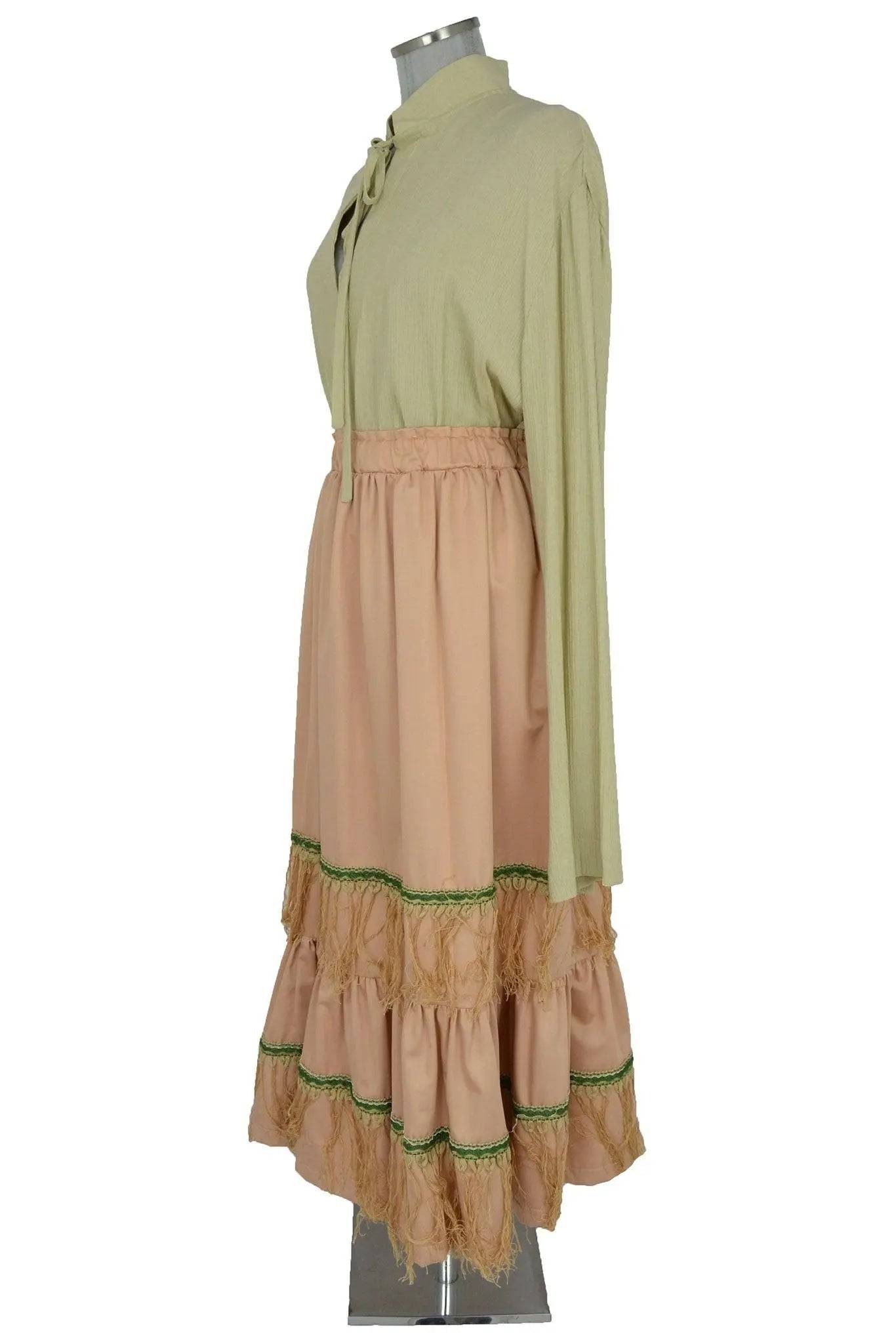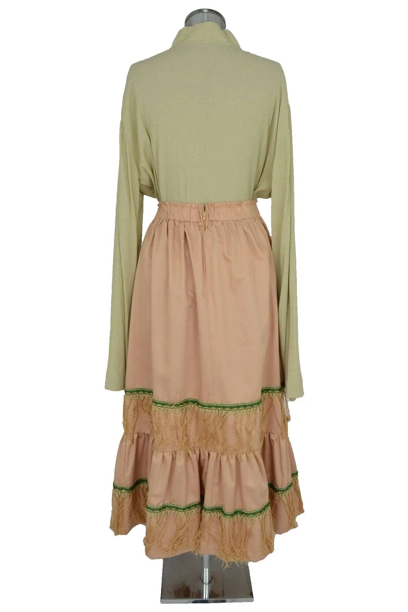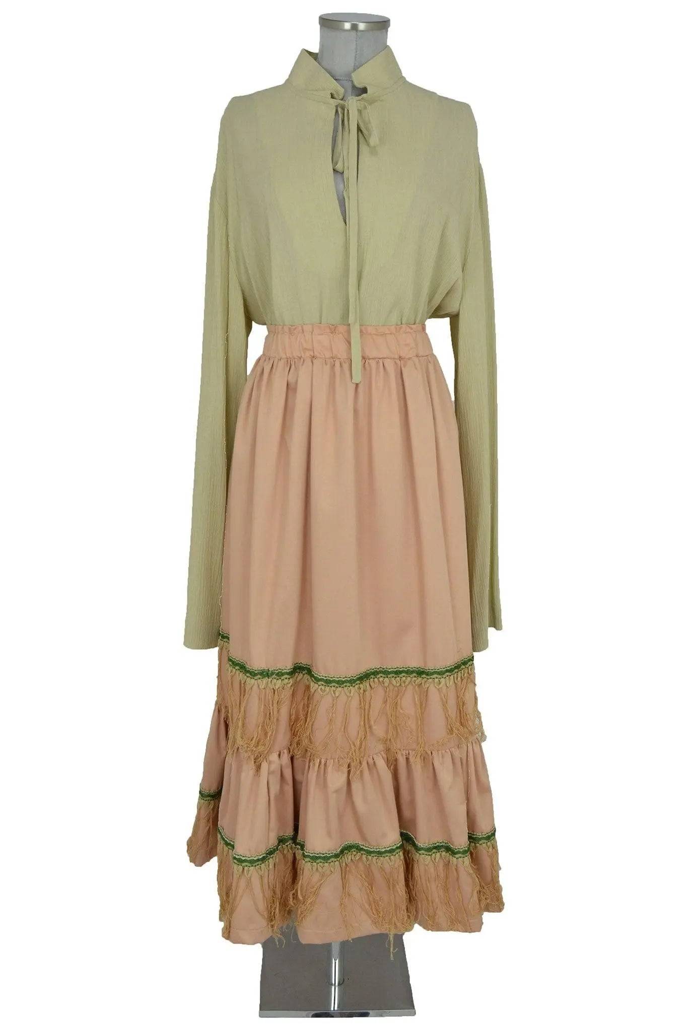 Noleggio Completo donna popolana o cameriera adatto soprattutto al '700 e '800, la blusa ha maniche diritte molto lunghe e allacciatura al collo (l'apertura è in stoffa doppiata); la gonna rosa antico ha un comodo elastico in vita, la balza a volant è sottolineata da frange colorate di sapore etnico.