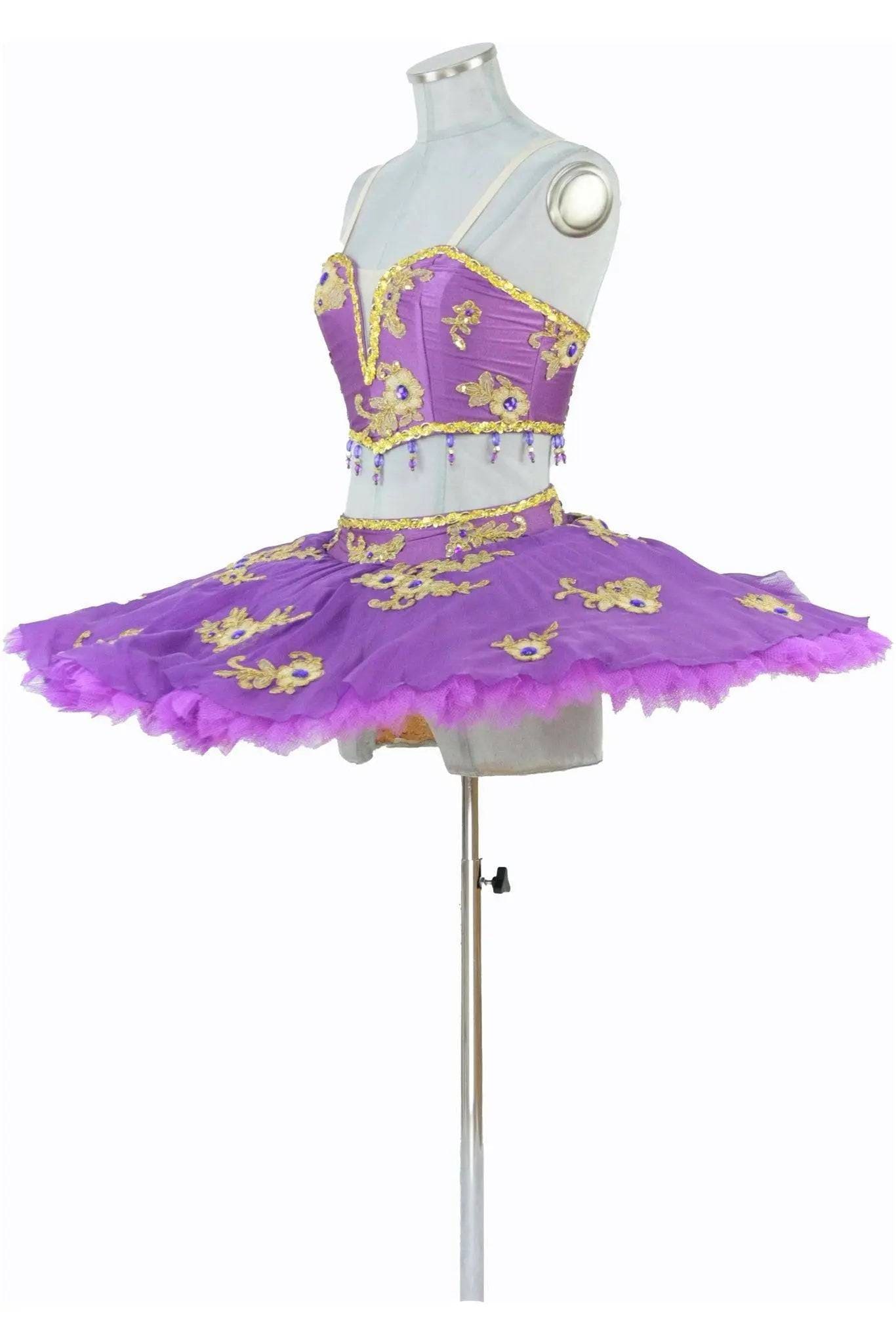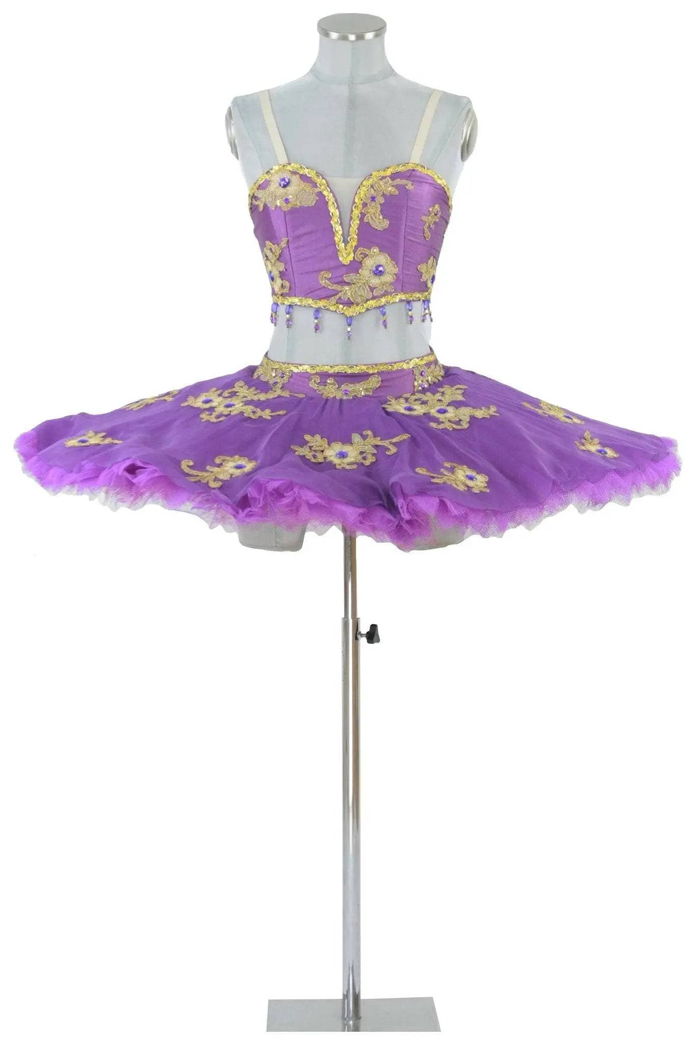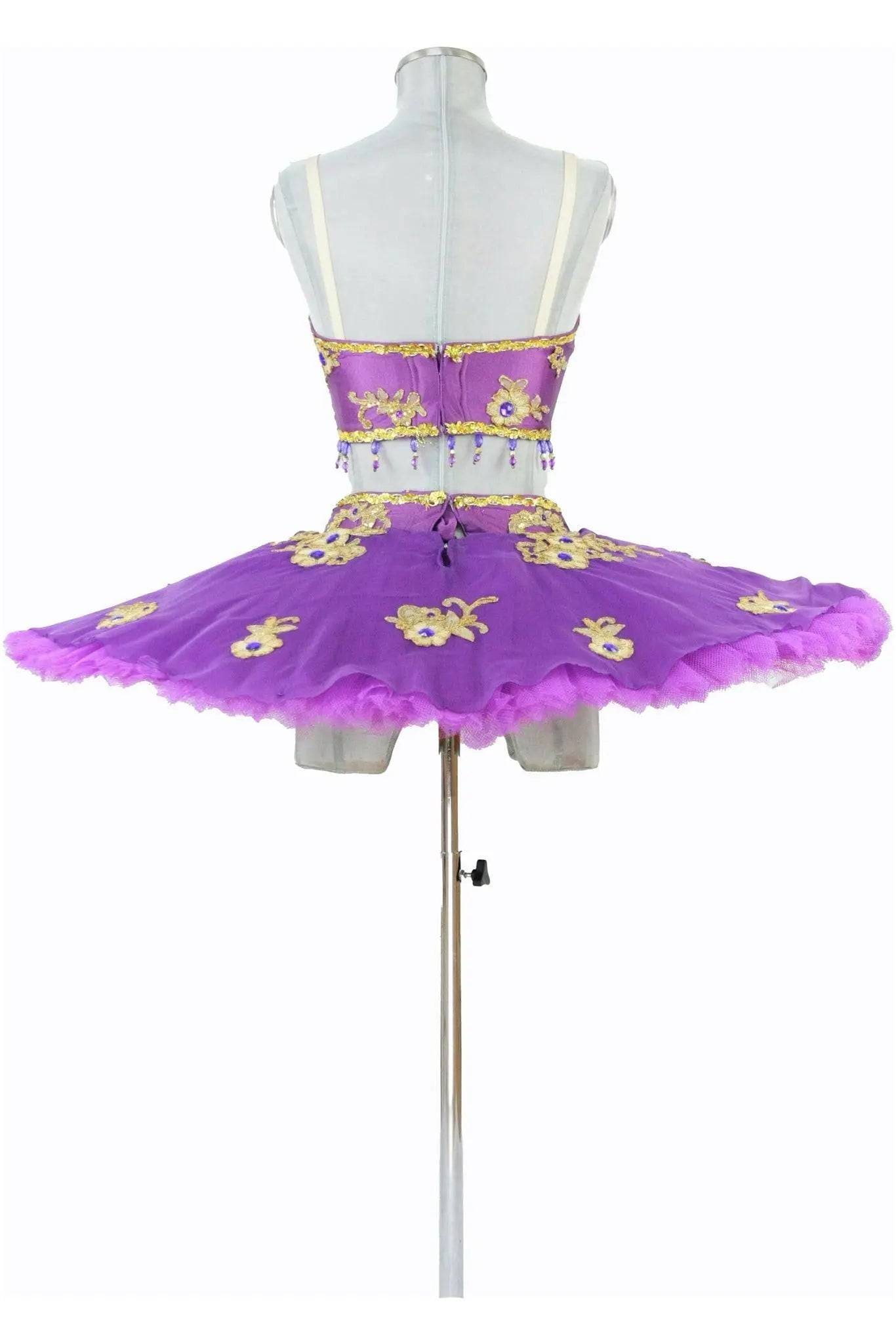 Stupendo tutù in due pezzi di sapore orientale, perfetto per le protagoniste di “Shéhérazade”, “La Bayadère”, “Il Corsaro”. L'ultimo velo della tutulette a piatto riprende i decori floreali oro e viola del corpino rigido, con spalline color carne e corto sotto il seno, profilato di perle a goccia.
