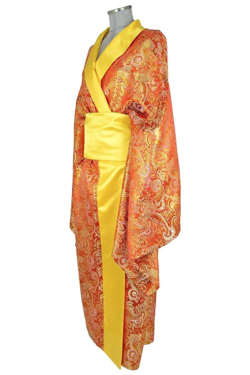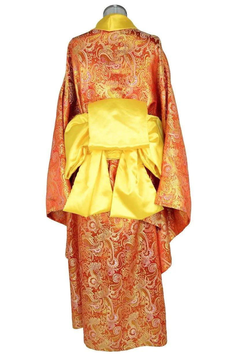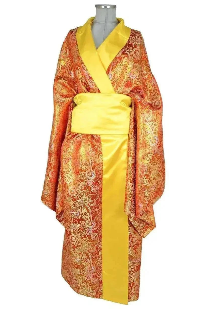 Realizzato con tessuti di alta qualità, l'abito si caratterizza per il suo design ricco e dettagliato. La stoffa, decorata con motivi orientali, conferisce al kimono una presenza scenica imponente, ideale per performance teatrali o eventi culturali. Il kimono è accompagnato da una cintura obi, che non solo accentua la figura, ma completa anche l'autenticità del look. La combinazione di colori vivaci e dettagli raffinati rende questo abito un capolavoro, perfetto per trasportare chi lo indossa e chi lo ammira in un'atmosfera esotica e affascinante.
