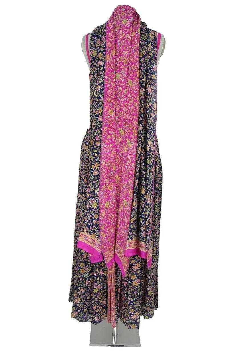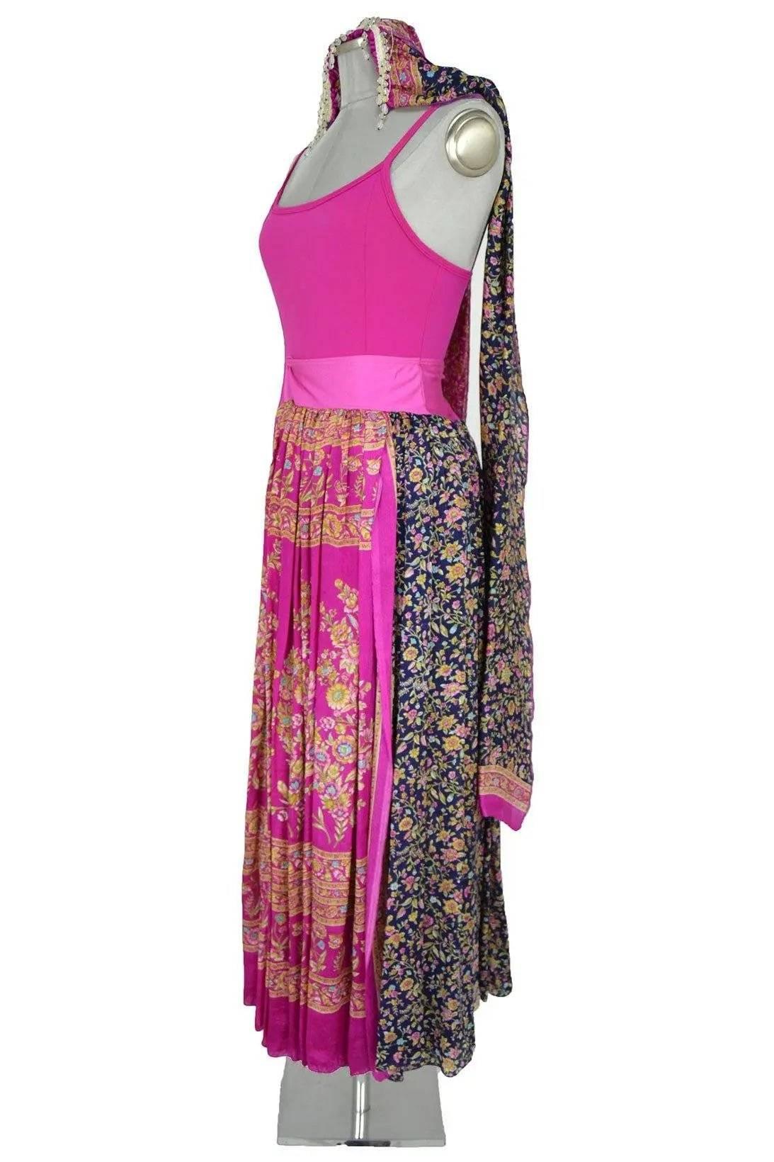 Noleggio costume donna baiadera o popolana orientale particolarmente adatto per balletti di danza, composto da body in lycra tinta unita e gonna lunga a pannelli in stoffa stampata a motivi floreali tipici indiani. Completa l'insieme un velo stampato floreale in tinta e orlato di minuscoli pendenti di perline.