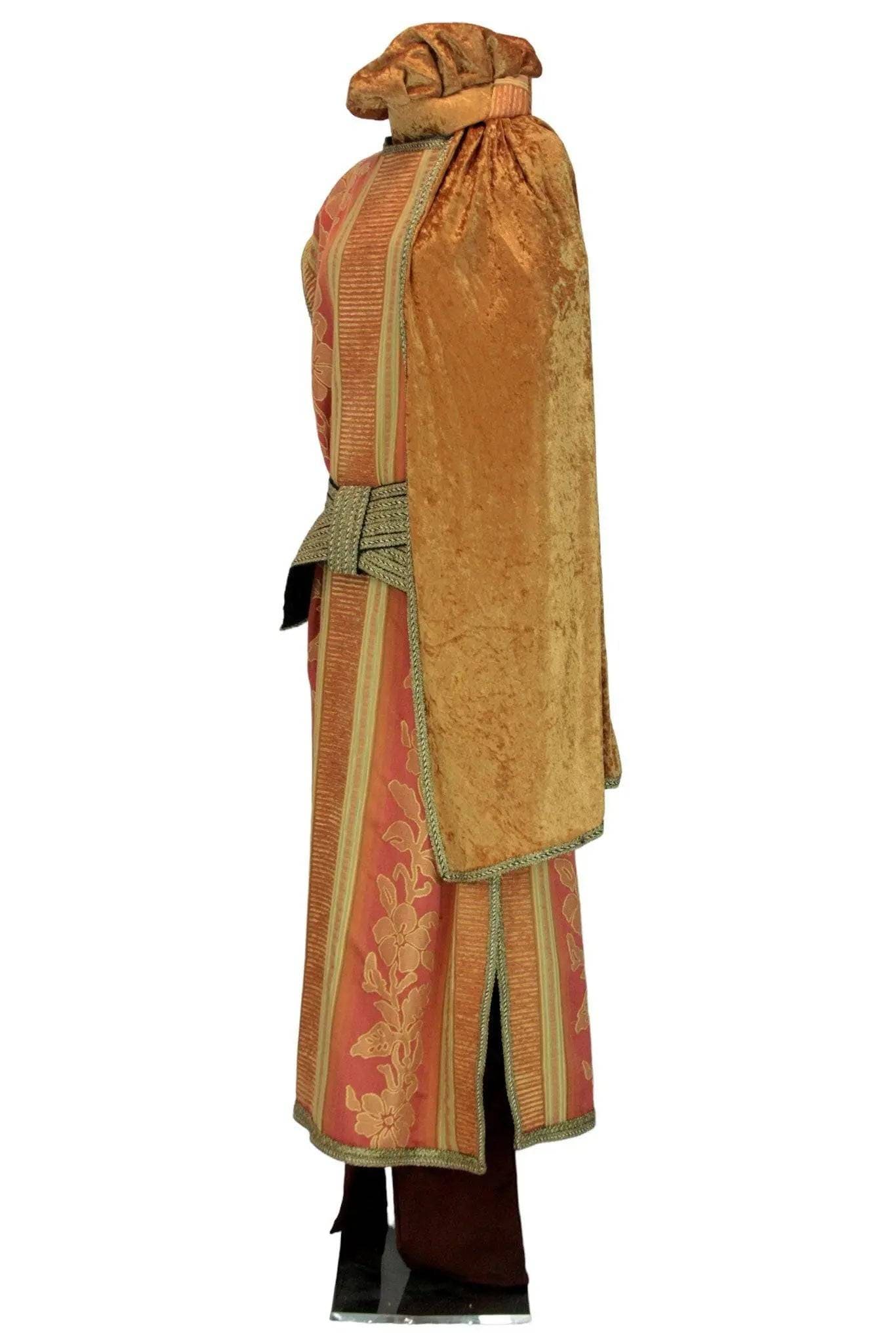 Noleggio Lunga tunica smanicata sui toni dell'ambra e dell'oro, di taglio diritto, costruita su stoffe tinta unita e a motivi floreali, con scollo a barchetta, bordure in passamaneria dorata e alta cintura con nodo. Da indossare con brache in tinta o calzari, e berretto o turbante di velluto in colore coordinato.