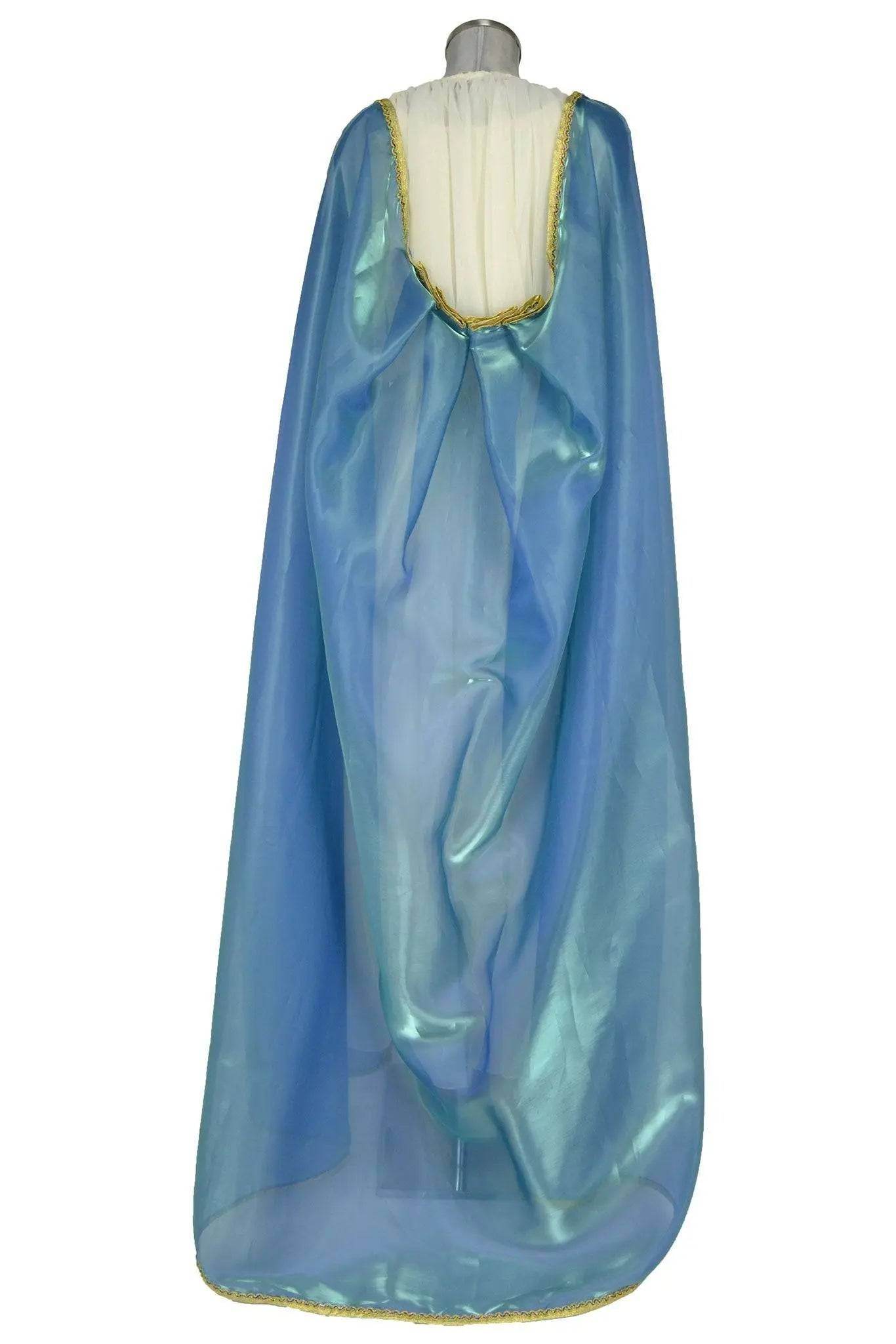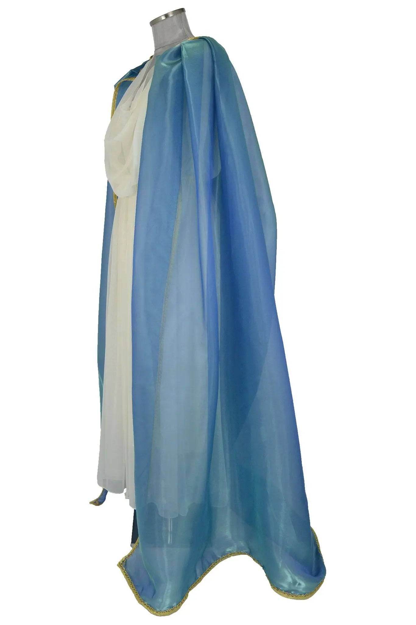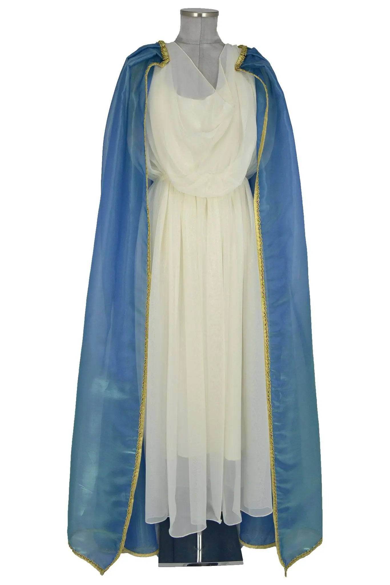 Noleggio Abito di scena donna come antica Principessa o Divinità per rievocazioni storiche. Bianco a doppio strato, quello superiore è in leggero velo drappeggiato sulla sottotunica più corta; si completa con un mantello pure di velo, blu a bordure oro. A seconda degli accessori potrà caratterizzarsi come una divinità o principessa antica, oppure uno spirito o un essere fatato.
