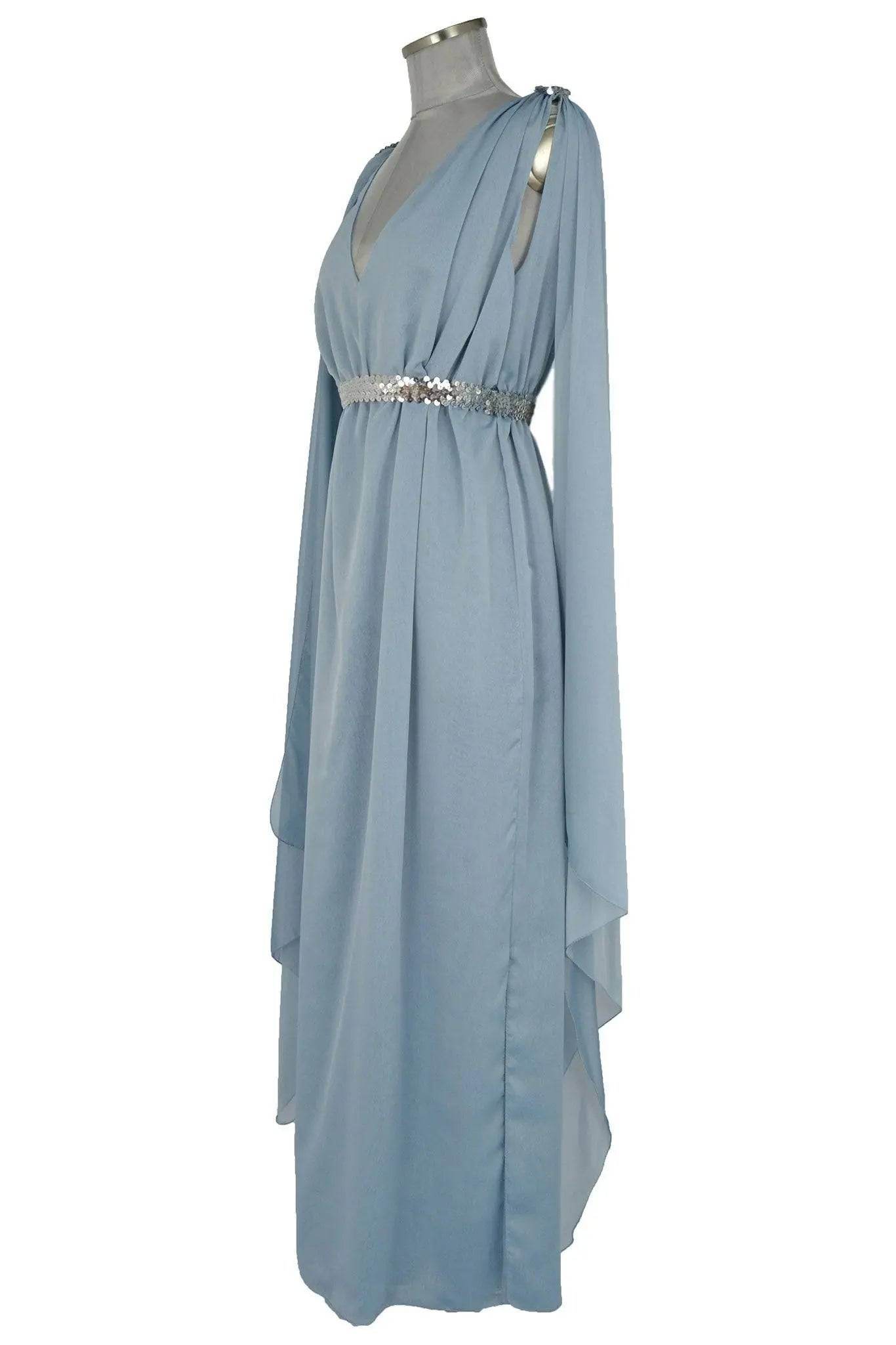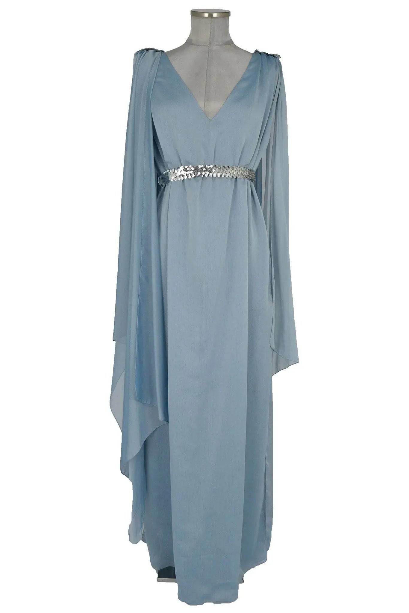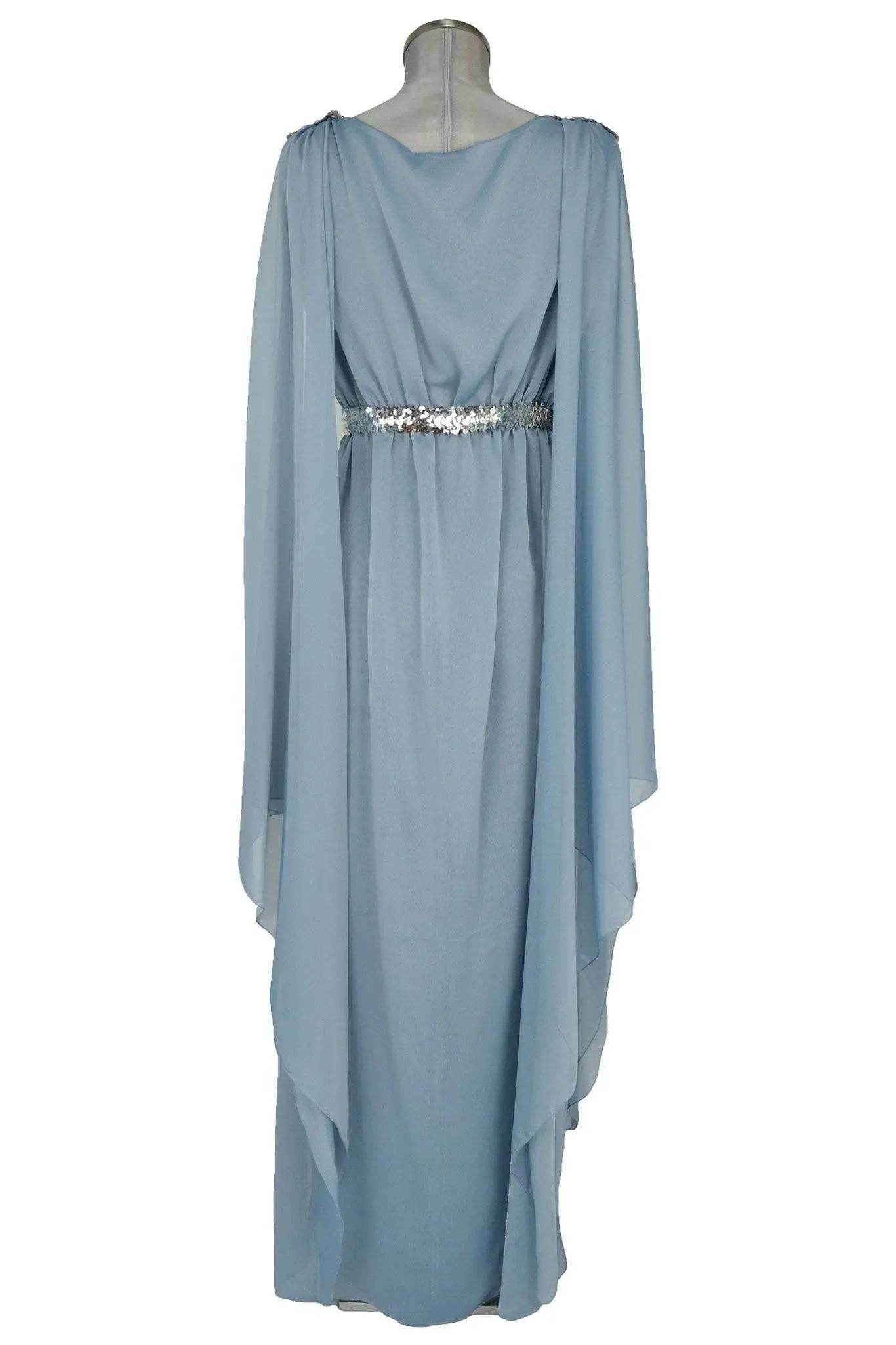 Noleggio bellissimo abito lungo di scena donna in stile divinità greca, ma di linea più moderna. Il delicato celeste del tessuto leggerissimo si abbina alla perfezione con la cintura di paillettes argento. Le caratteristiche salienti sono l'insolito scollo a V e i pannelli di tessuto che ricadono dalle spalle.