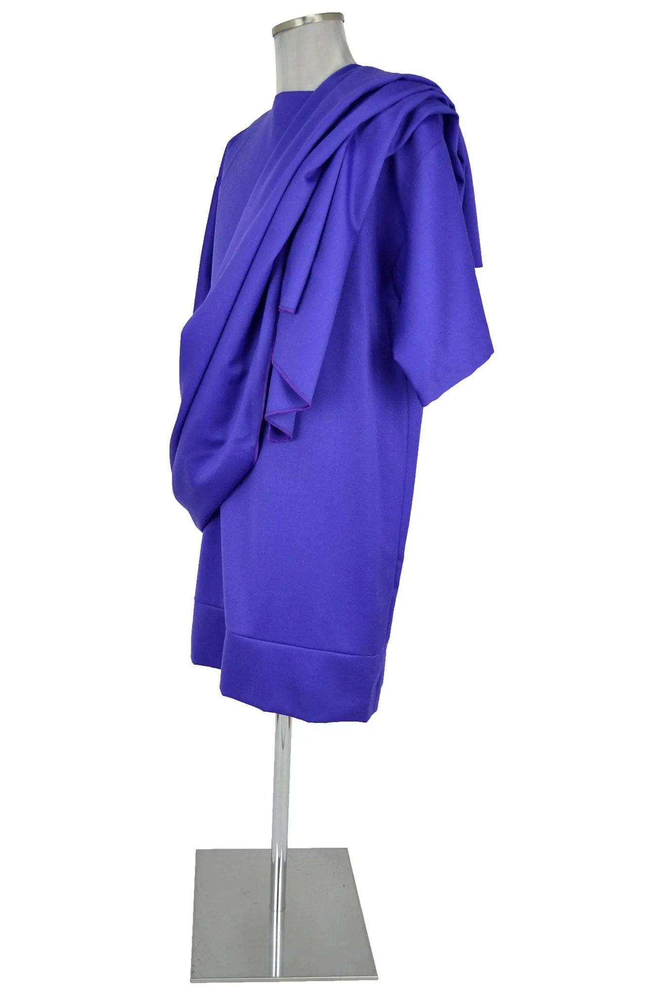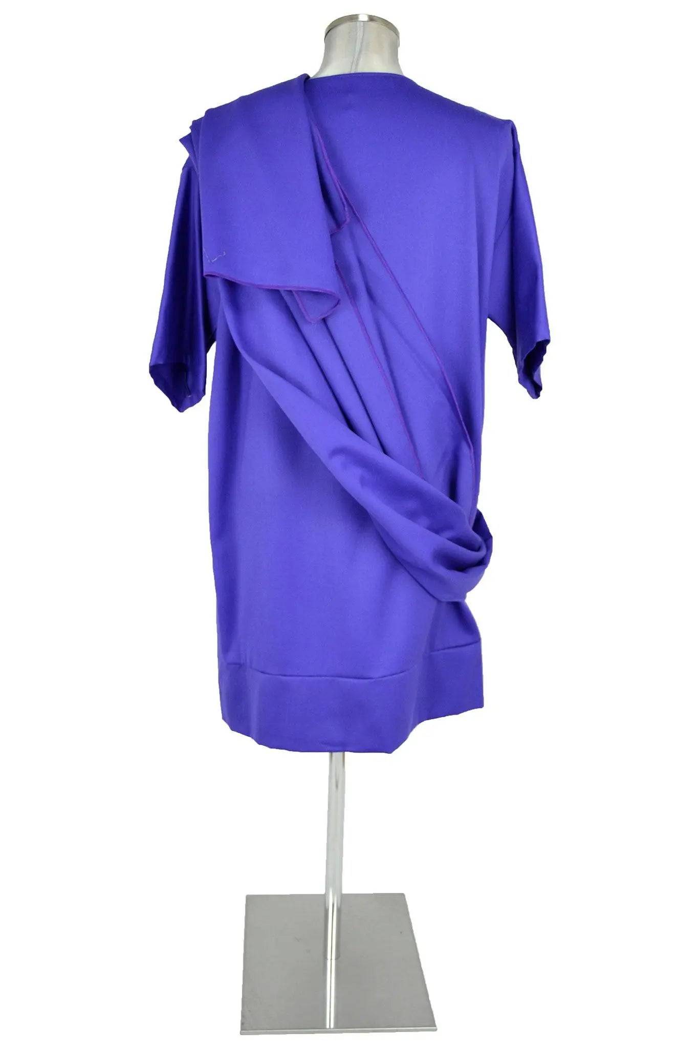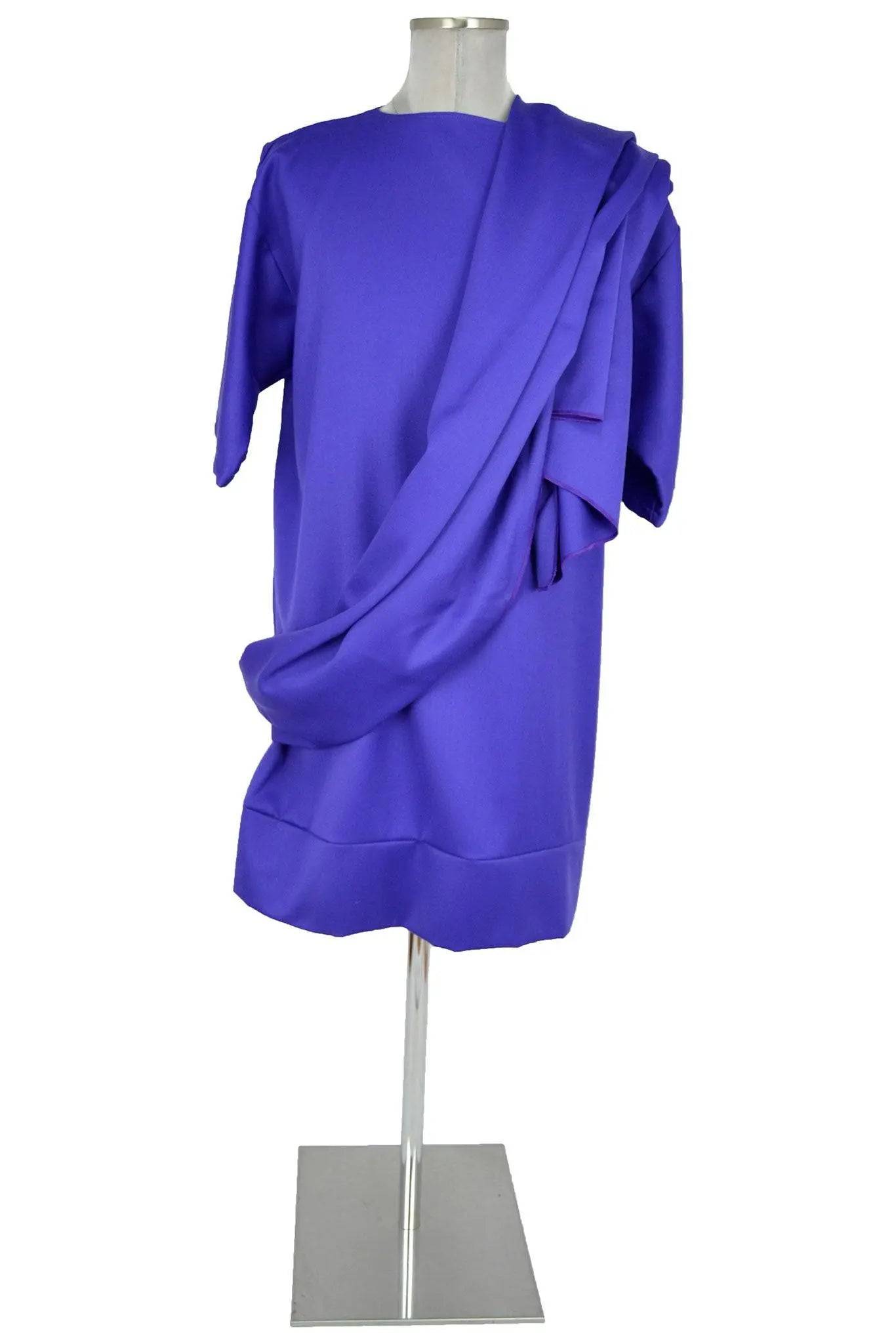 Tunichetta corta con maniche a tre quarti, spalla scivolata e alto bordo cucito che contiene la svasatura della gonna. Il colore gioiello la rende adatta a personaggi moderni come rockstar o soubrettes, con accessori vistosi (gioielli, calzature luccicanti) diventa un bellissimo abito da sera.