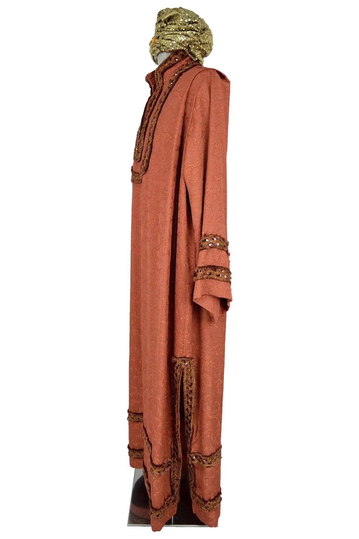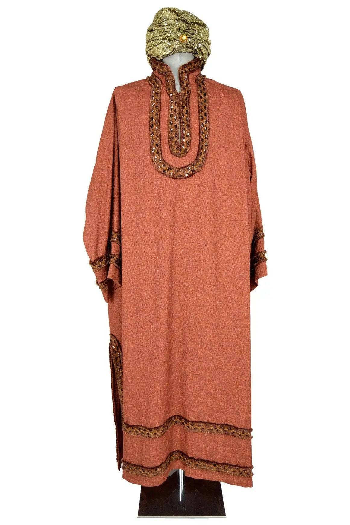 Costume in stile arabo-orientale, perfetto per rappresentazioni della Passione o Presepe Vivente, cortei dei Magi, rievocazioni storiche. Il camicione in stoffa jacquard arabescata ha spacchetti laterali, collo alto, bordure luccicanti. Completo di turbante in tessuto dorato con gemma centrale.